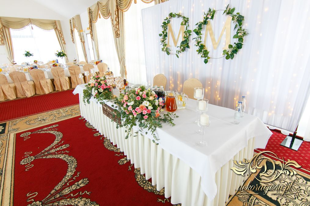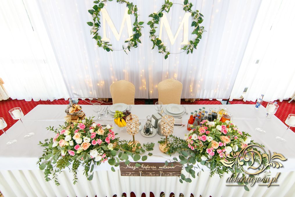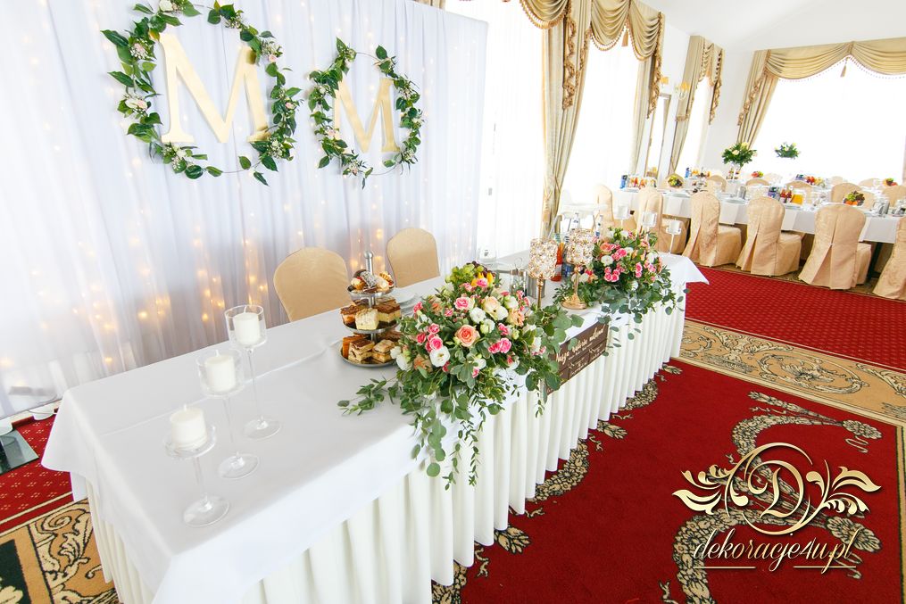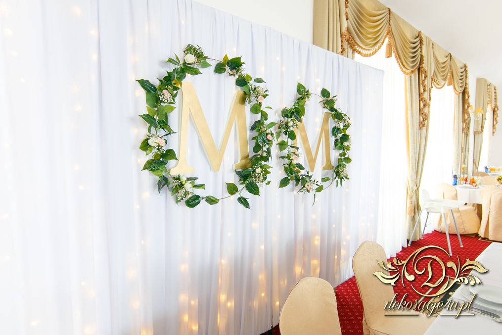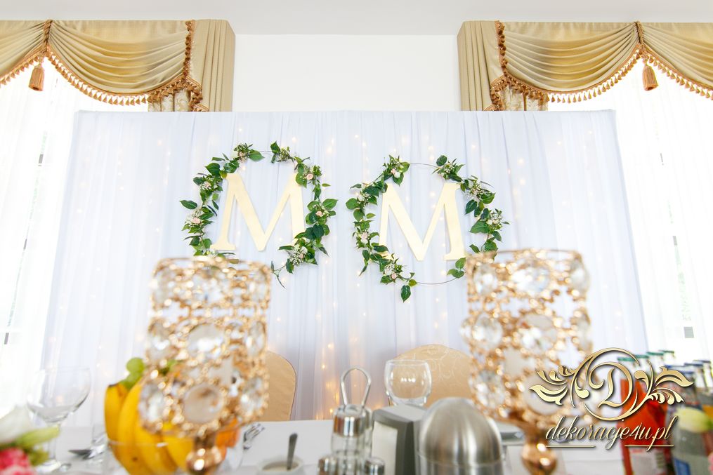 Biała ścianka z kołami ruskusowymi wraz z złotymi inicjałami. Całość wyglądała ślicznie.
