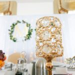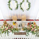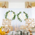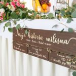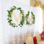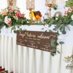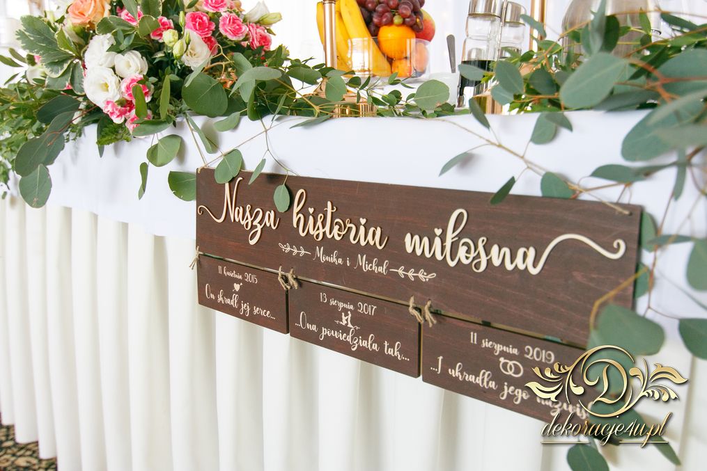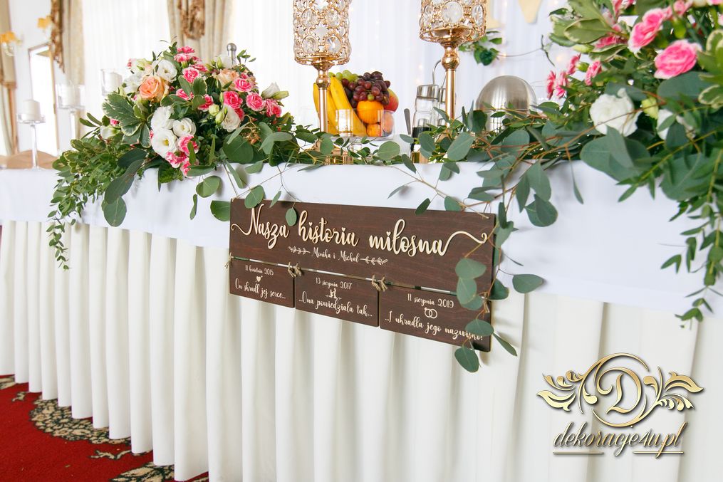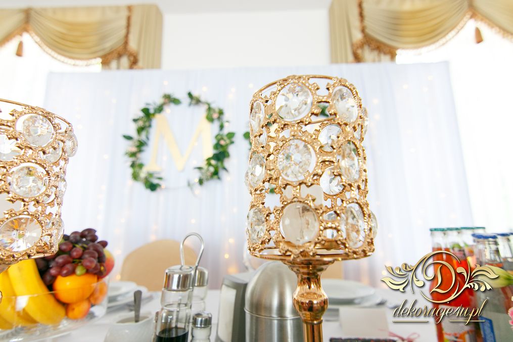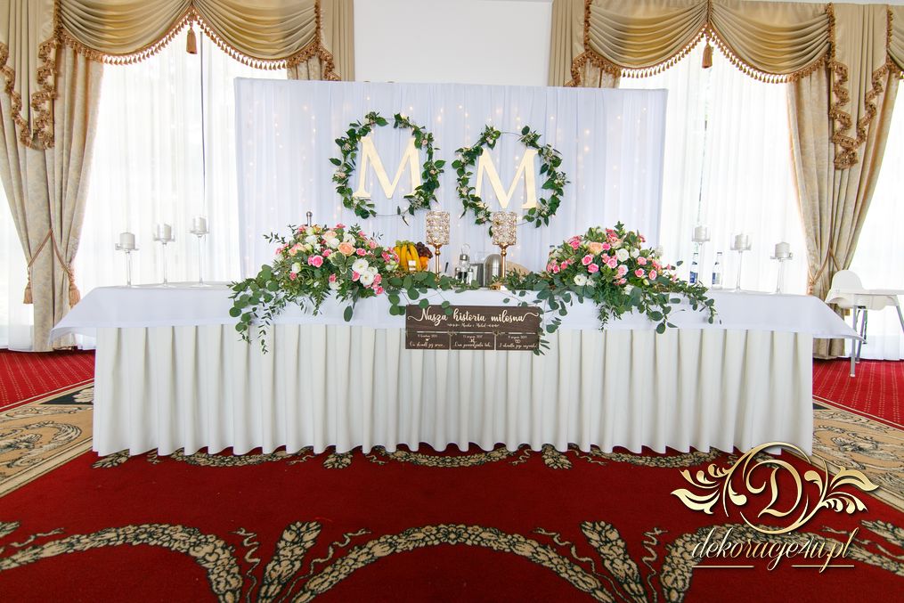 Biała ścianka z kołami ruskusowymi wraz z złotymi inicjałami. Całość wyglądała ślicznie.