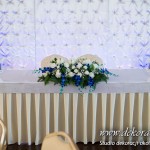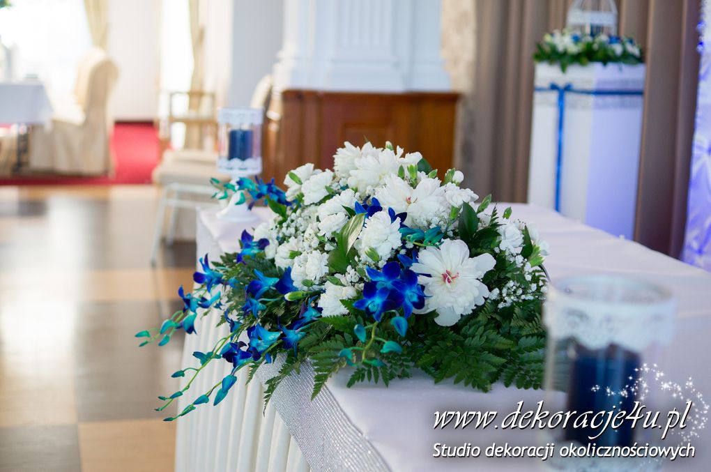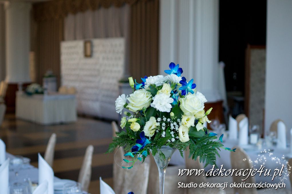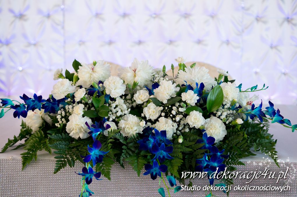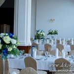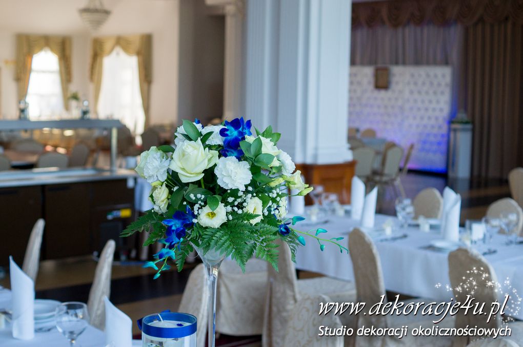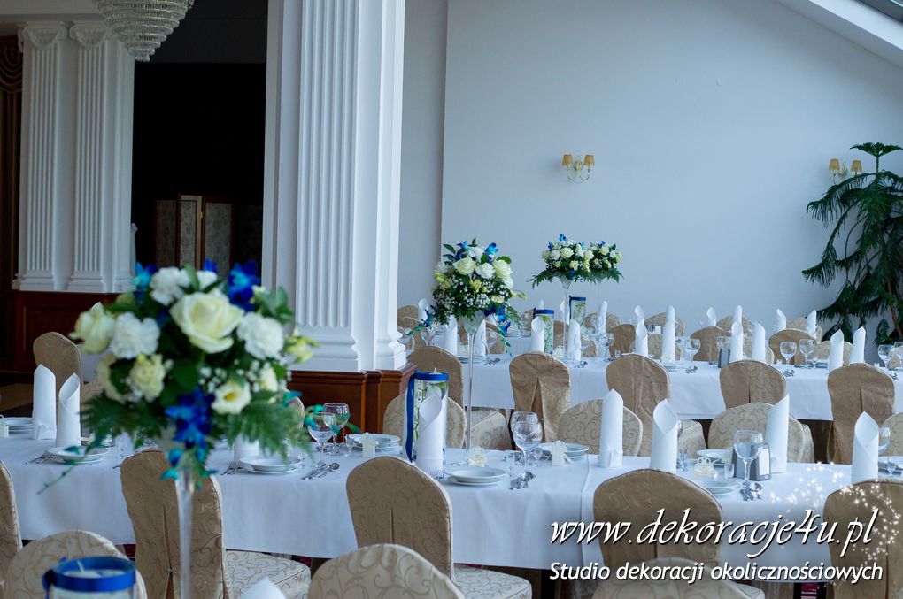 Kolejny raz mieliśmy przyjemność gościć w Hotelu Łańcut - tym razem dekoracja w kolorach granatu - ciemno niebieski i bieli. Bukiety na stoły z ciekawym wykończeniem - niebieski storczyk oraz tuby z zatopionym storczykiem i pływak. Dekoracja Prezydium to ciekawa ścianka z pikówki i obok postumenty z wianuszkami i lampion. Wszystko utrzymane w elegancji i kolorystyce dekoracji.