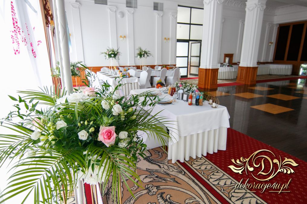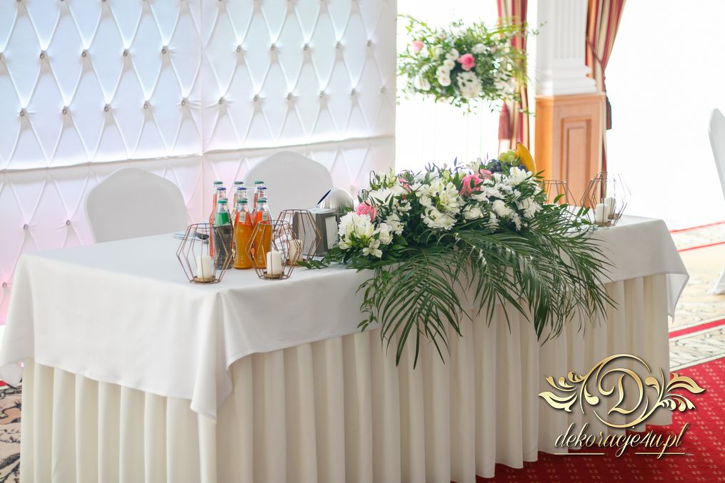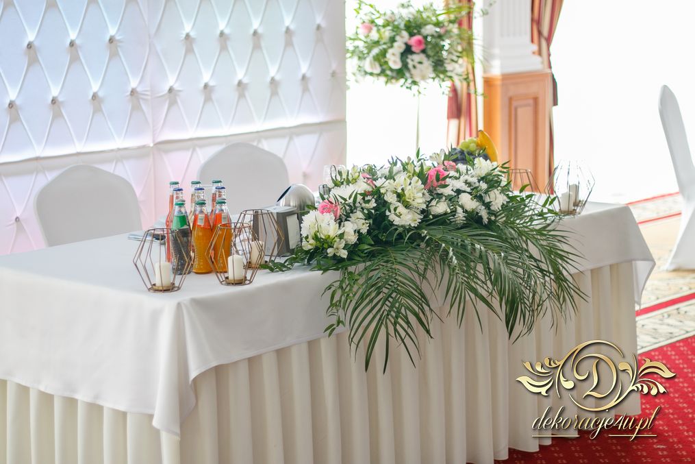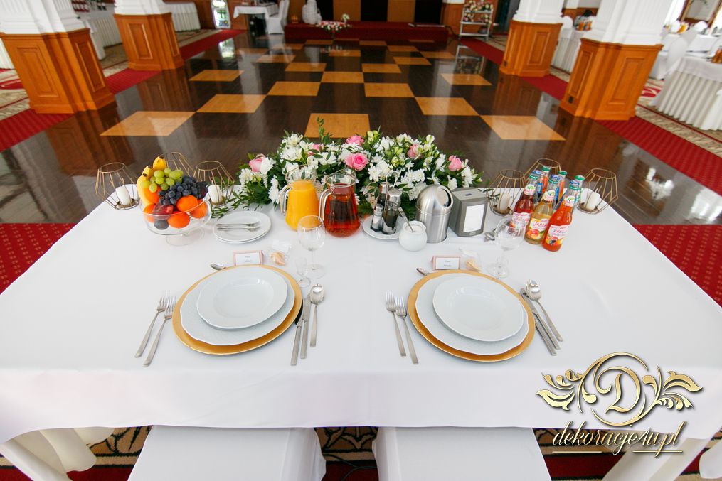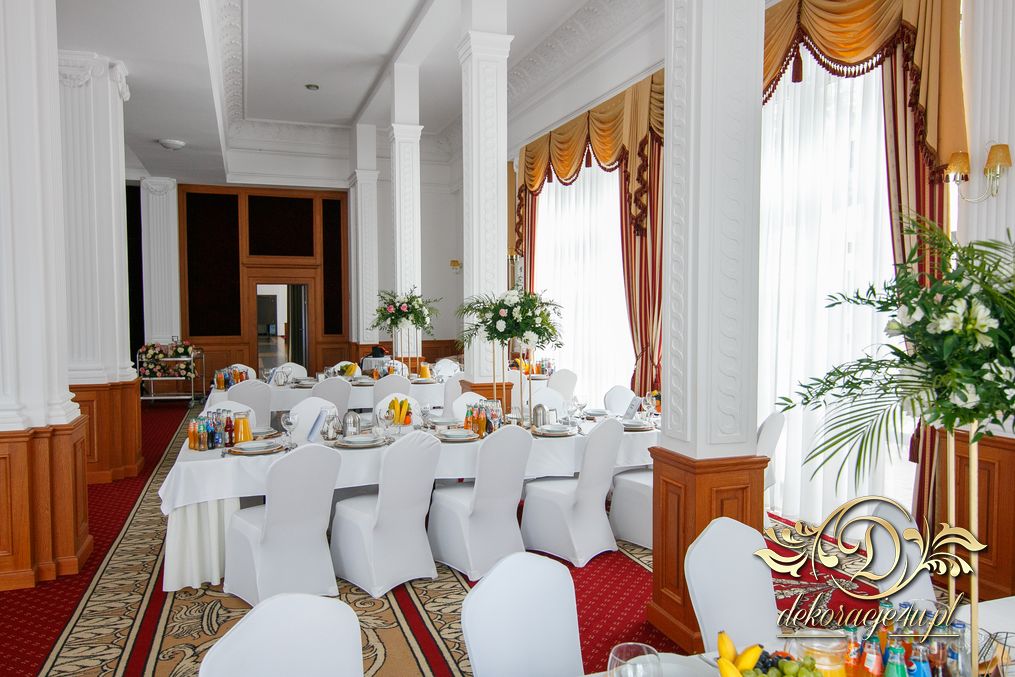 Kolejna dekoracja w Hotelu Łańcut - złote podtalerze, ścianka pikowana, piękne bukiety - wszystko na zdjęciach poniżej.
