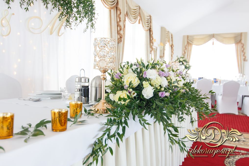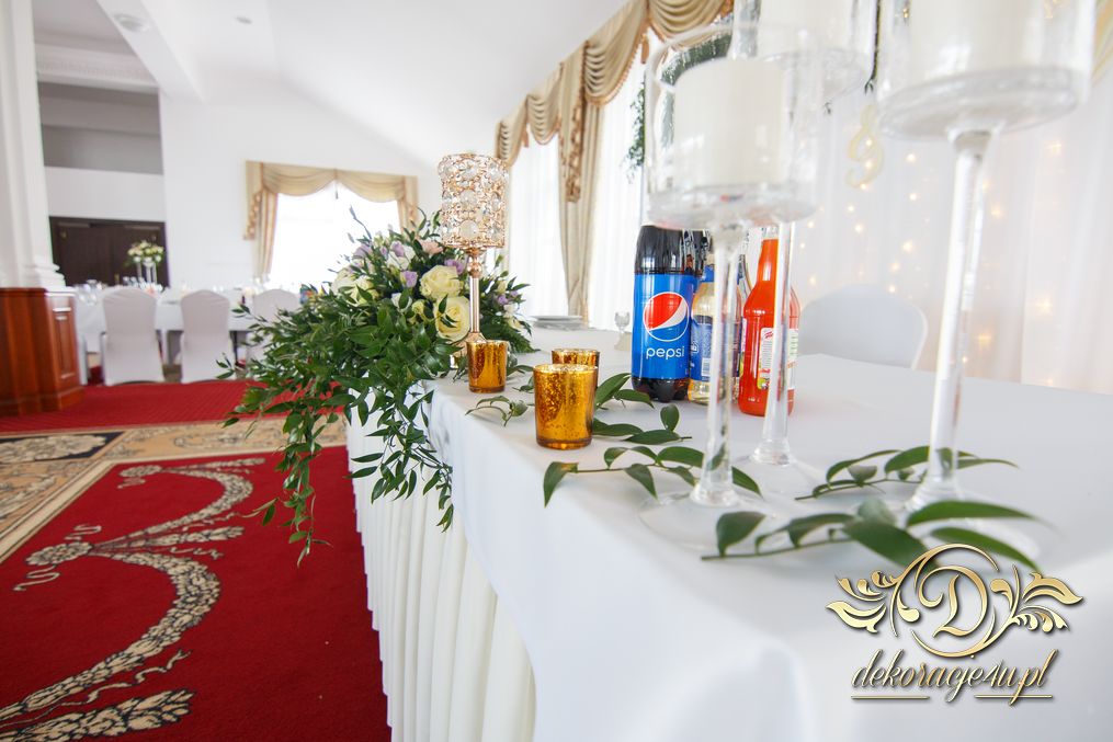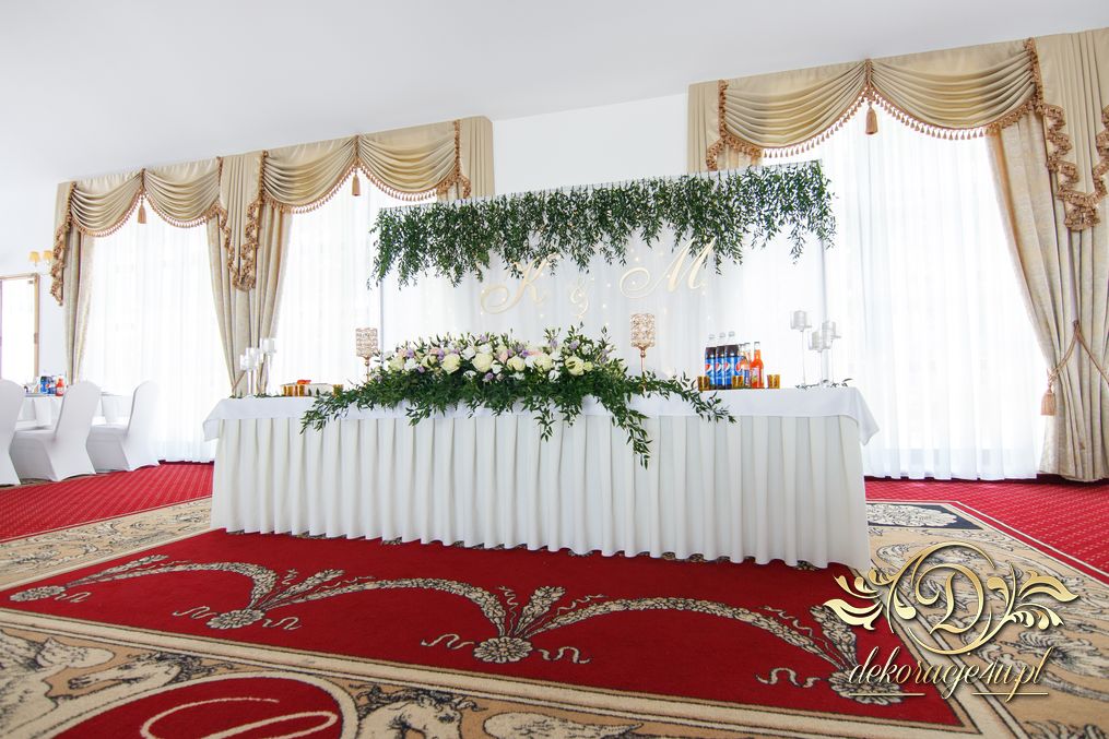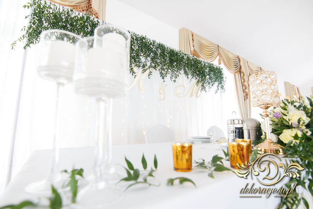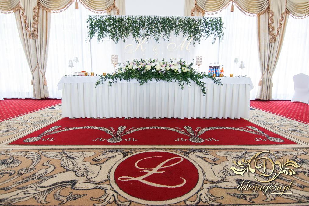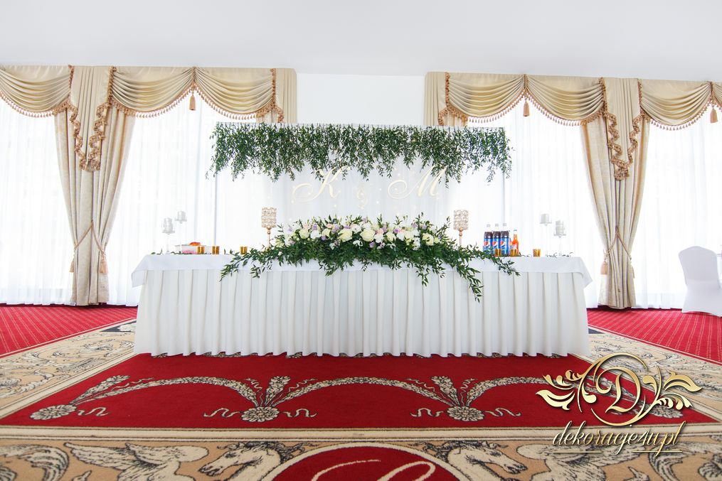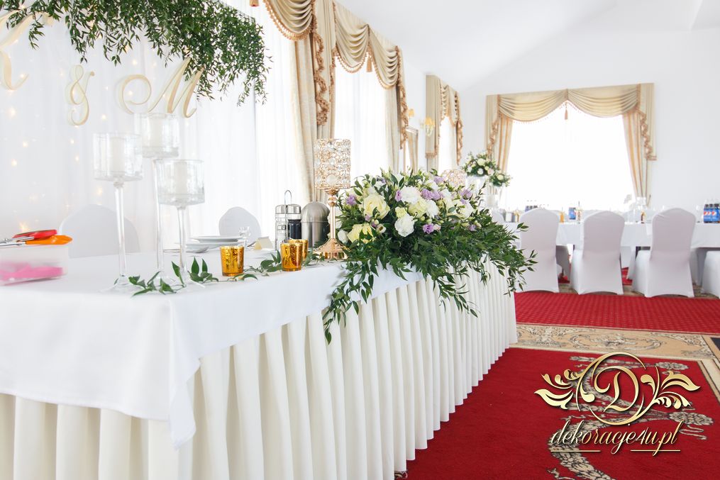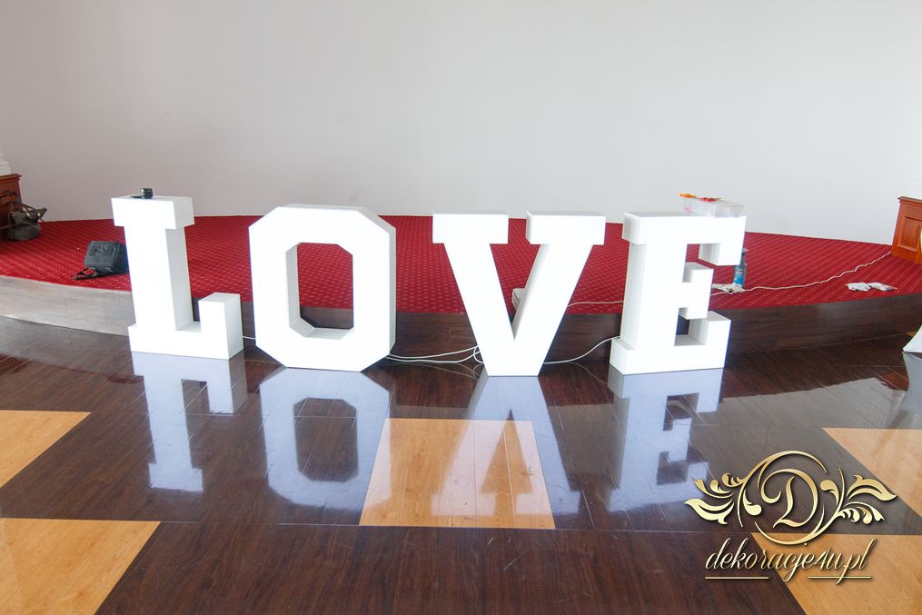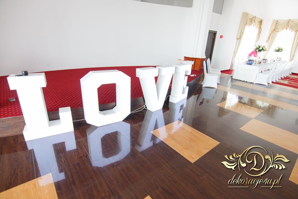 Ruskus w roli głównej kolejny raz. Piękny stół dla Młodej Pary i bogata ścianka. Na stołach dla gości świece i bukiety na wazonach. A pod sceną, gdzie orkiestra będzie wydobywała dźwięki dla gości wielki napis LOVE LED.