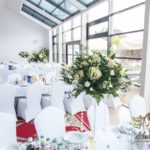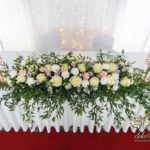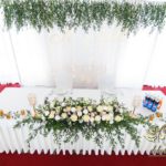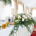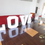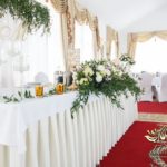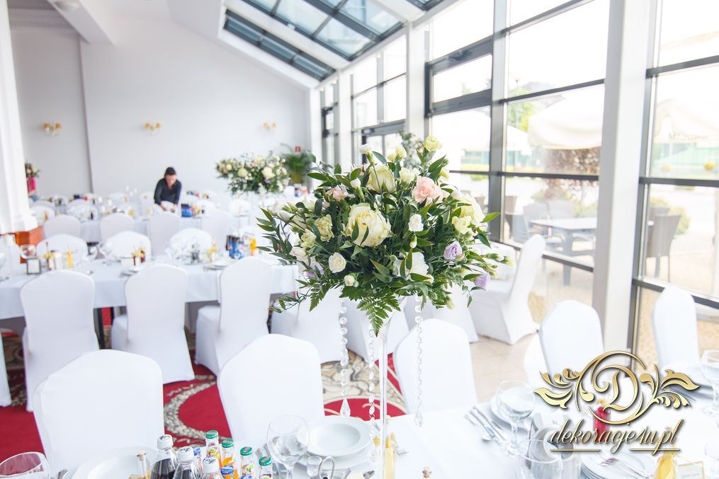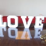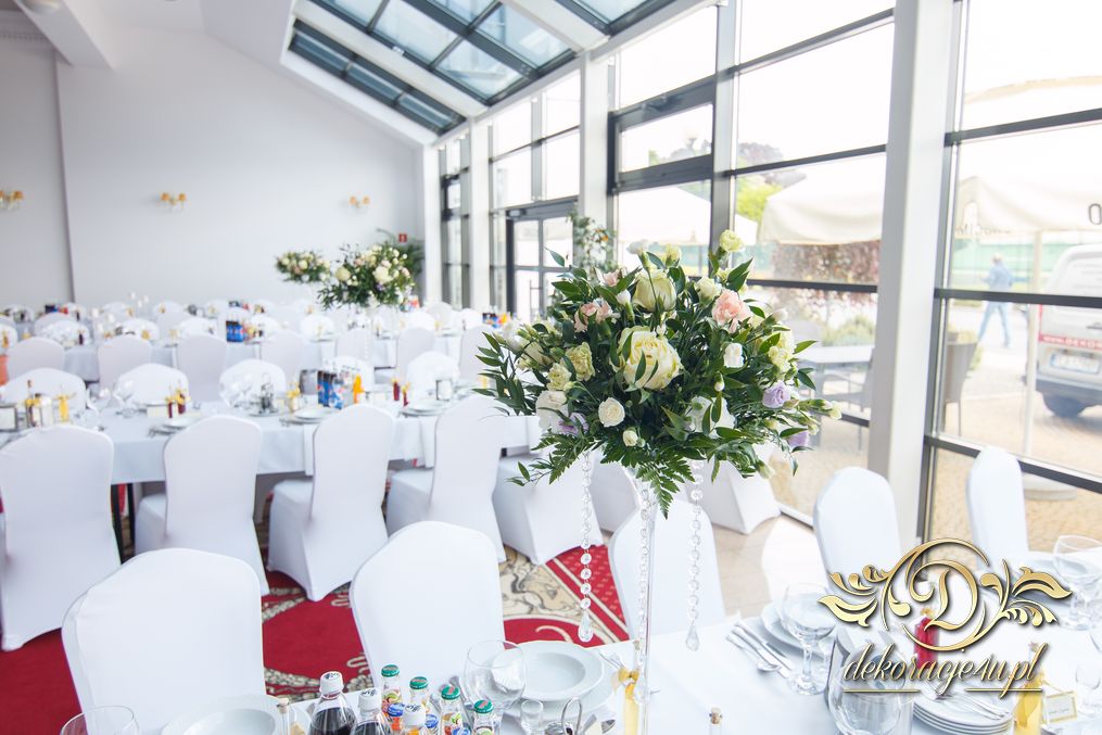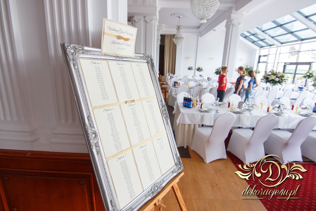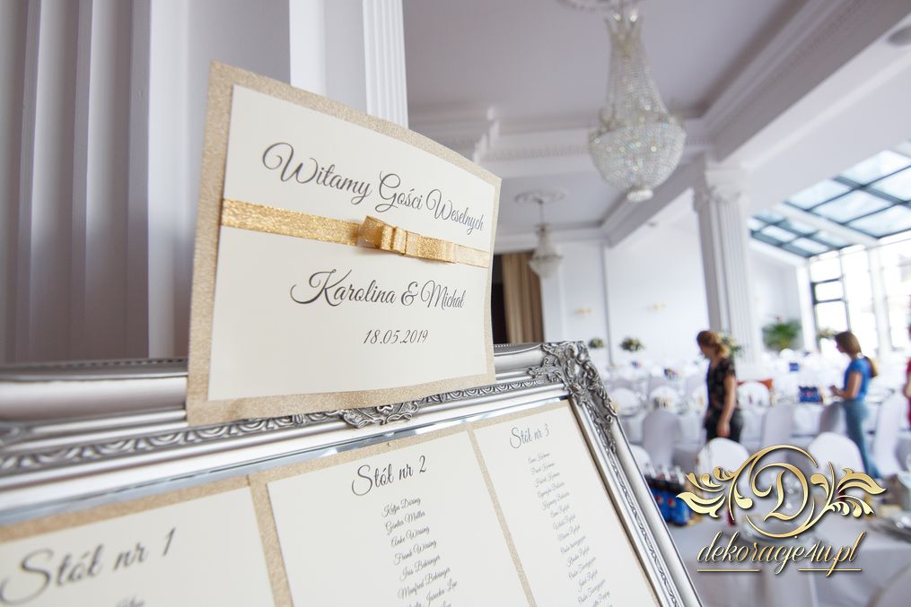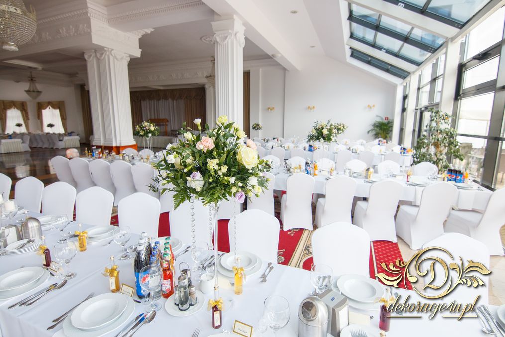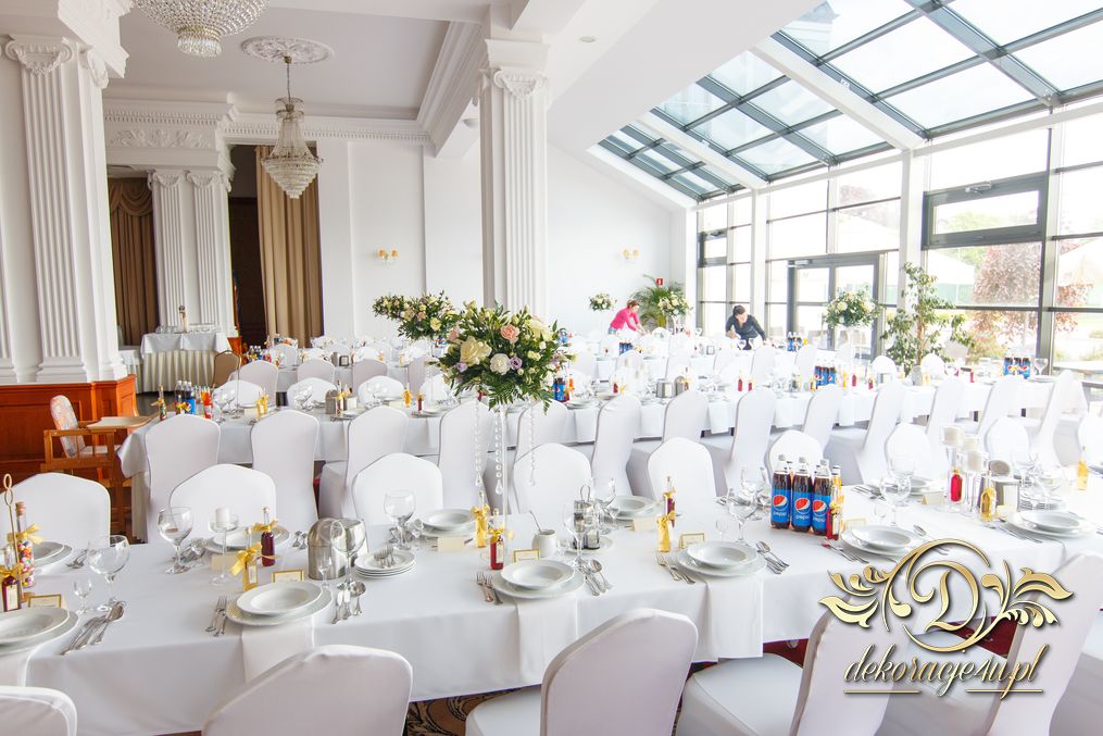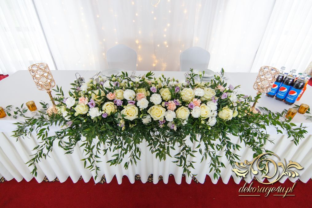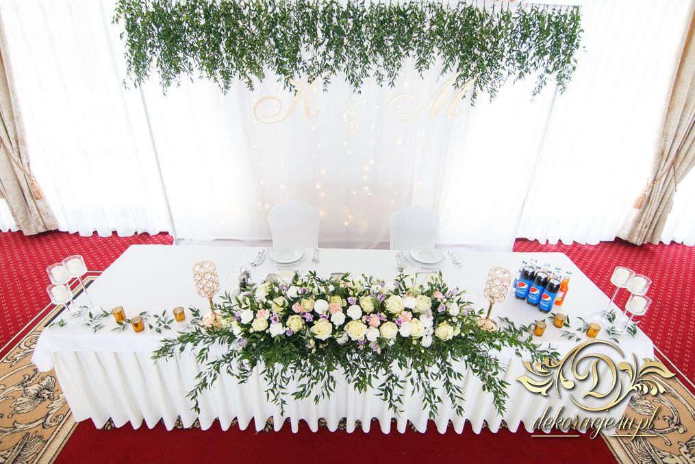 Ruskus w roli głównej kolejny raz. Piękny stół dla Młodej Pary i bogata ścianka. Na stołach dla gości świece i bukiety na wazonach. A pod sceną, gdzie orkiestra będzie wydobywała dźwięki dla gości wielki napis LOVE LED.