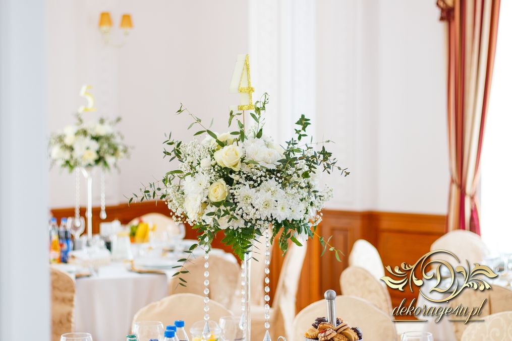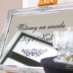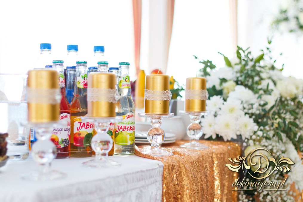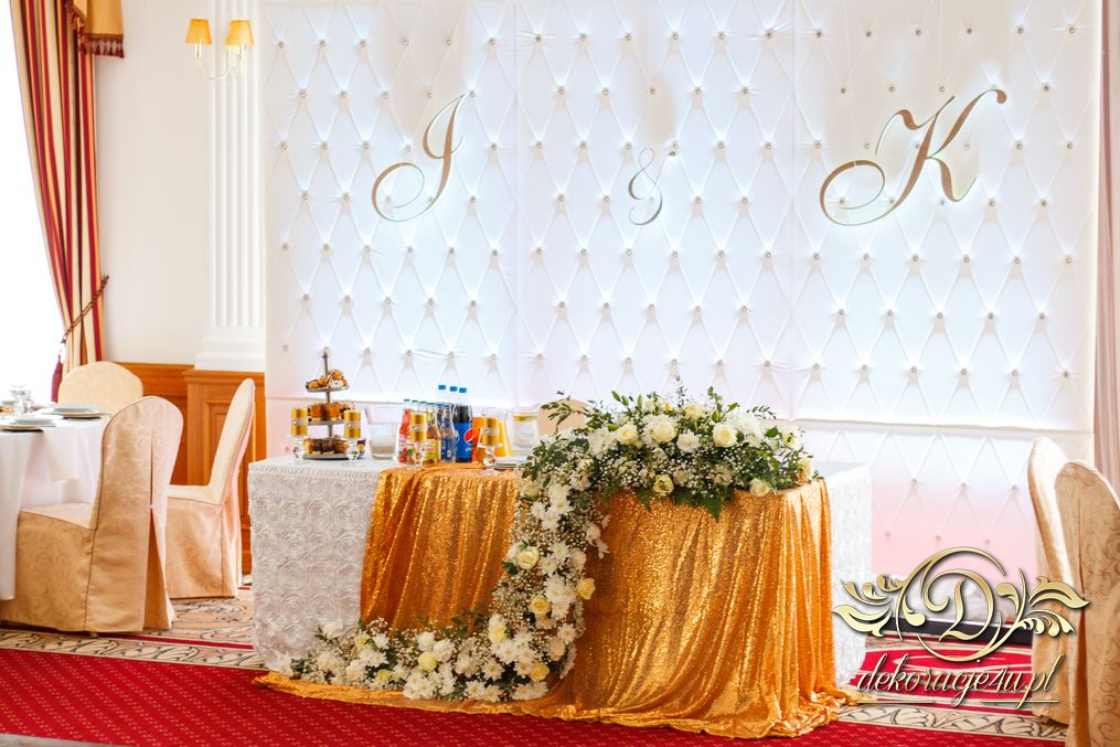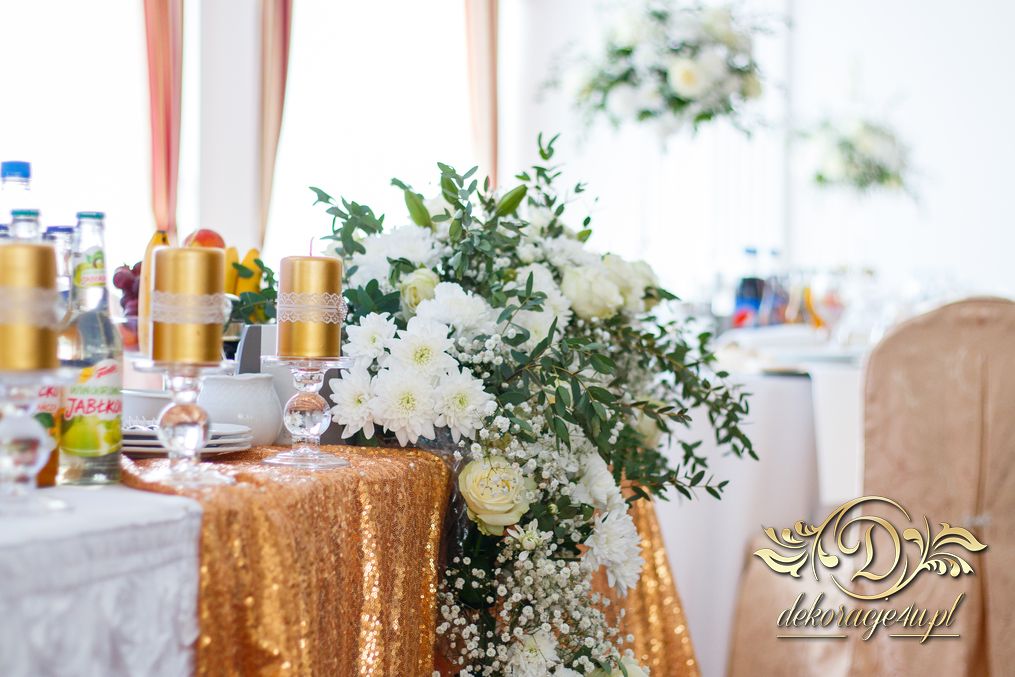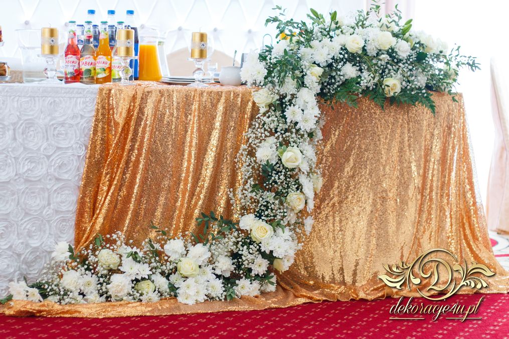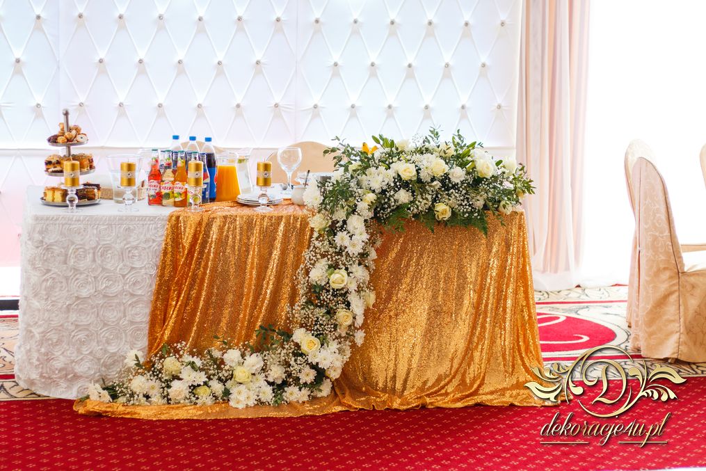 Złoto ponownie z wielkim bukietem zwisającym ze stołu Państwa Młodych na ziemie. Dodatkowo na stołach bukiety dla gości i wielkie lustro z napisem "Witamy na weselu".