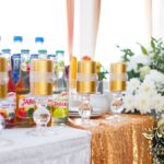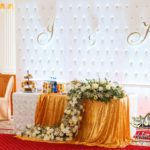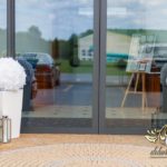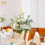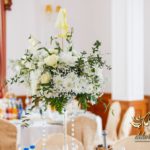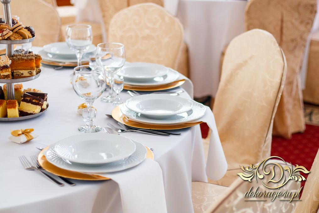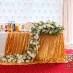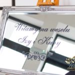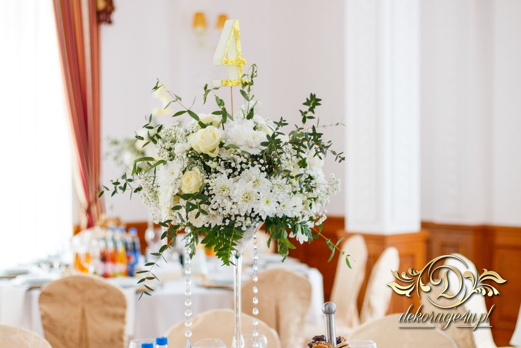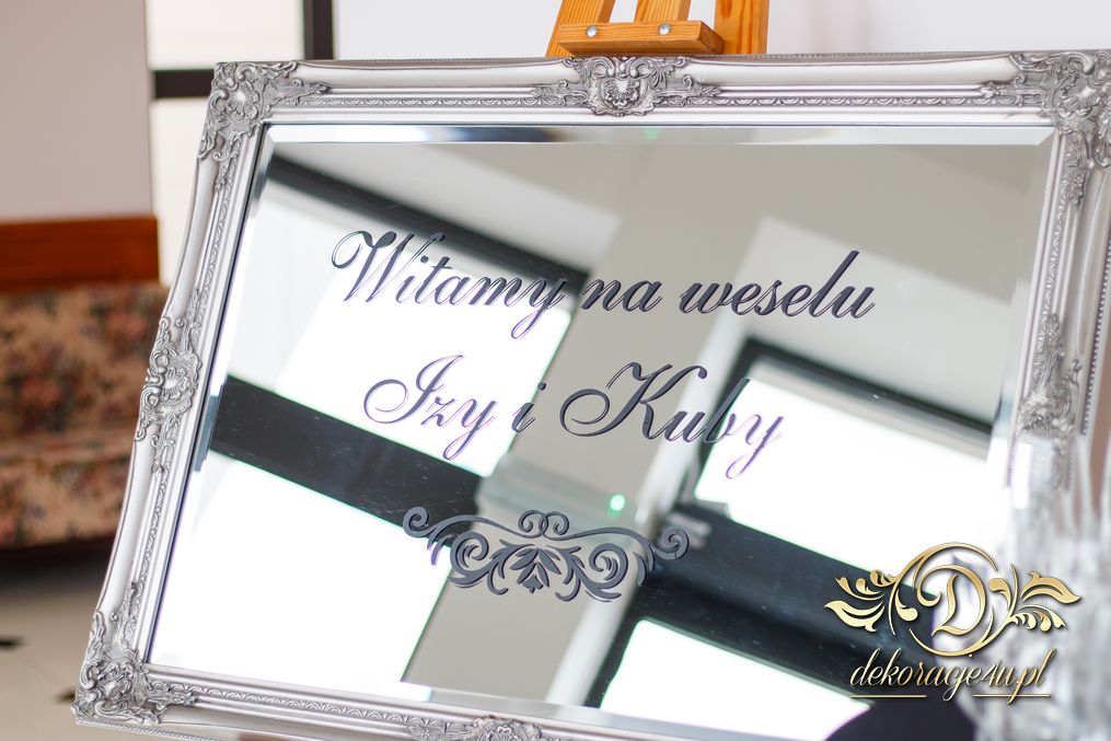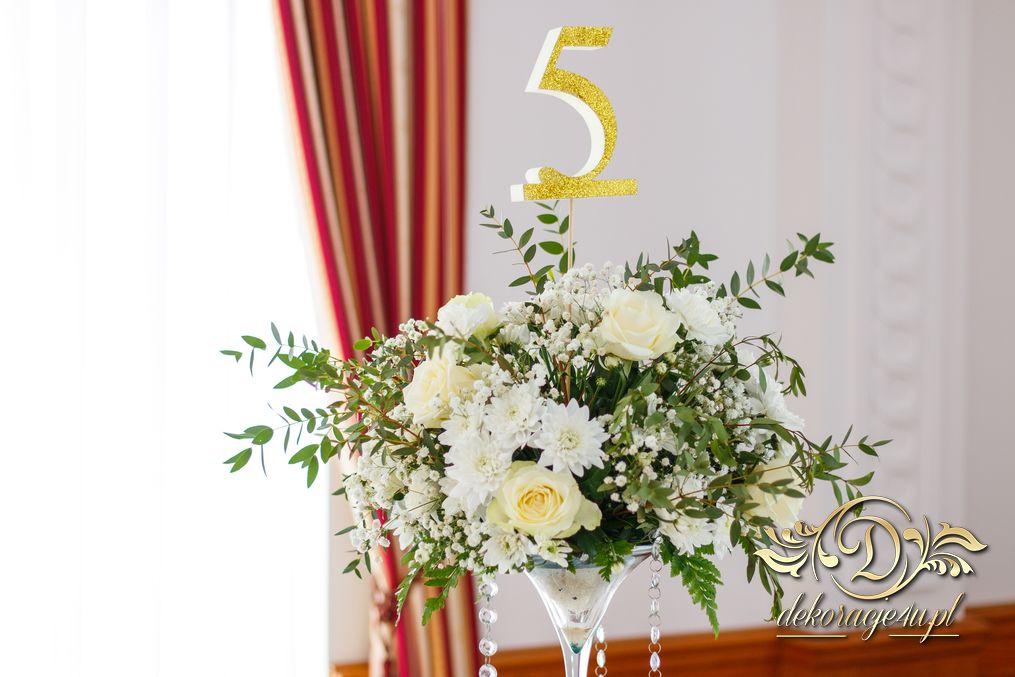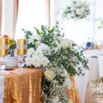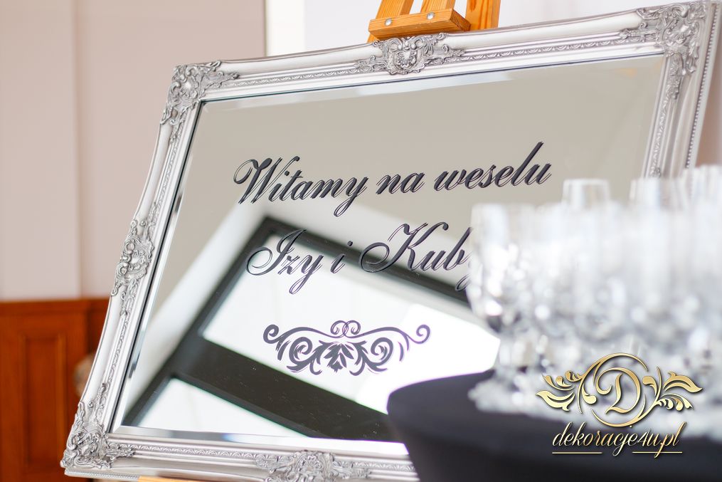 Złoto ponownie z wielkim bukietem zwisającym ze stołu Państwa Młodych na ziemie. Dodatkowo na stołach bukiety dla gości i wielkie lustro z napisem "Witamy na weselu".