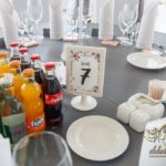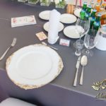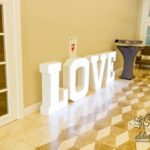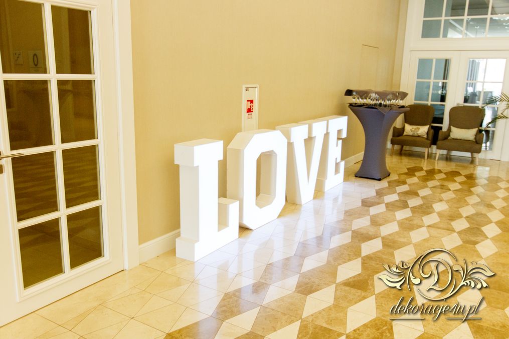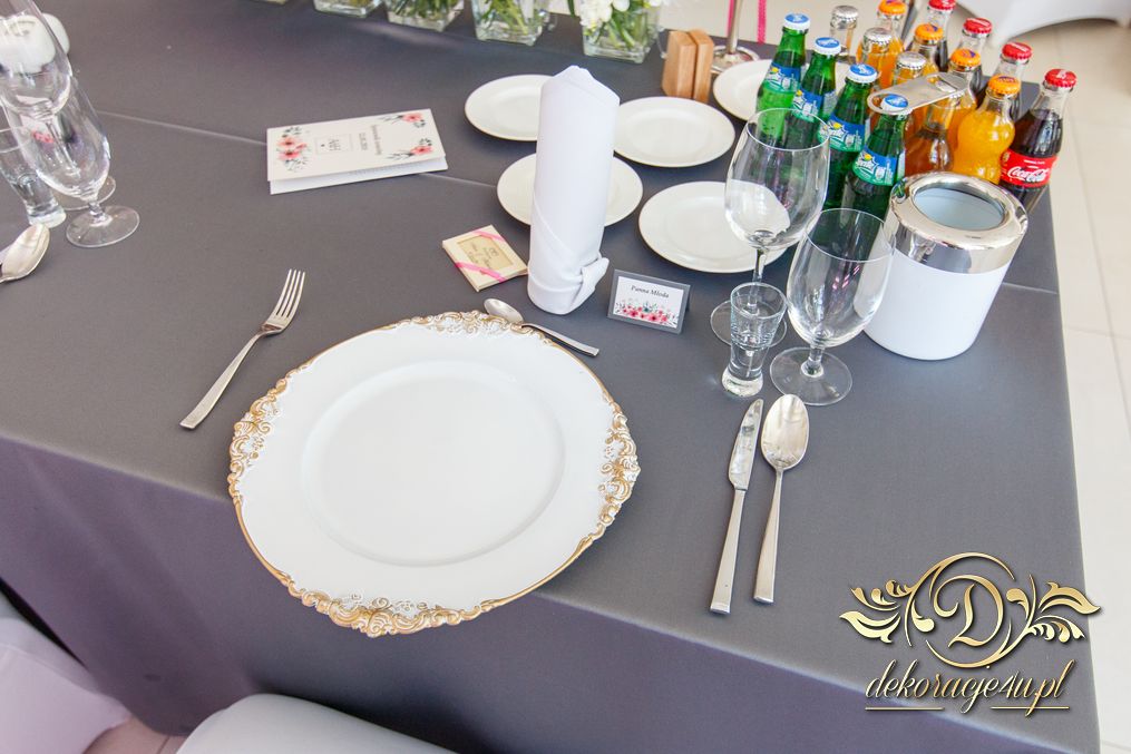 Piękne białe podtalerze dla Państwa Młodych z złota ramką, ścianka z pięknych balonów z helem, a na stołach dla gości weselnych piękne bukiety z żywych kwiatów. Na korytarzu napis LOVE do zdjęć 🙂