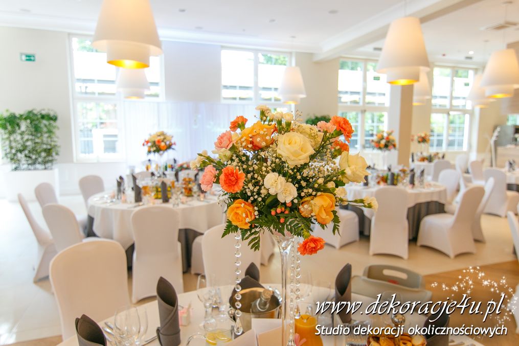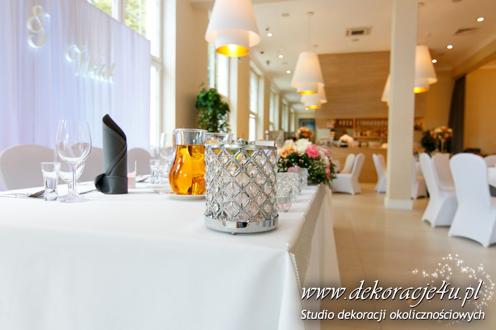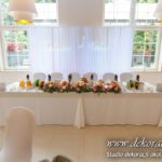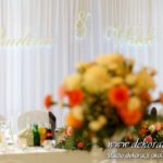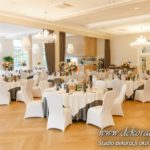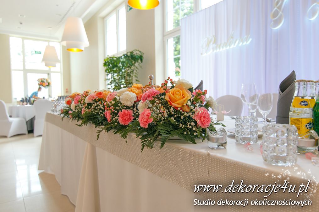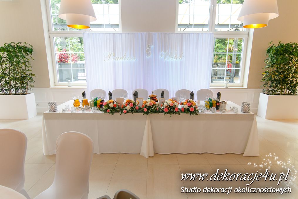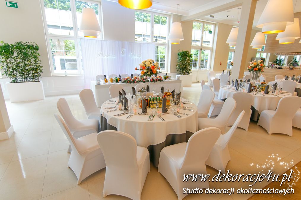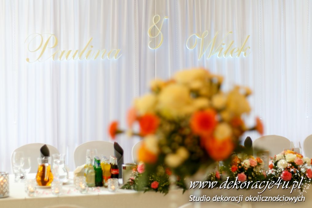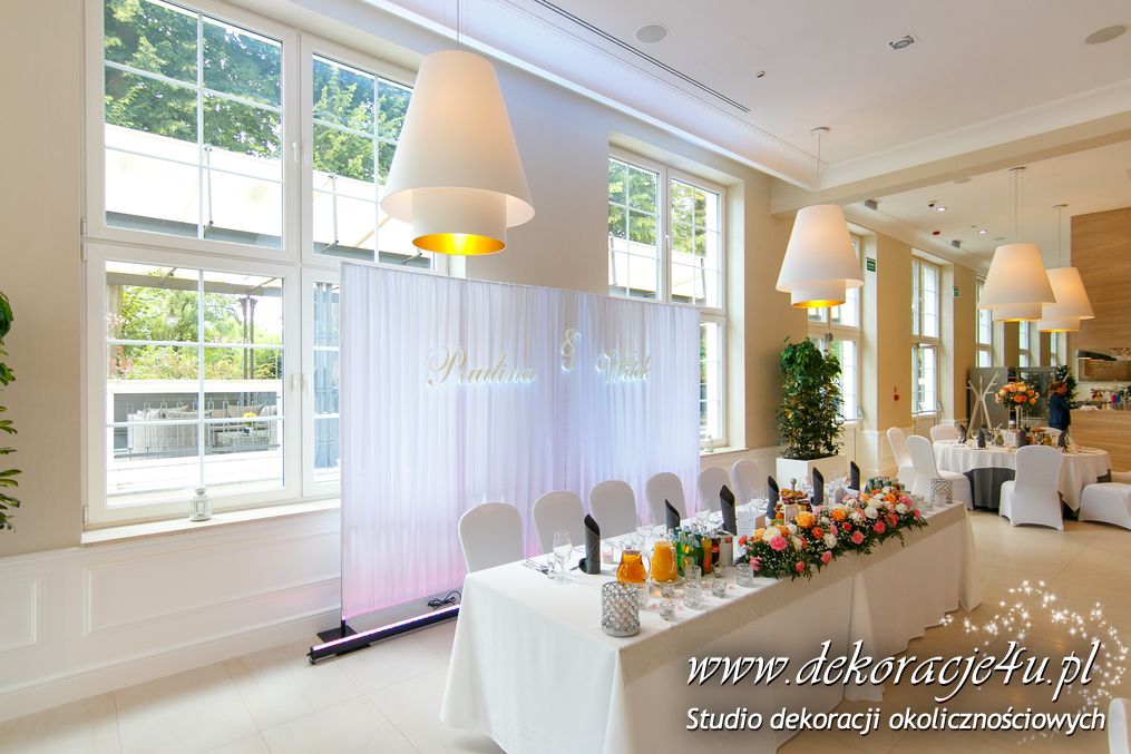 Dekoracja sali weselnej w Łańcucie - Sokół - kompleks Wellness i Spa. Na stołach duże piękne bukiety kwiatów, biała ścianka z imionami. Wszystko pięknie wyglądało....