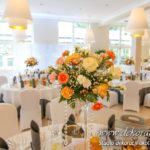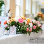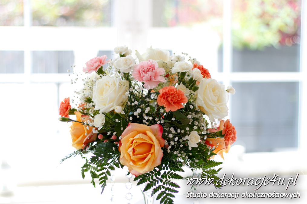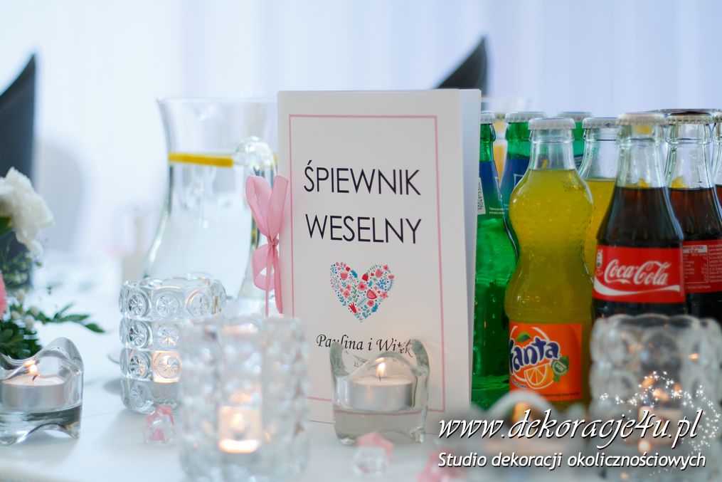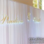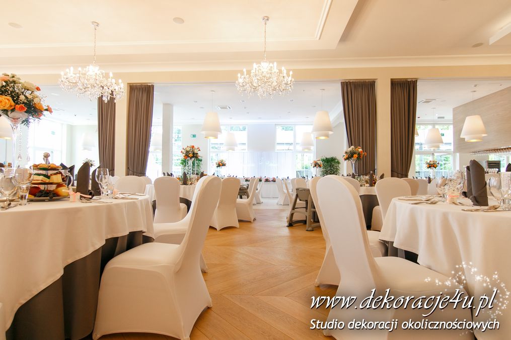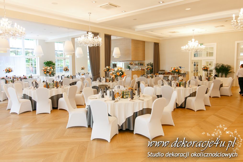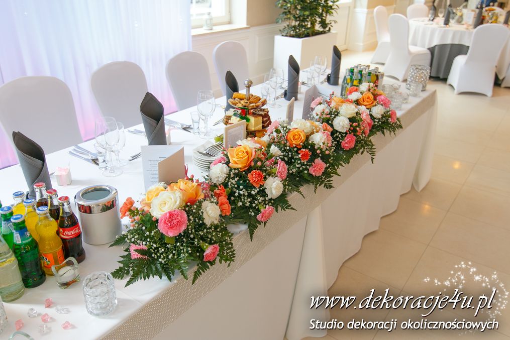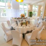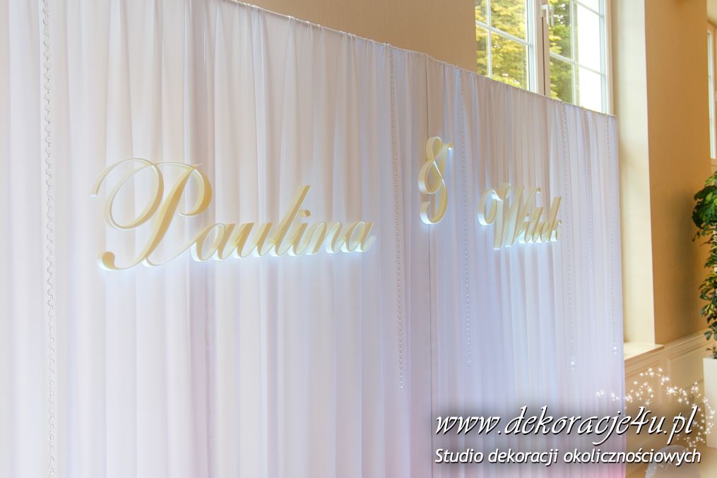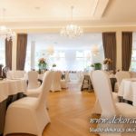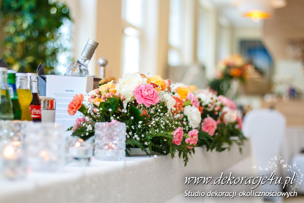Dekoracja sali weselnej w Łańcucie - Sokół - kompleks Wellness i Spa. Na stołach duże piękne bukiety kwiatów, biała ścianka z imionami. Wszystko pięknie wyglądało....