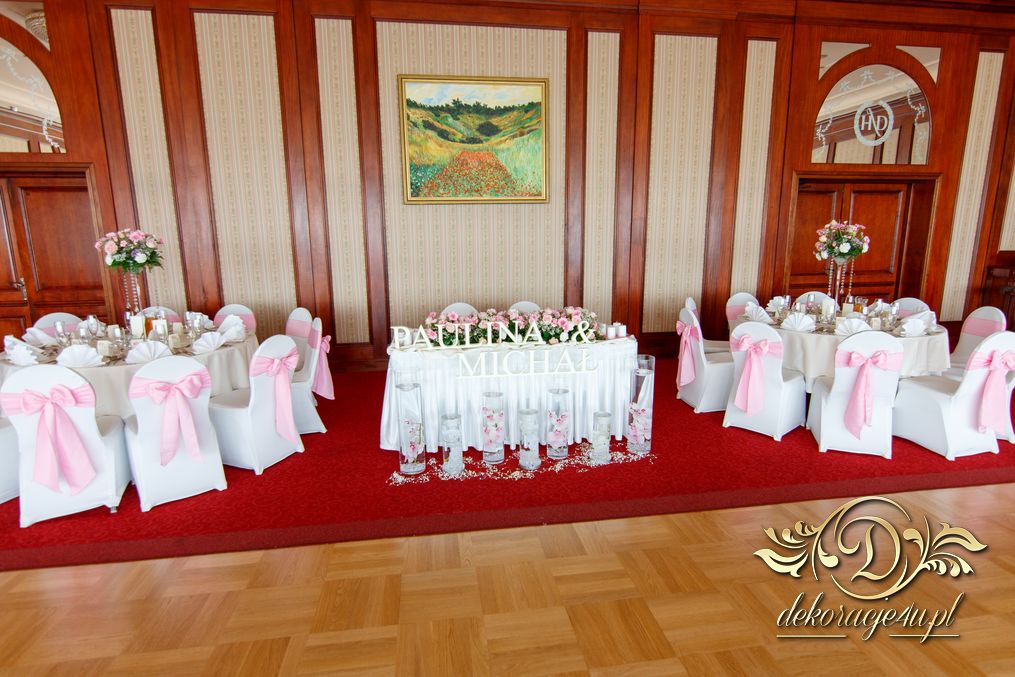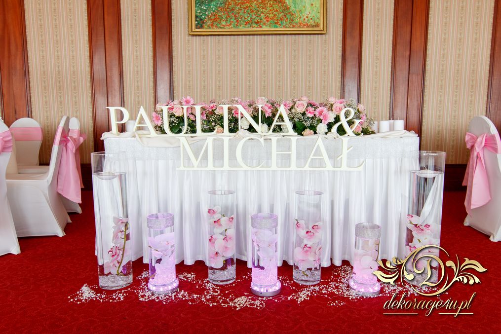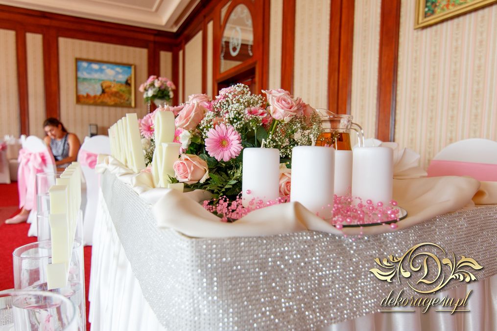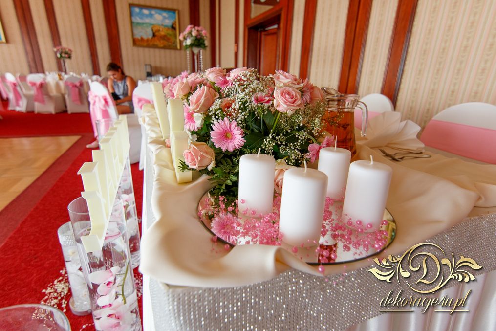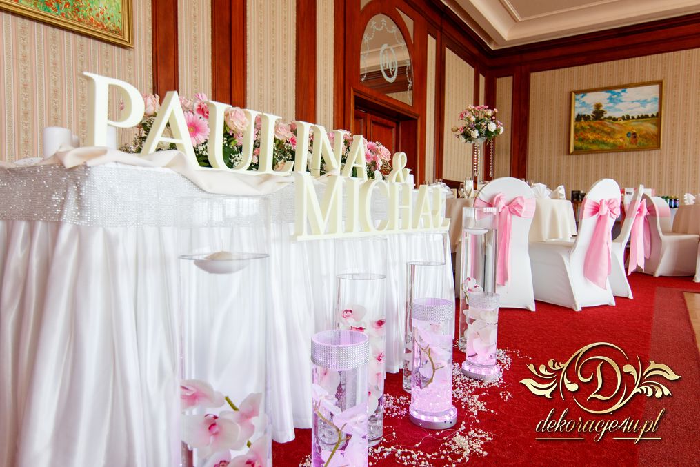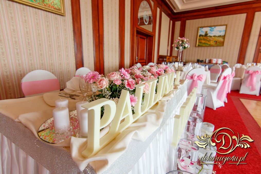 Wielkie imiona na stole glównym, świece, tuby ze storczykiem i świecami, pokrowce elastyczne plus kokardy w kolorze jasnego różu. To wszystko w pełni dopasowało się do bukietów na stołach.