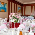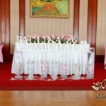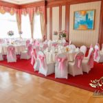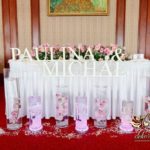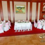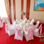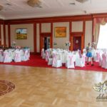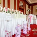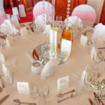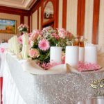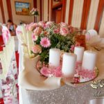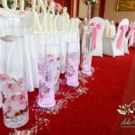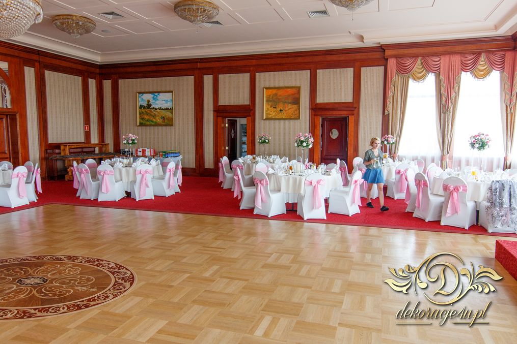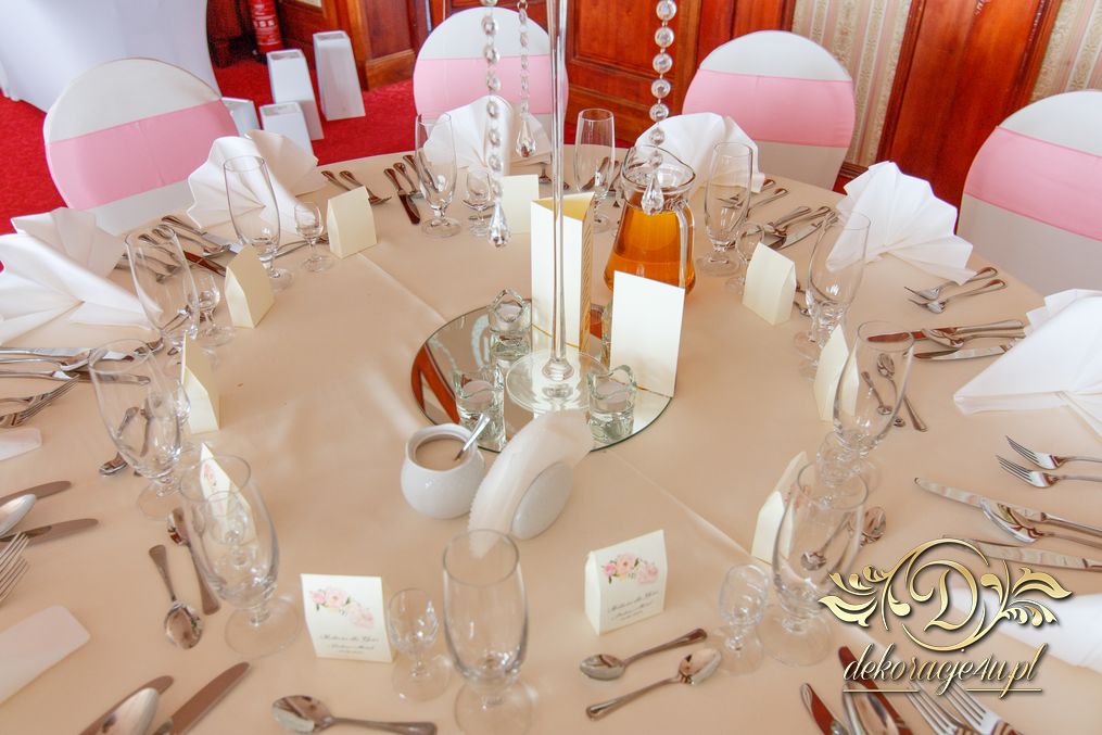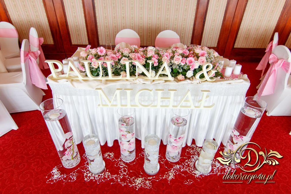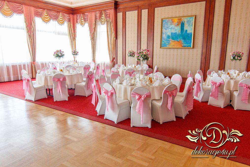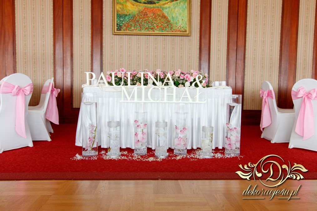 Wielkie imiona na stole glównym, świece, tuby ze storczykiem i świecami, pokrowce elastyczne plus kokardy w kolorze jasnego różu. To wszystko w pełni dopasowało się do bukietów na stołach.