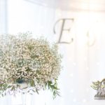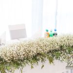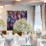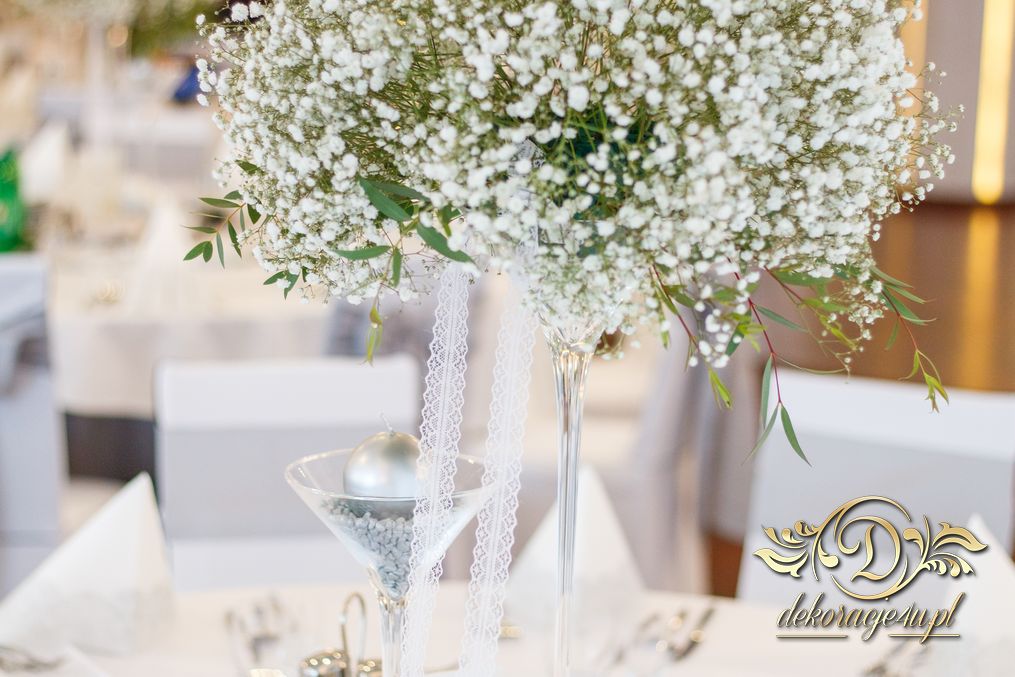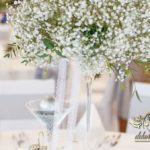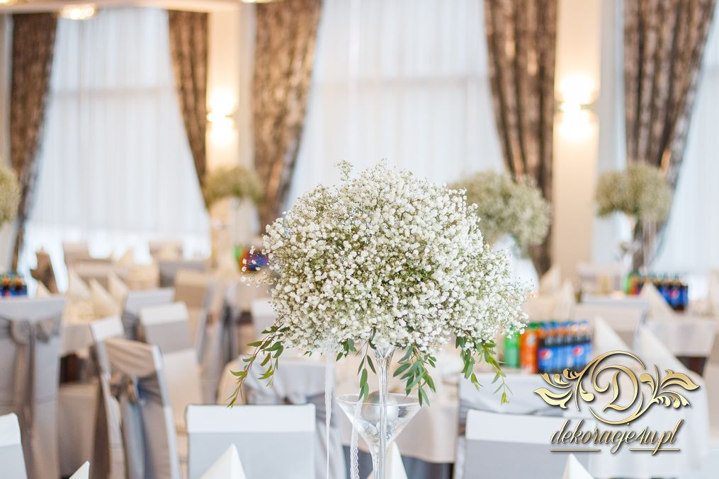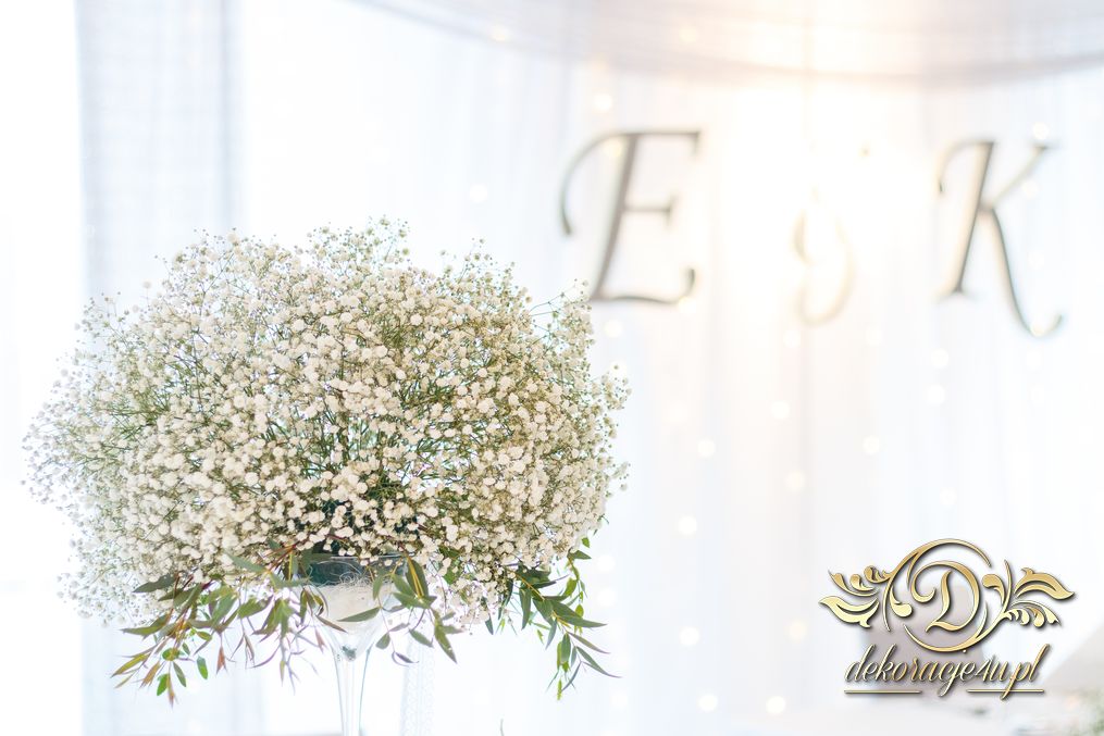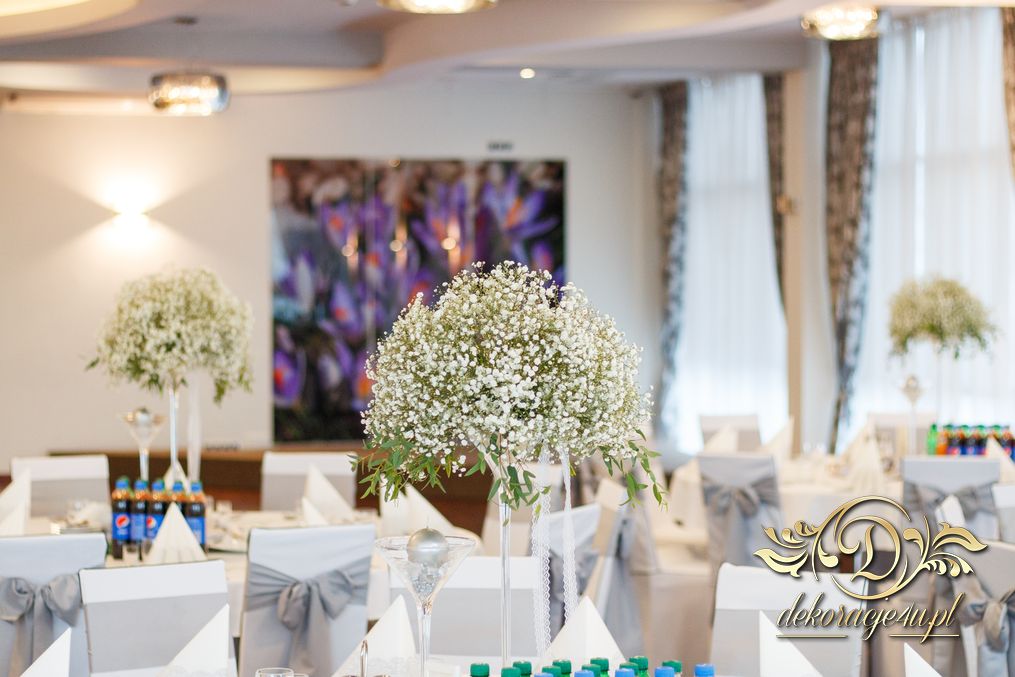 Cała sala została wypełniona gipsówką. Bukiety dla gości, bukiet na stół główny.