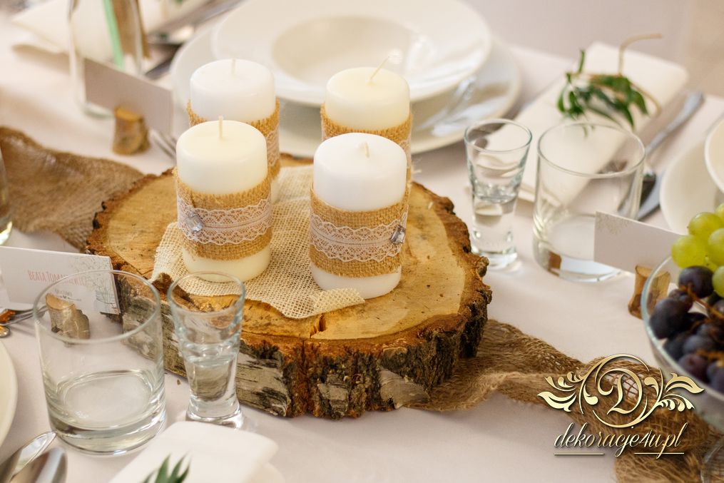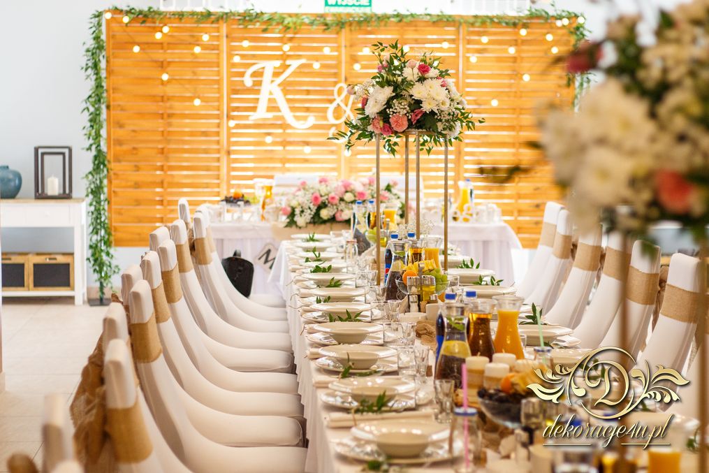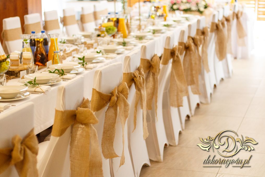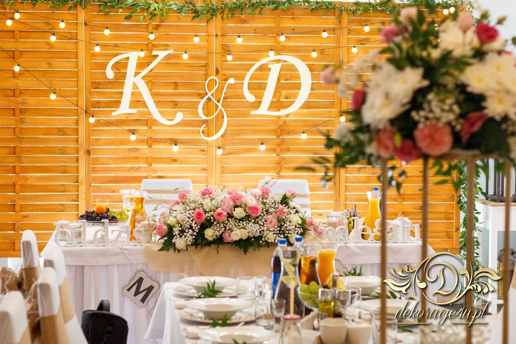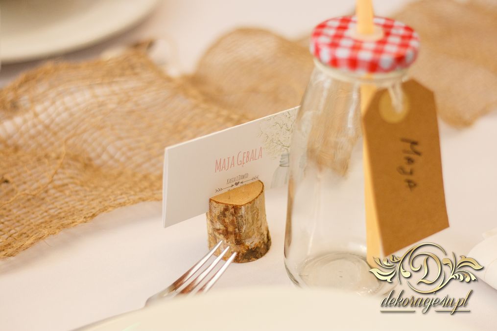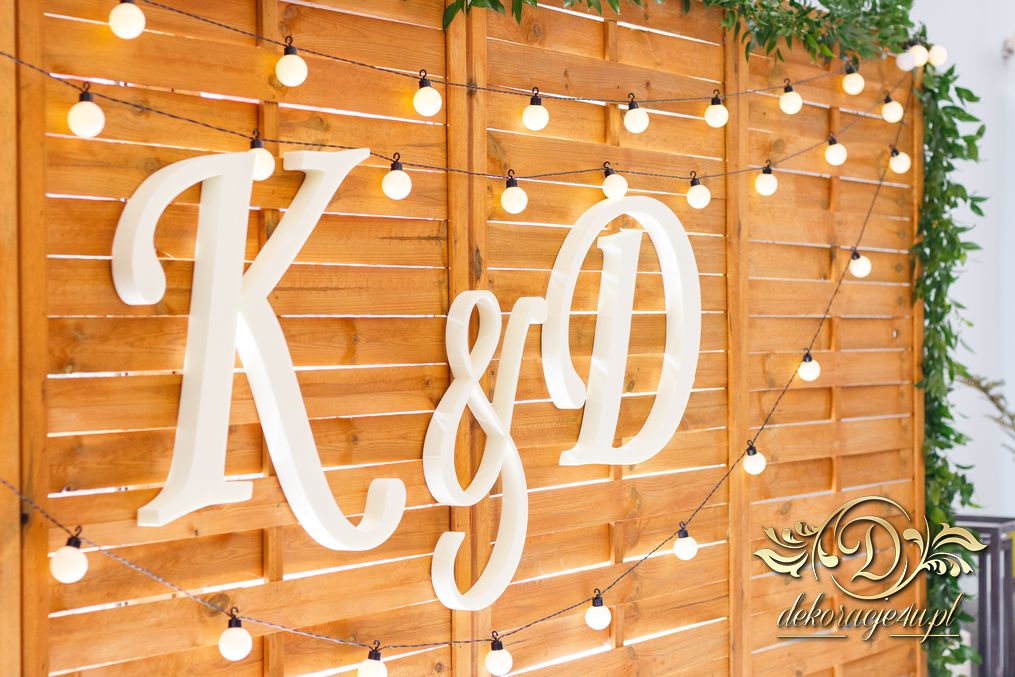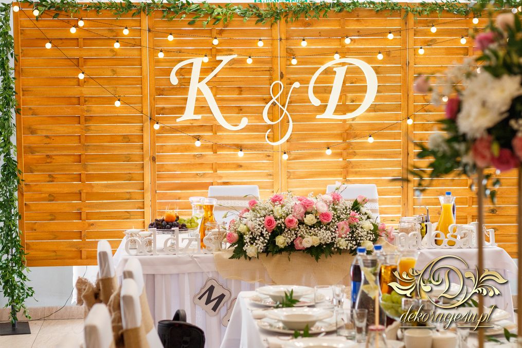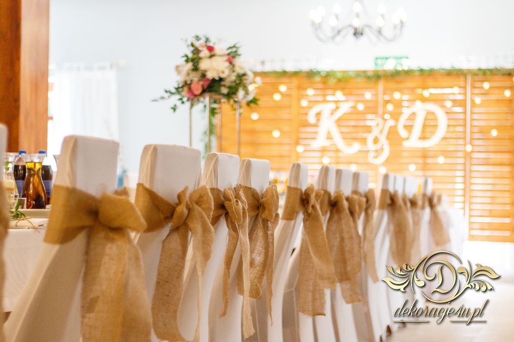 Drewniana ścianka z inicjałami i lampkami. Na stołach juta i metolowe wazony z kwiatami. Krzesła zawiązane szarfami z juty. Świeczki postawione na drewnianych podstawach - wszystko pięknie wyglądało.