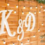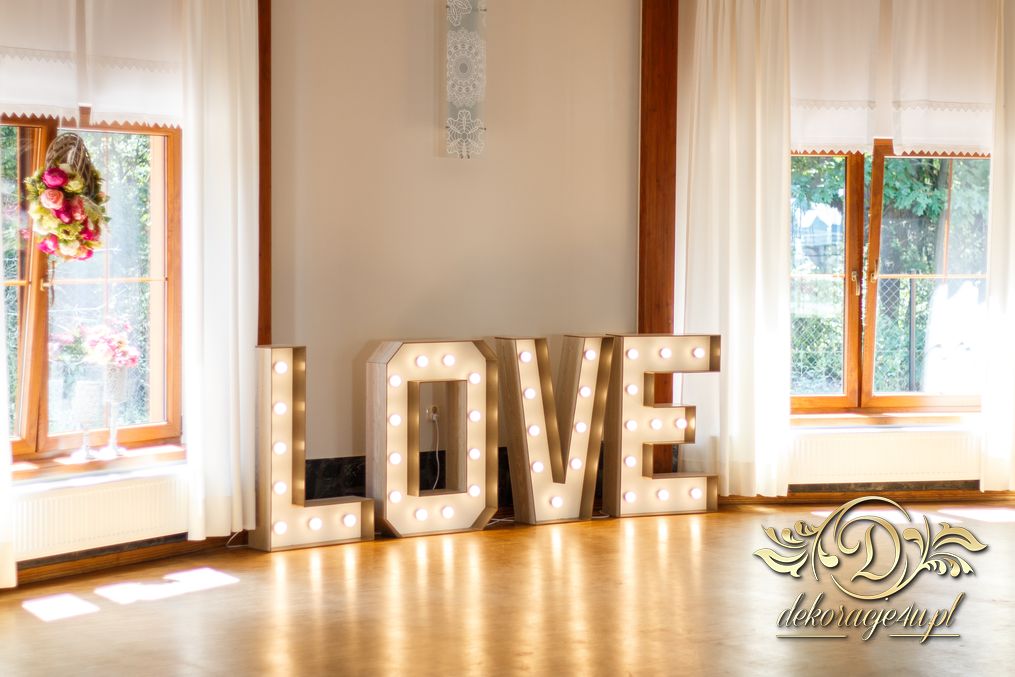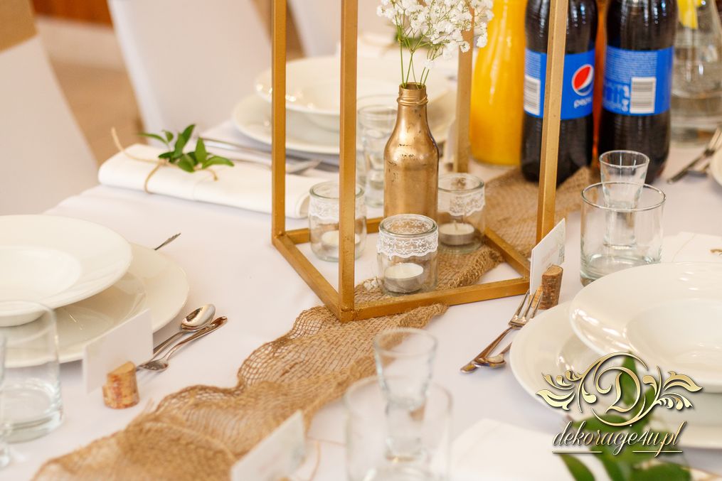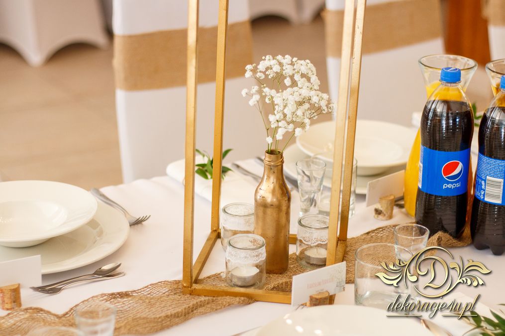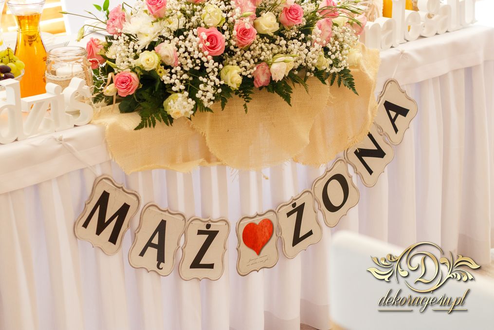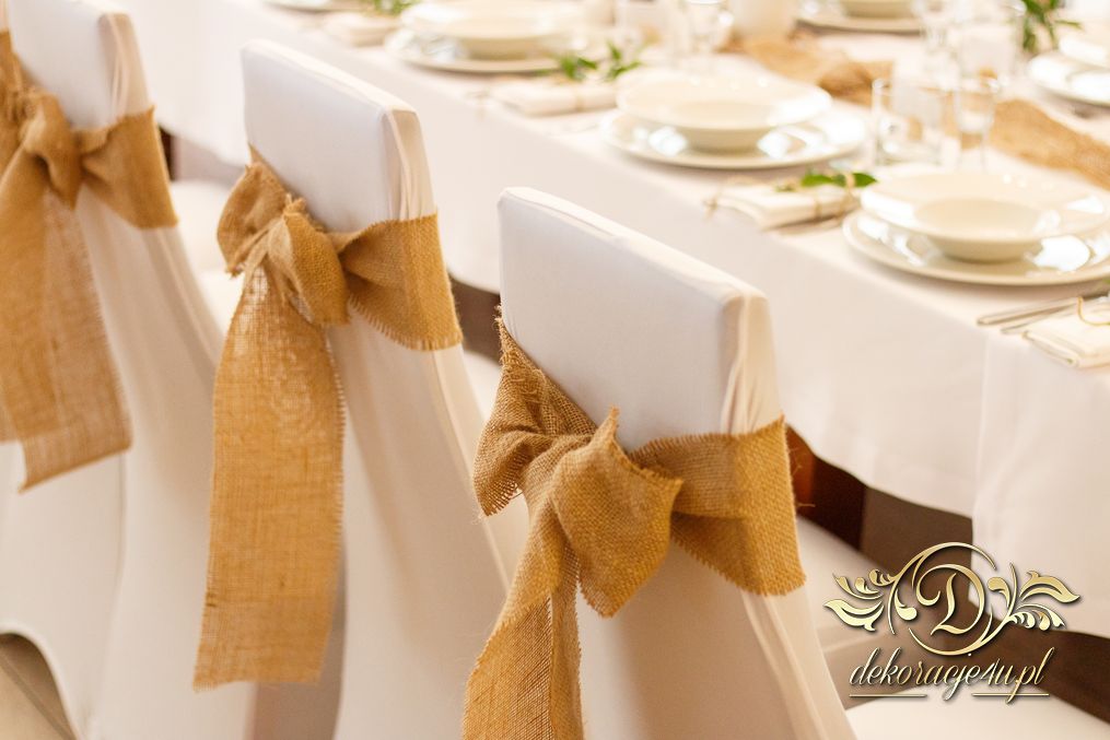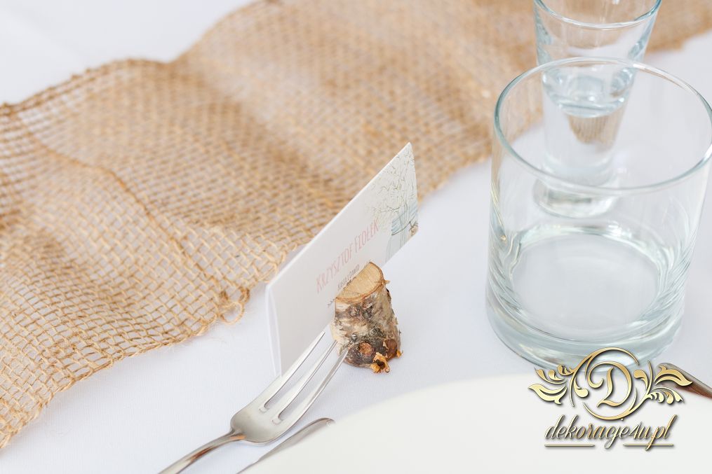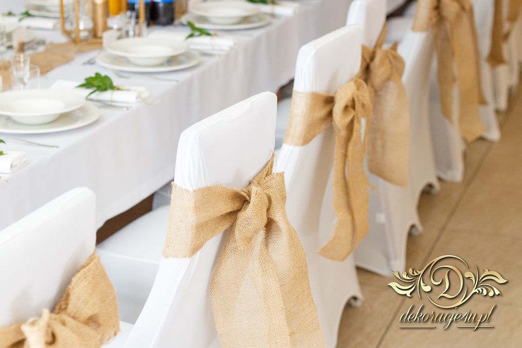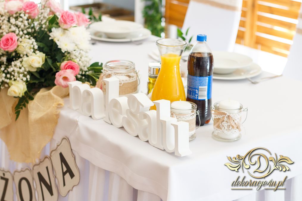 Drewniana ścianka z inicjałami i lampkami. Na stołach juta i metolowe wazony z kwiatami. Krzesła zawiązane szarfami z juty. Świeczki postawione na drewnianych podstawach - wszystko pięknie wyglądało.