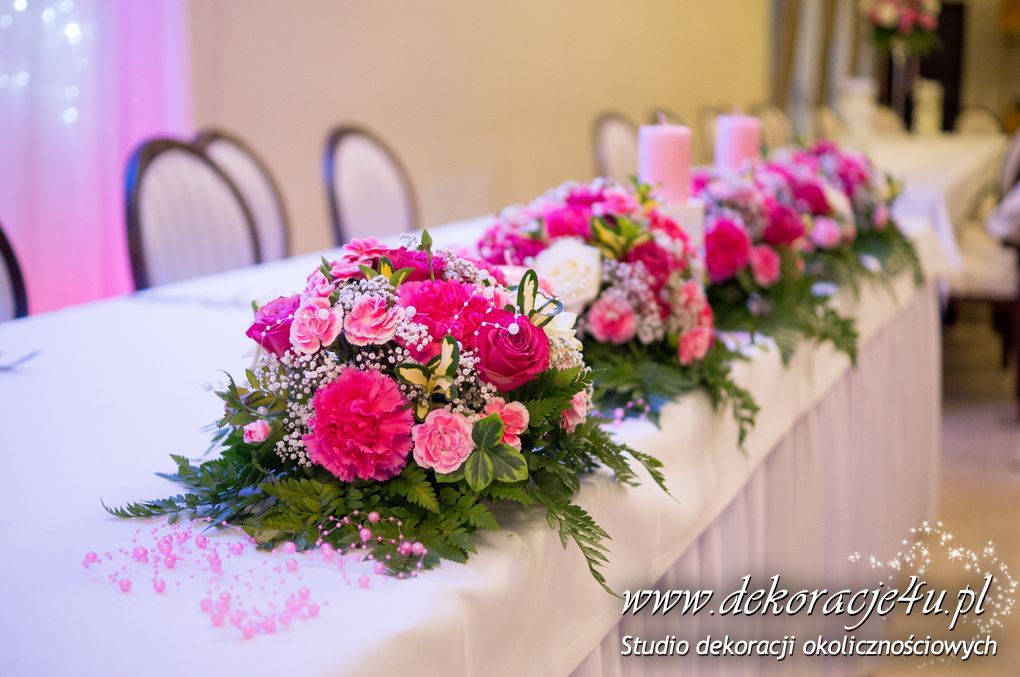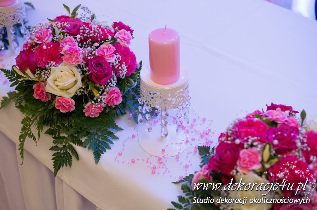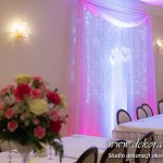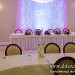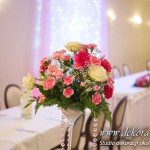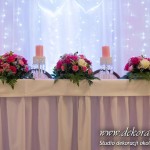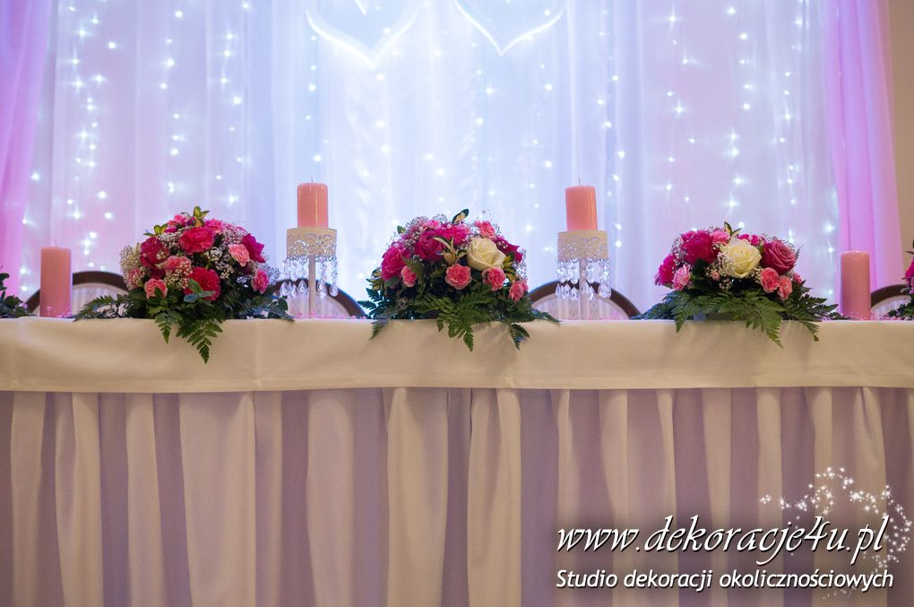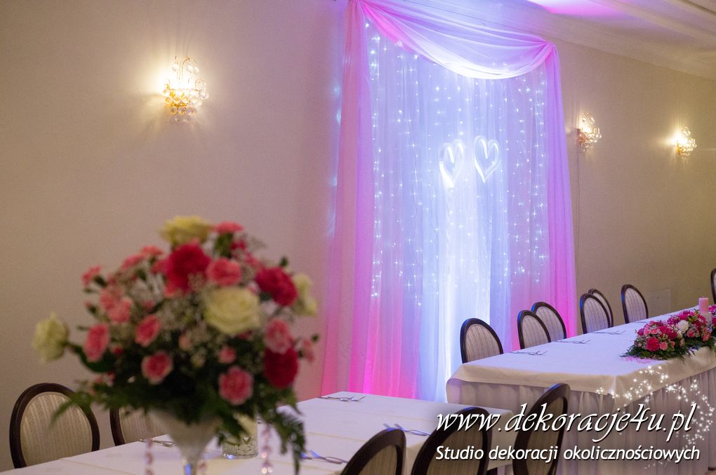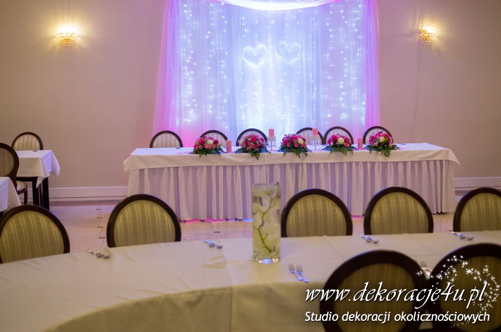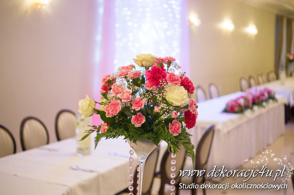 Delikatna dekoracja sali w barwach różowych - na stoły bukiety w kolorach delikatnego różu obok tuby z zatopionym storczykiem i pływak. Dekoracja ścianki za Parą Młodych - dekoracja światłem - delikatne podświetlenie. Kwiaty w kolorach dekoracji.