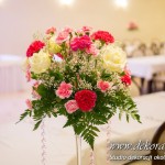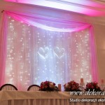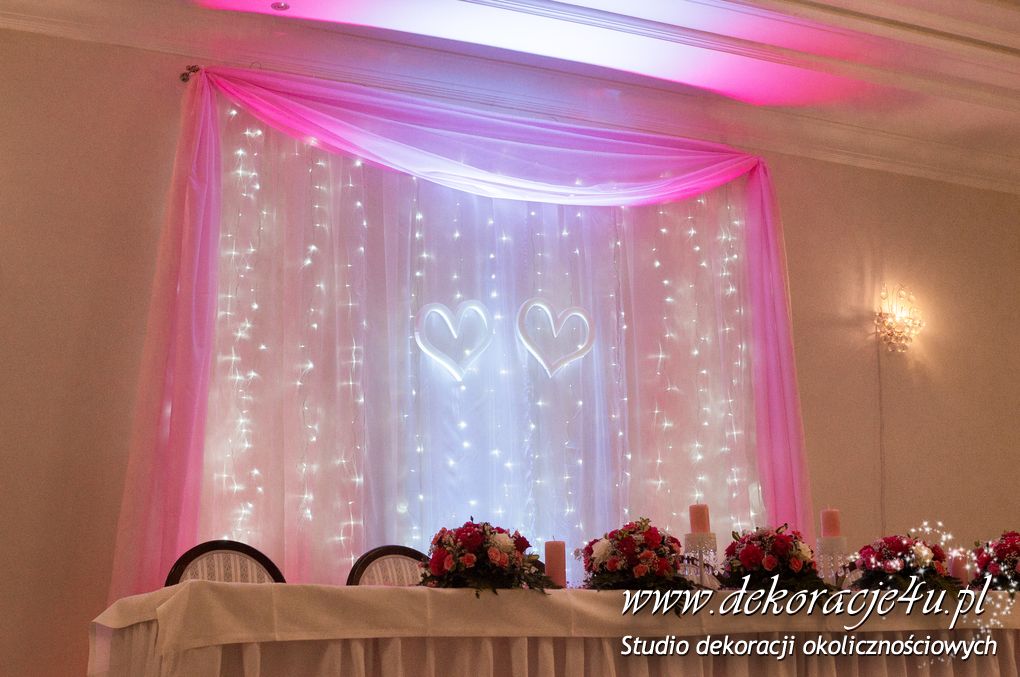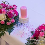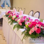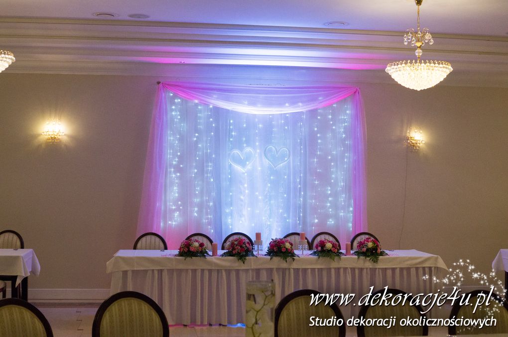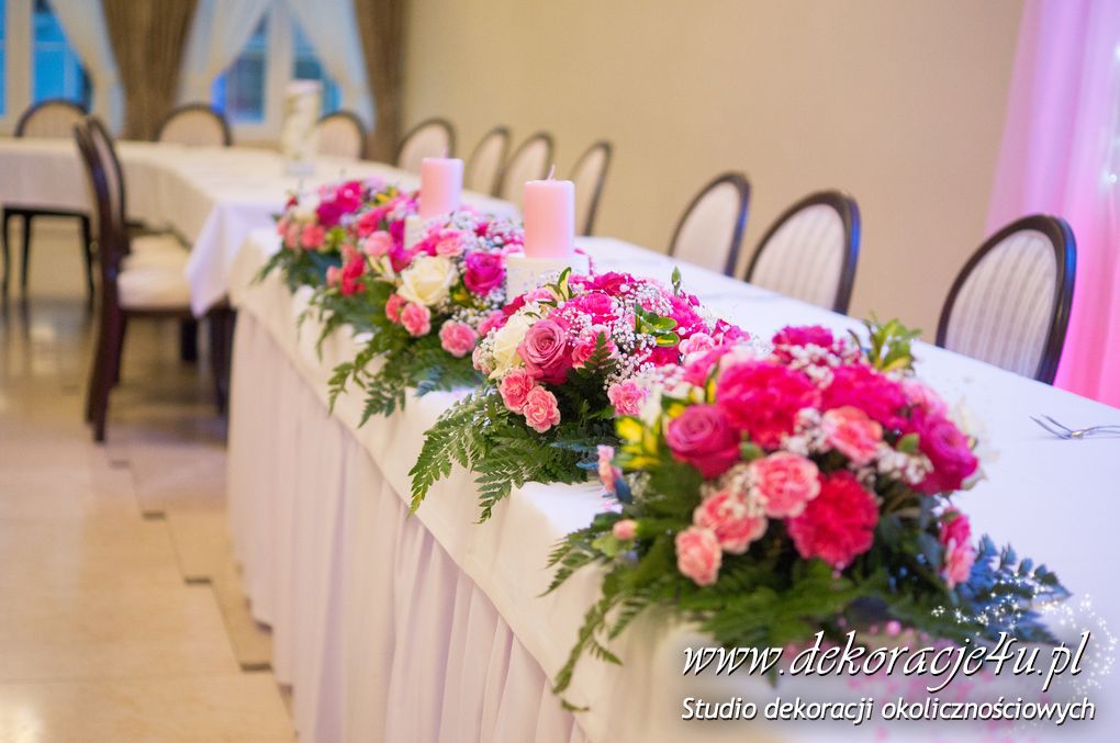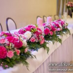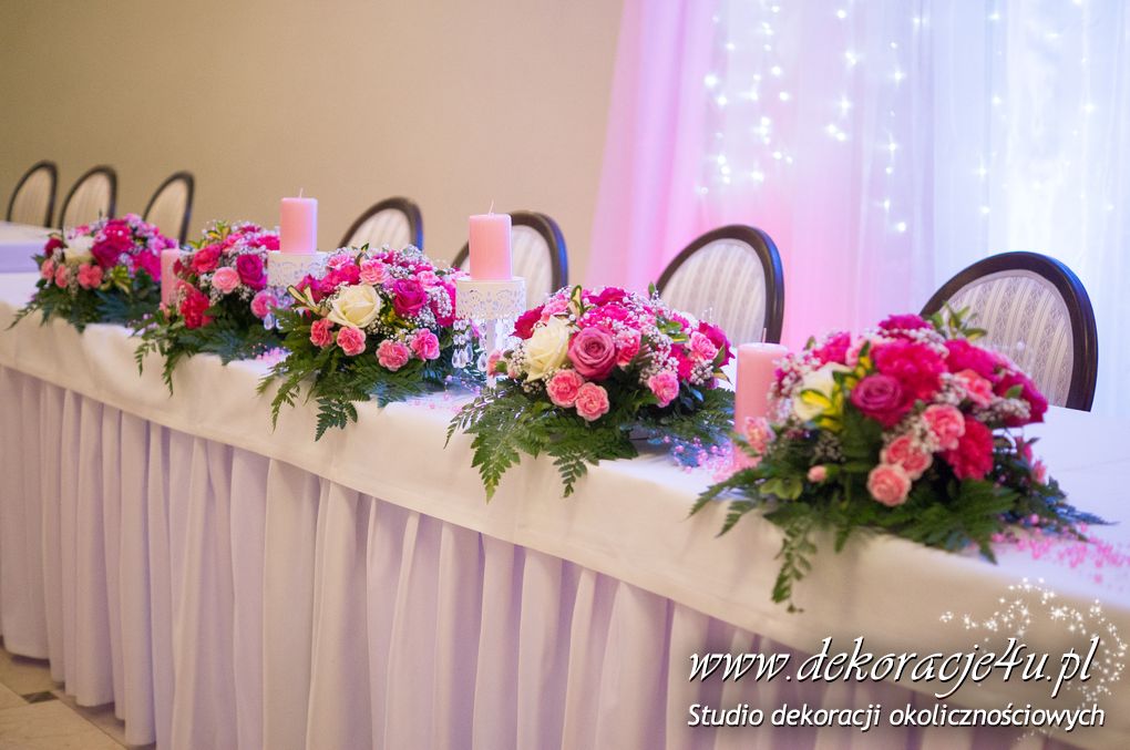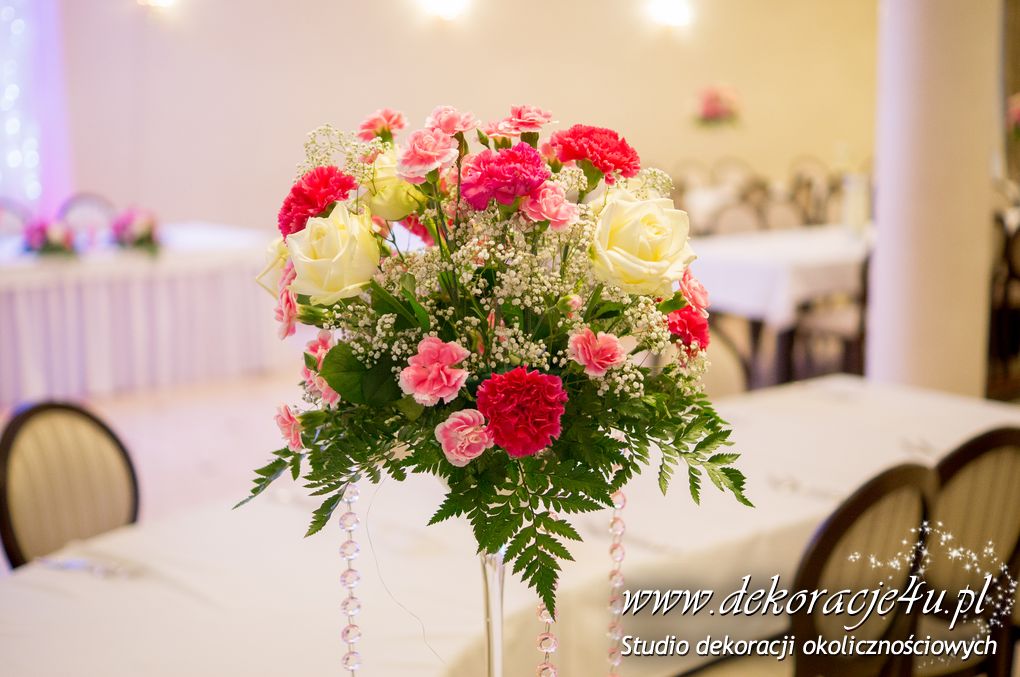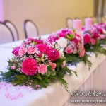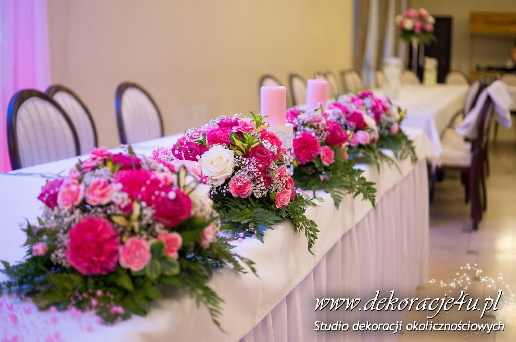 Delikatna dekoracja sali w barwach różowych - na stoły bukiety w kolorach delikatnego różu obok tuby z zatopionym storczykiem i pływak. Dekoracja ścianki za Parą Młodych - dekoracja światłem - delikatne podświetlenie. Kwiaty w kolorach dekoracji.