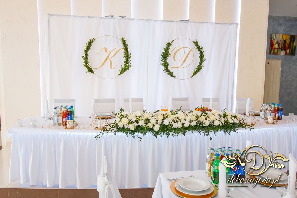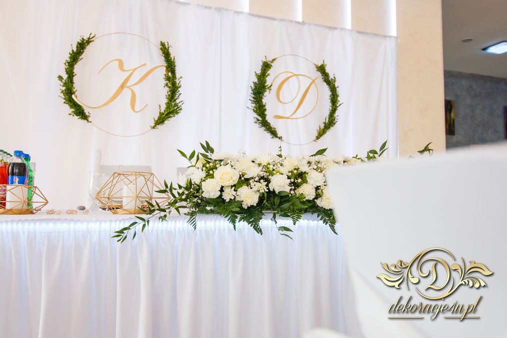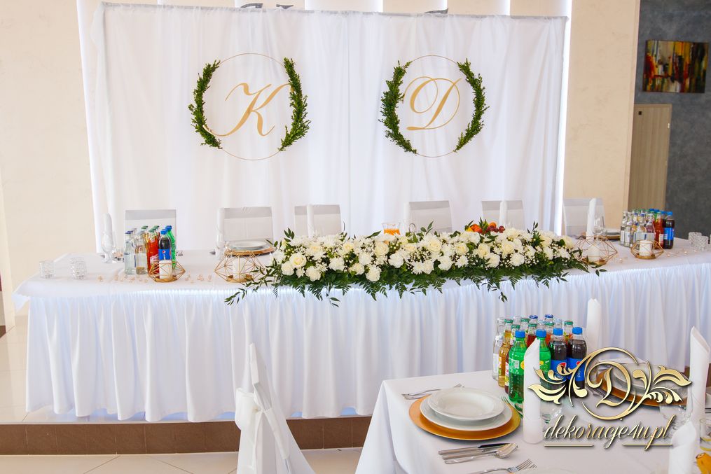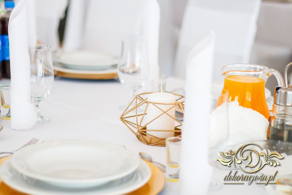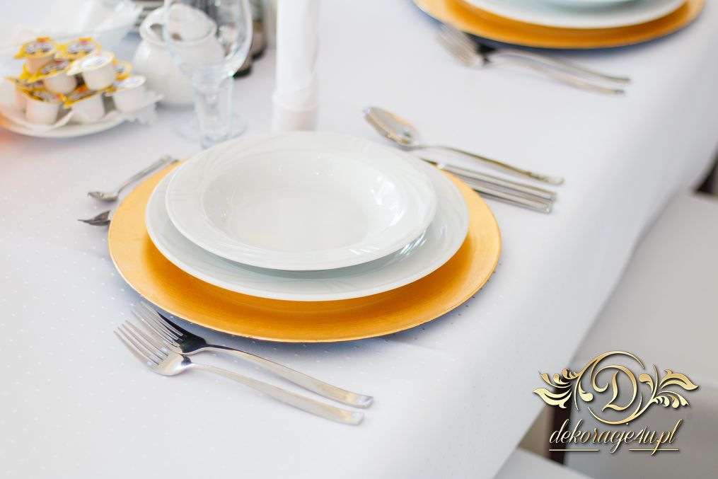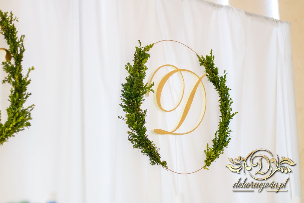 Dekoracja sali wyszła pięknie. Ładne wykończenia pod metalowymi stojakami, podtalerze złote dla każdego z gości. Na ścianie inicjały w złotym kole i dodatkiem ruskusa.