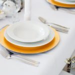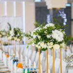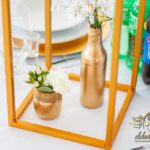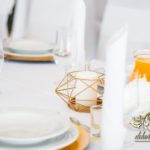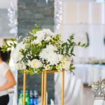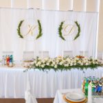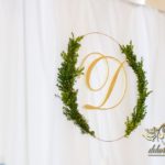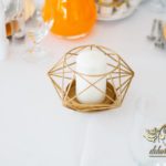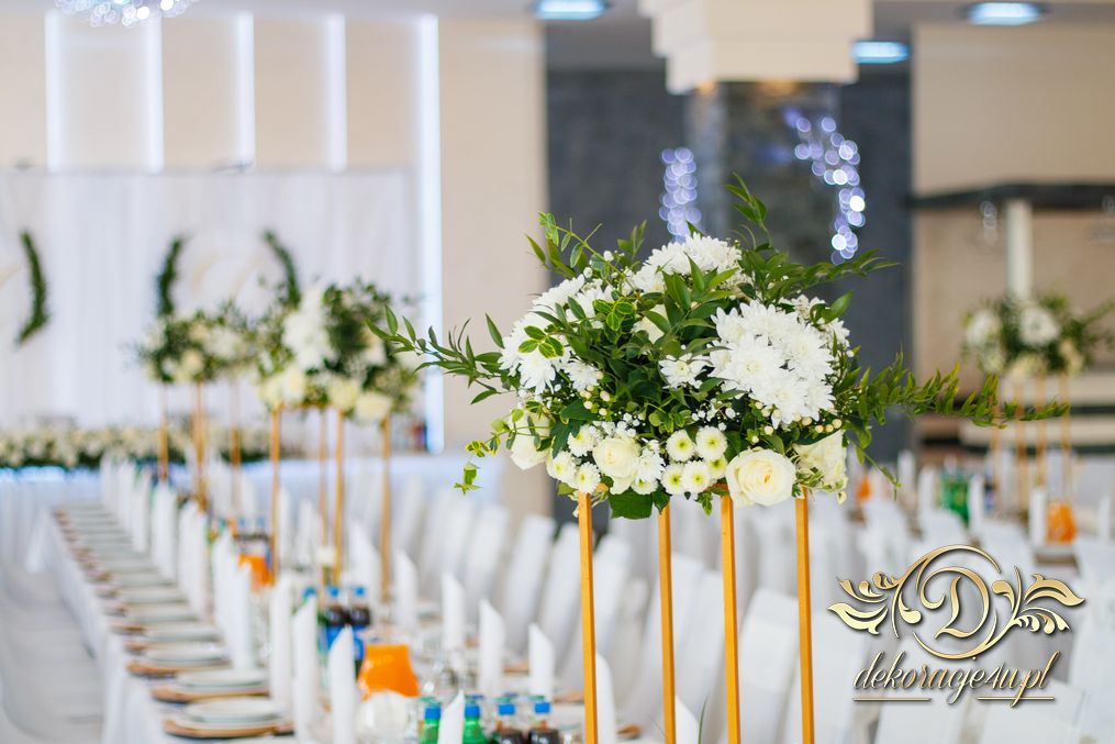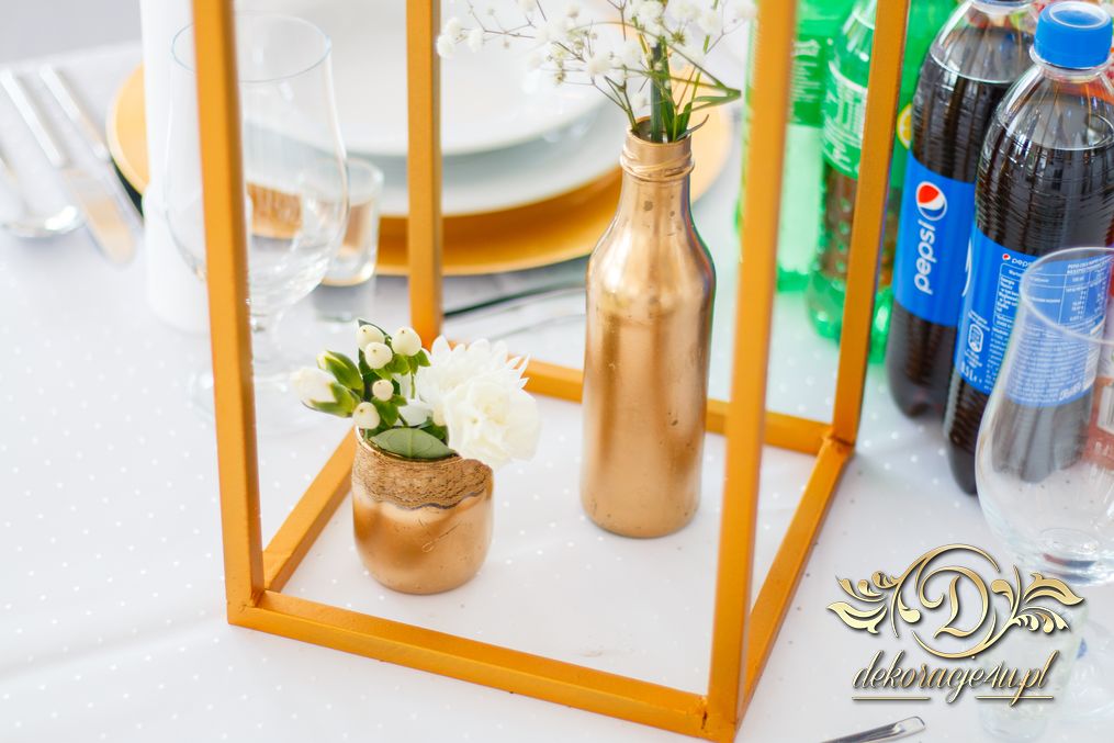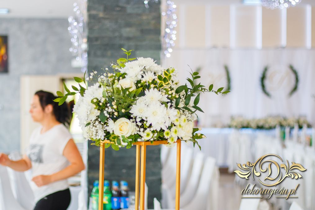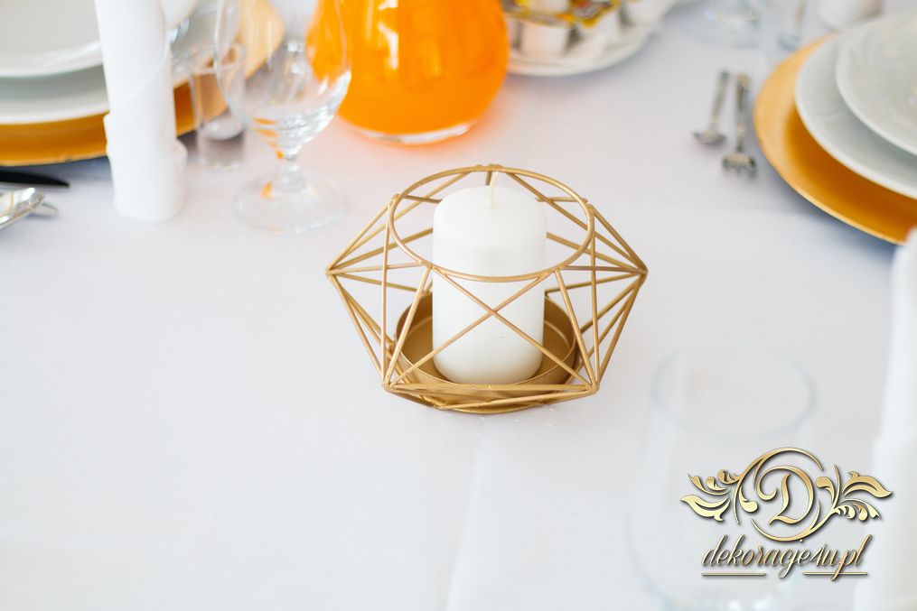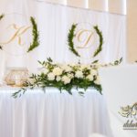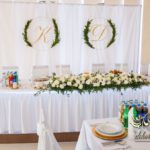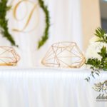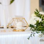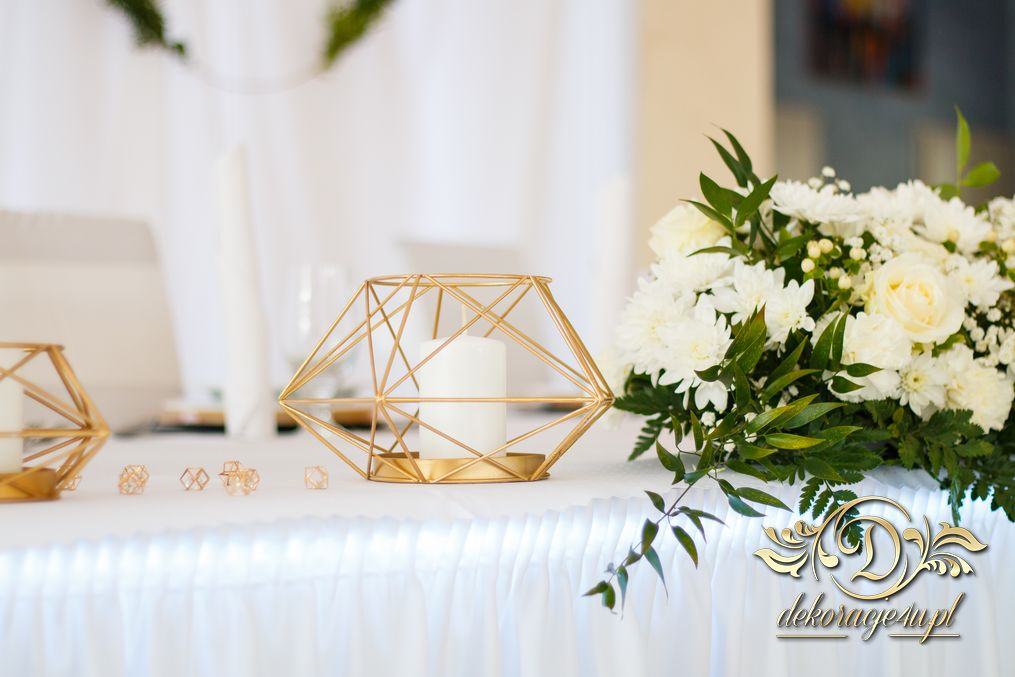 Dekoracja sali wyszła pięknie. Ładne wykończenia pod metalowymi stojakami, podtalerze złote dla każdego z gości. Na ścianie inicjały w złotym kole i dodatkiem ruskusa.