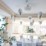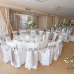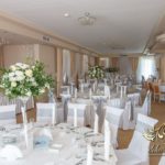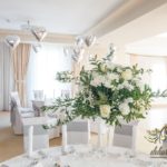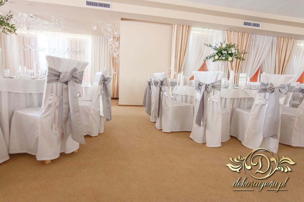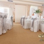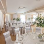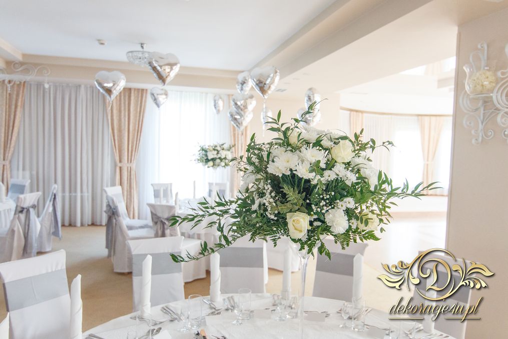 Piękna sala weselna z Zarzeczu koło Rzeszowa HIBISKUS, tym razem zagościły tak nasze piękne duży bukiety dla gości weselnych w tonacji białego i z dodatkiem liści zielonych. Dodatkowo na krzesłach szarfy srebrne, które są bardzo modne w tym roku.