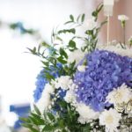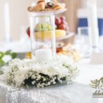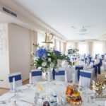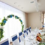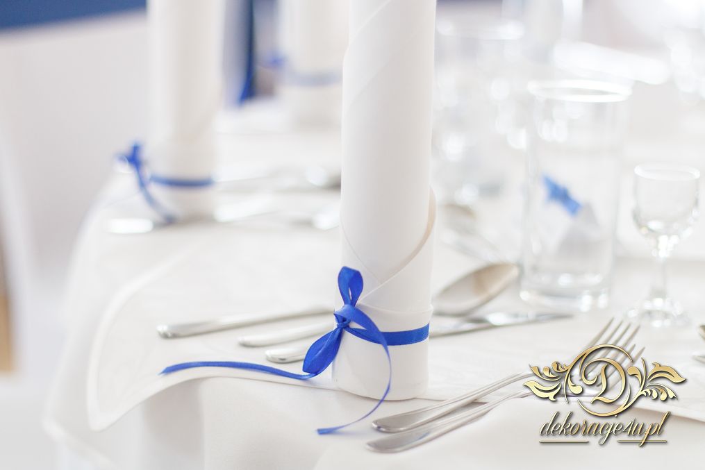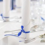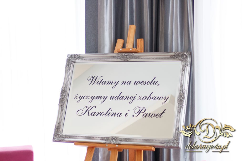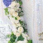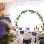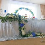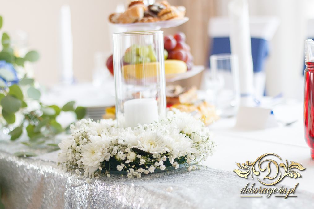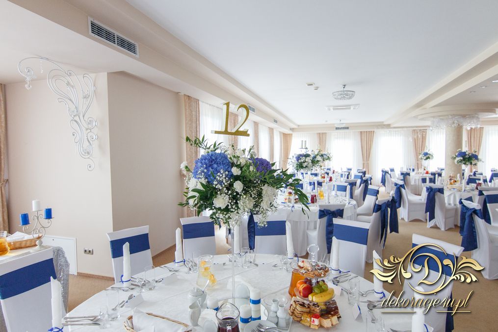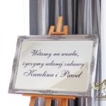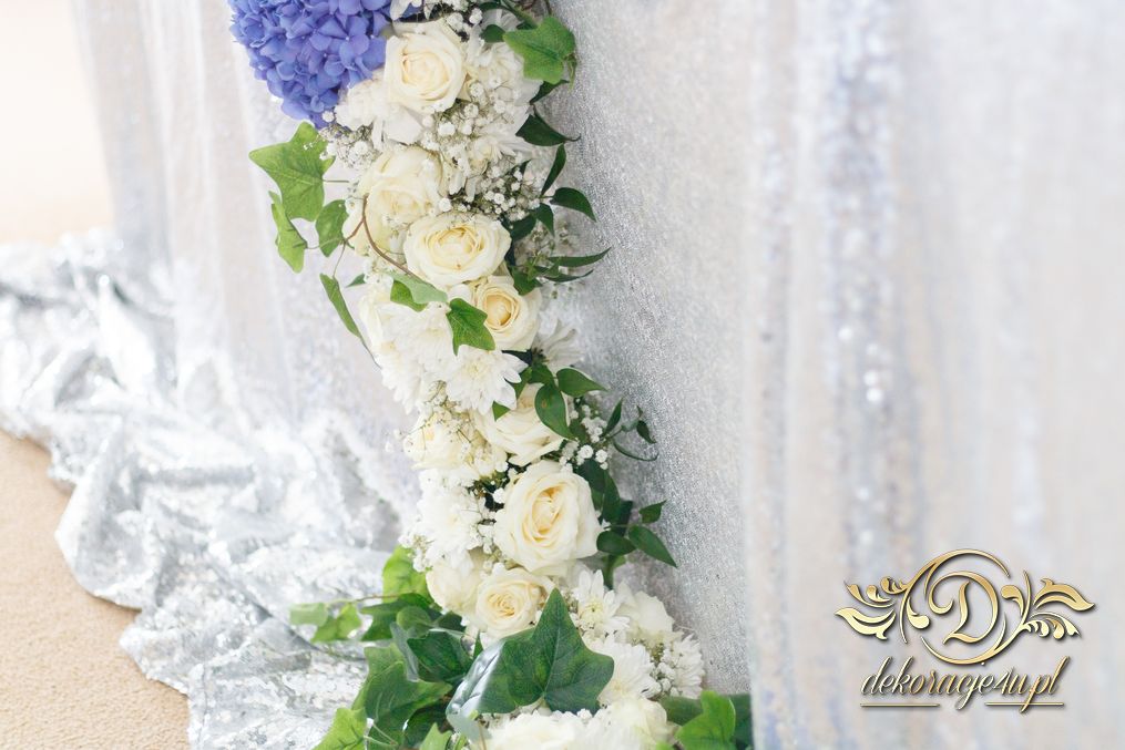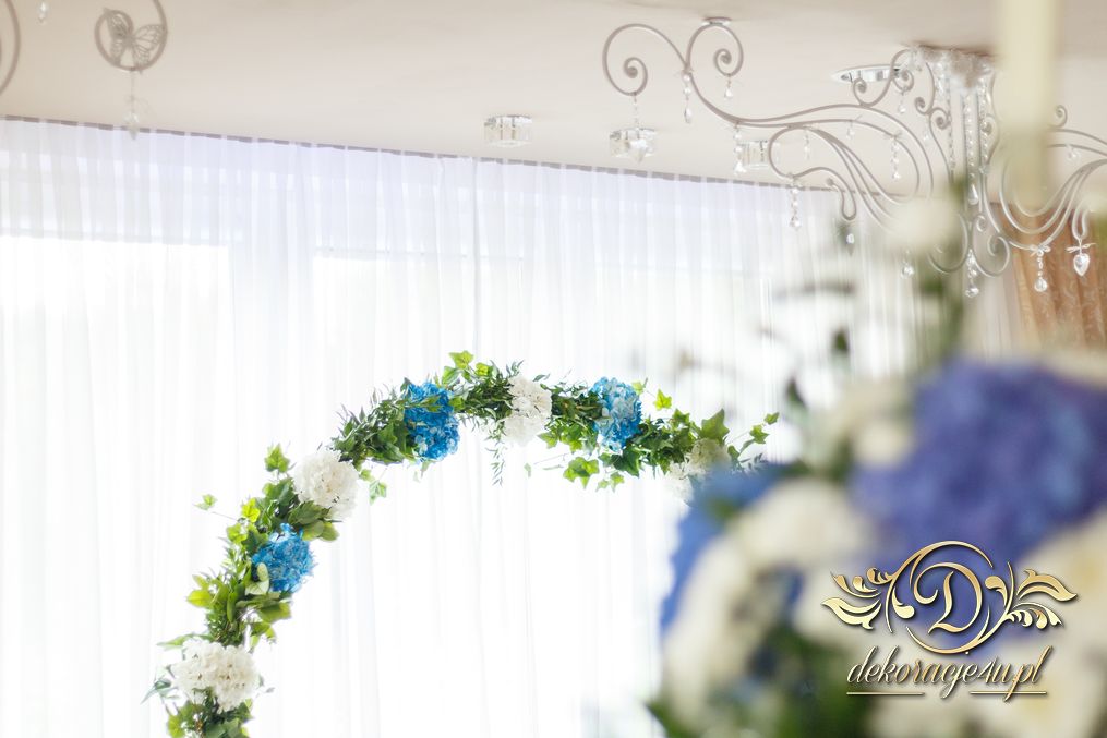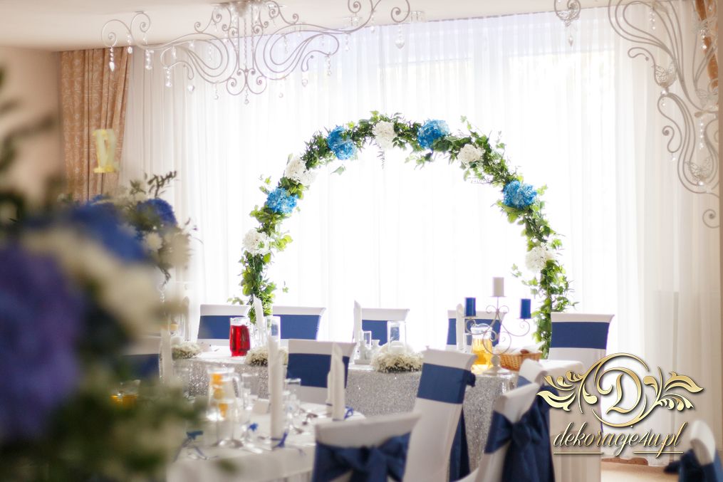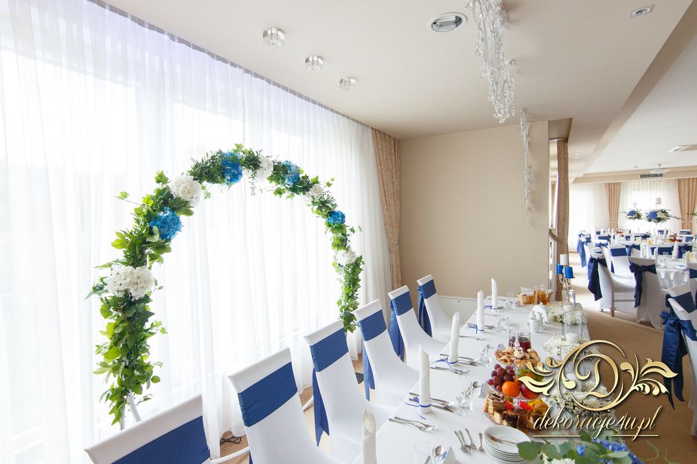 Piękny łuk z kwiatów materiałowych. Na stołach bukiety które zapierają dech w piersiach. Bankietówki na stojąco z wstążką. Na stole Młodych bukiet zwisający do ziemi.