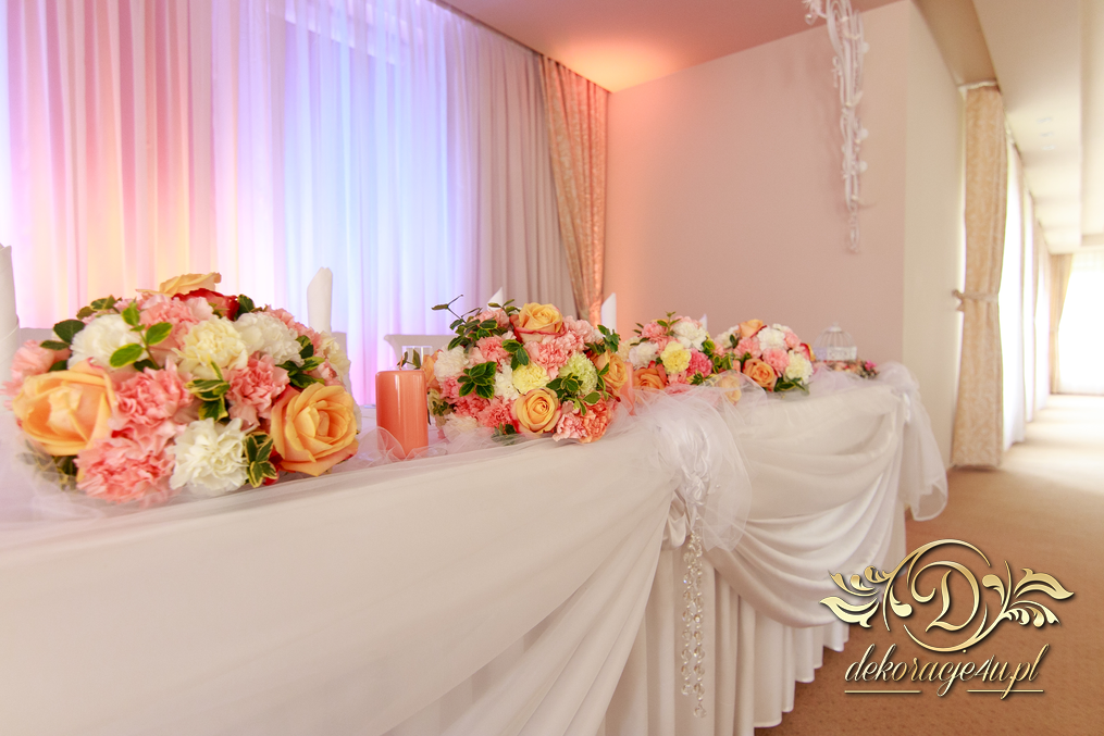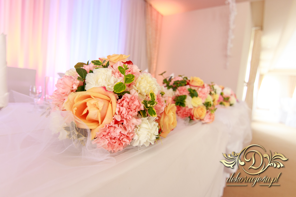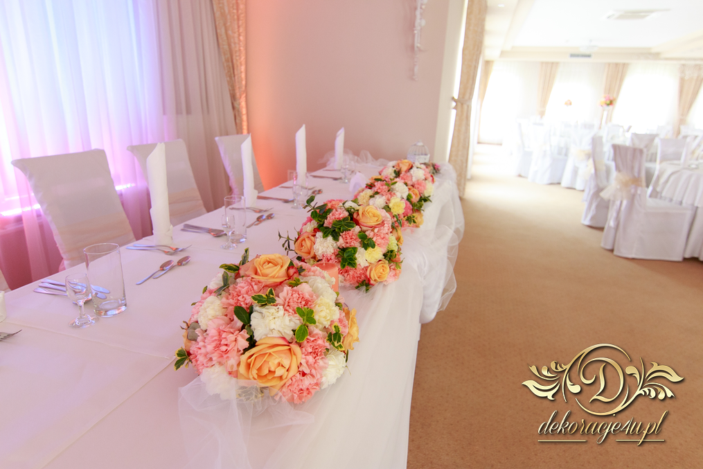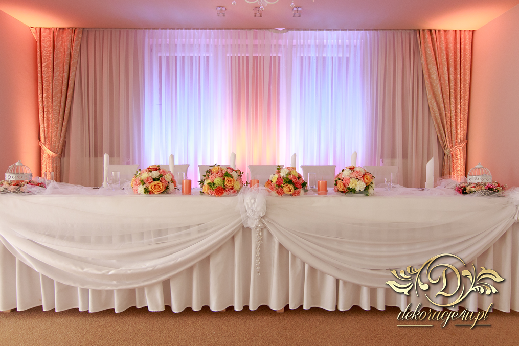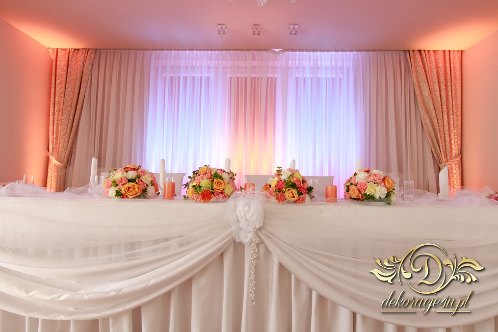 Bukiety na stoły w pięknej kolorystyce, prezydium z czterema kulkami i podświetleniem LED w kolorach pomarańczy i bieli. Efekt końcowy - piorunujący.
