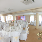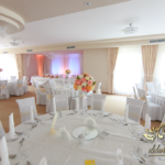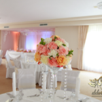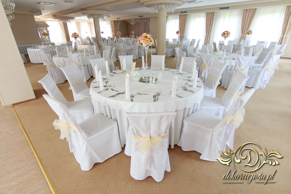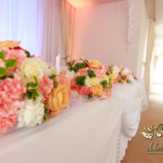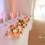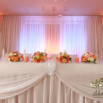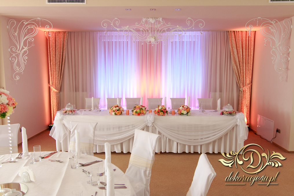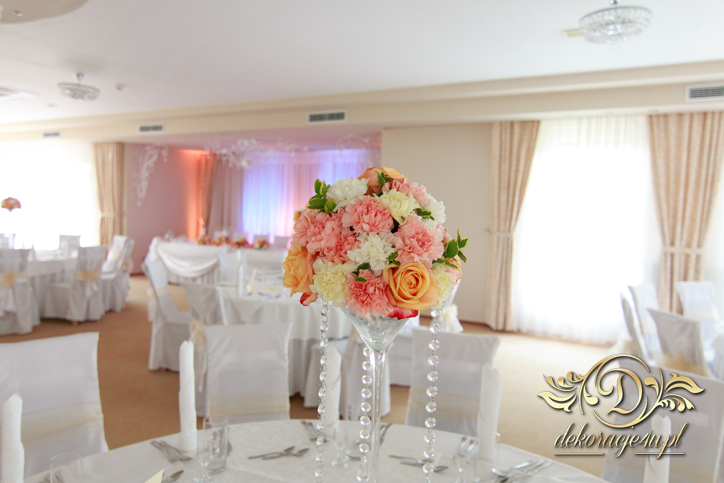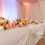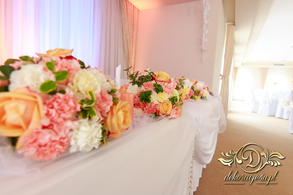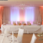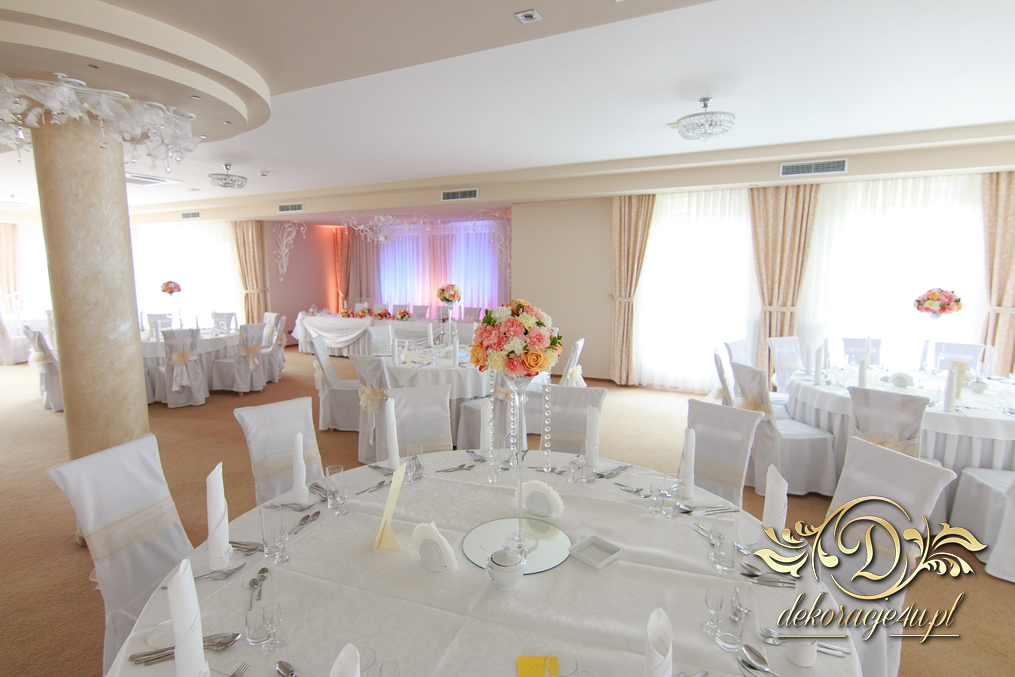 Bukiety na stoły w pięknej kolorystyce, prezydium z czterema kulkami i podświetleniem LED w kolorach pomarańczy i bieli. Efekt końcowy - piorunujący.