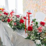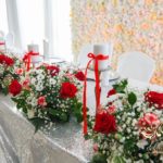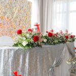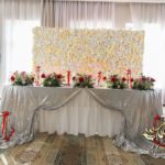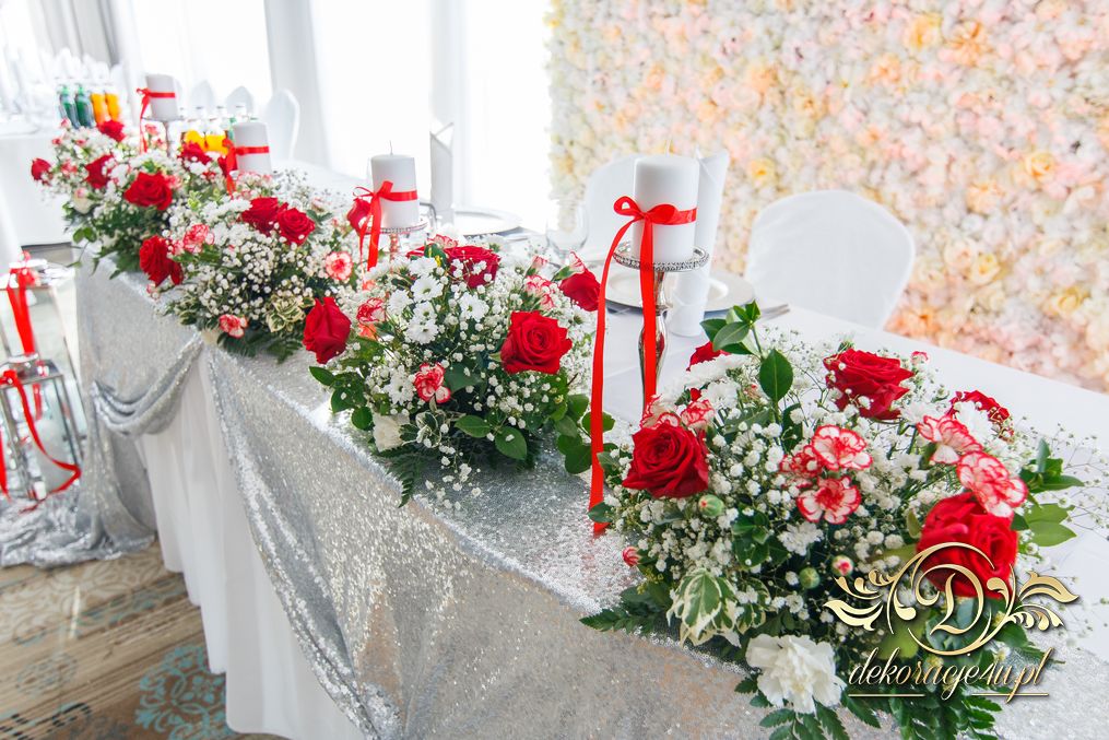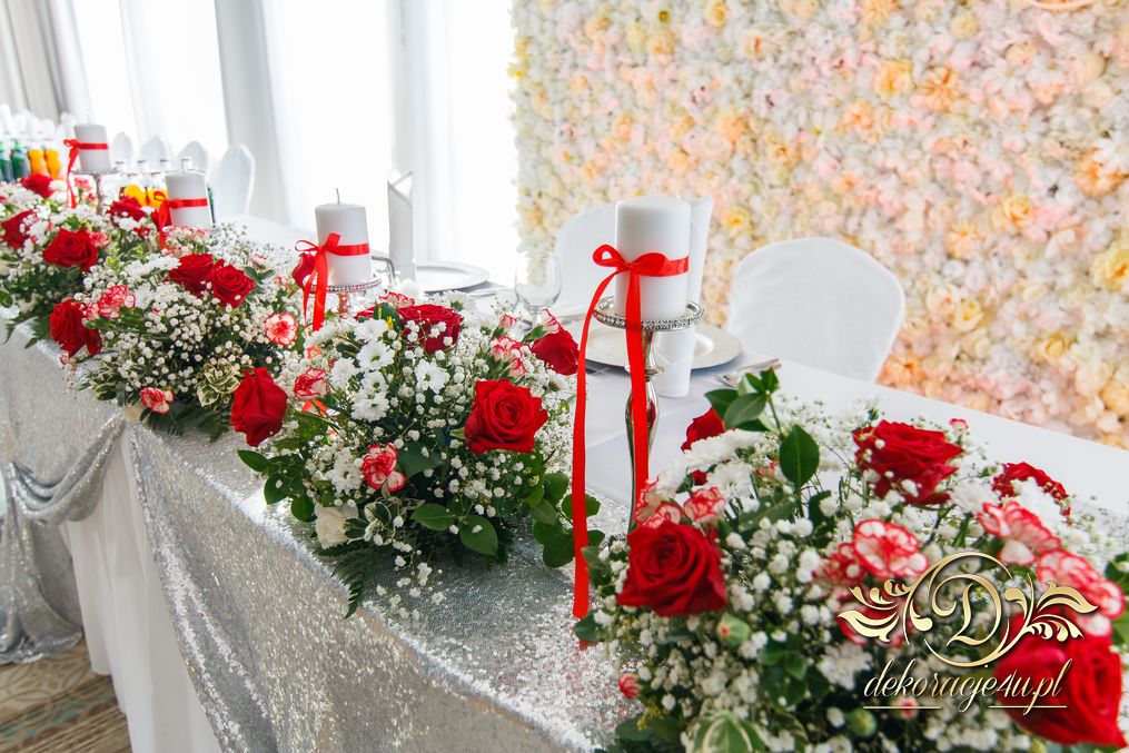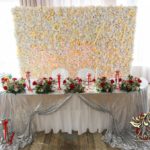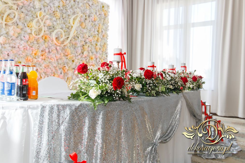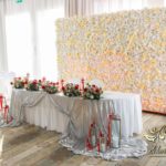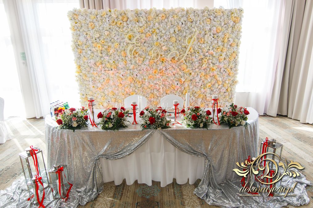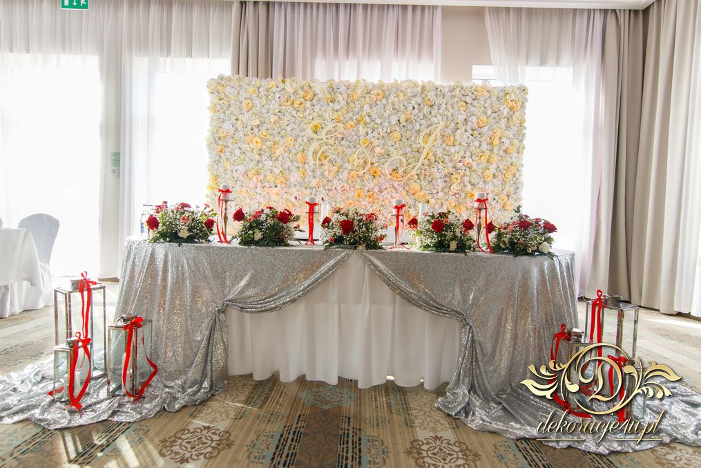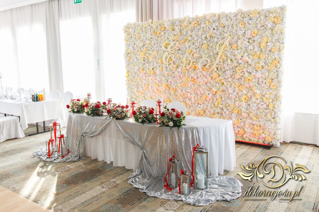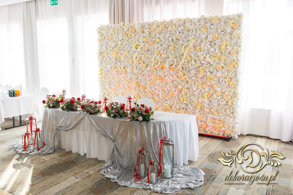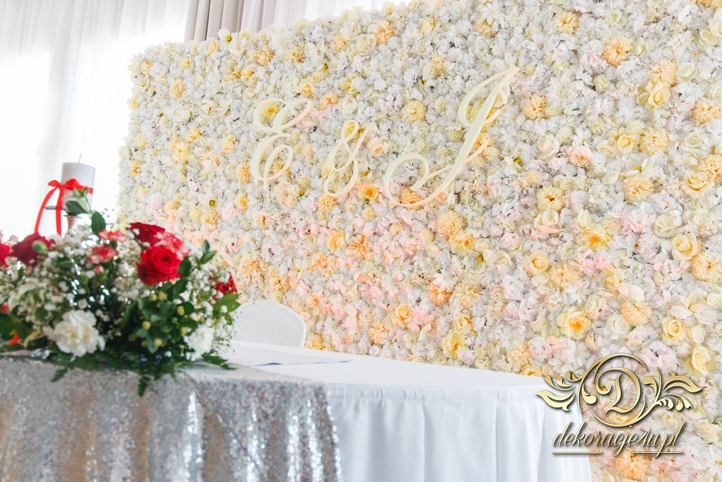 Ścianka z kwiatów materiałowych uwieczniła cudowny dzień Naszej Pary Młodej. Bukiety i dekoracja stołu prezydencjalnego.