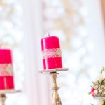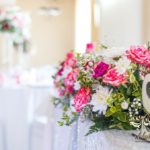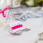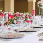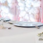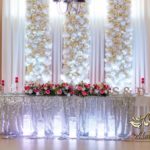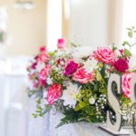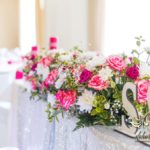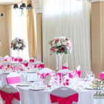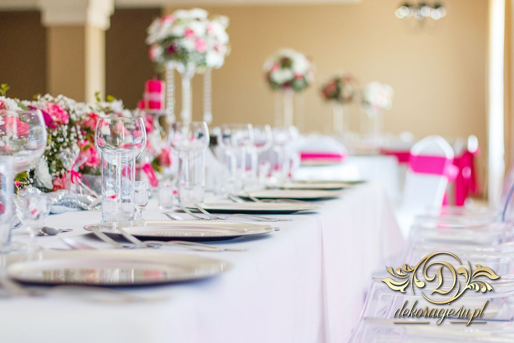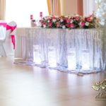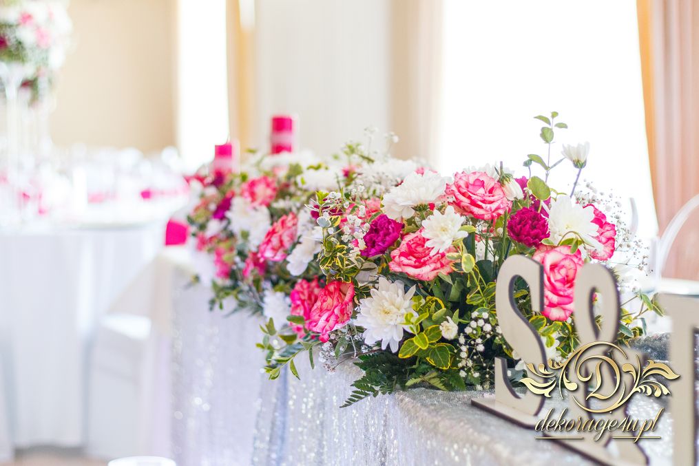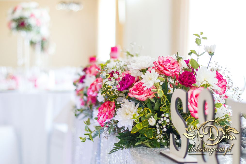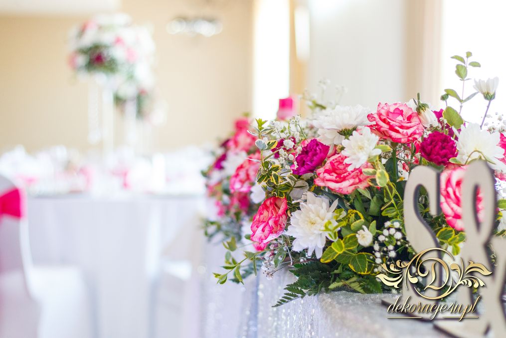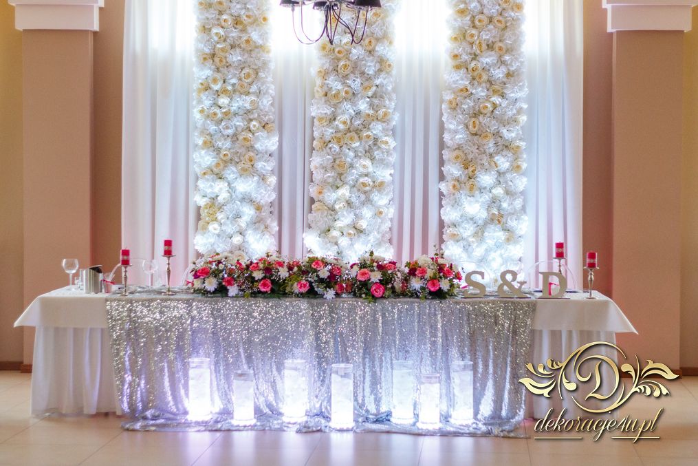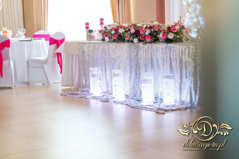 Bukiety w tonacji bieli i różu na stołach dla gości weselnych. Pod głównym stołem dla Państwa Młodych podświetlone tuby.