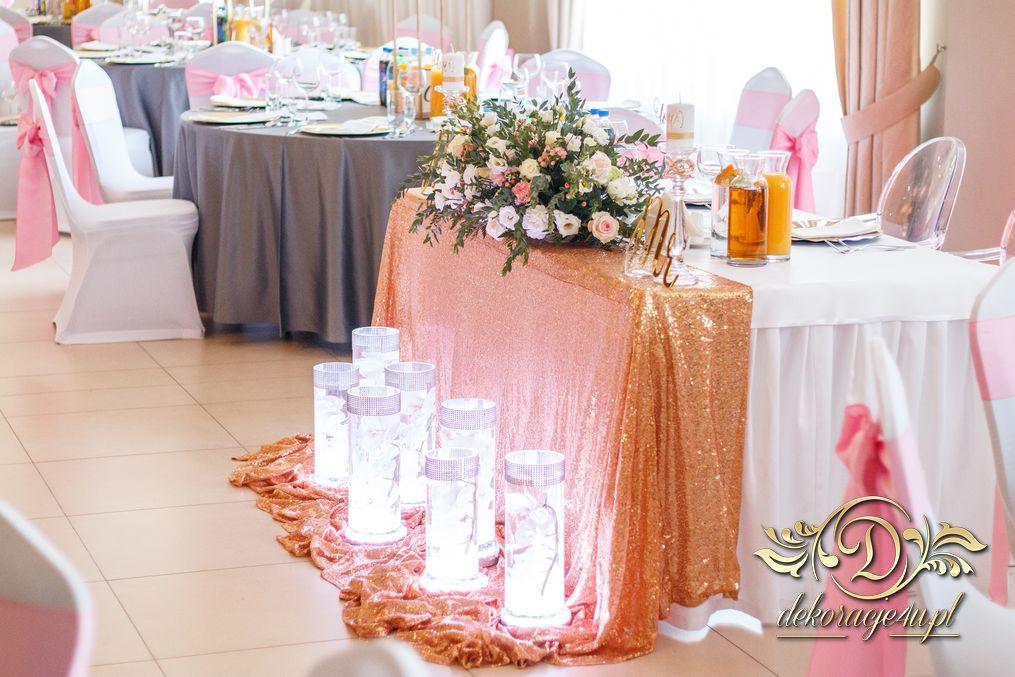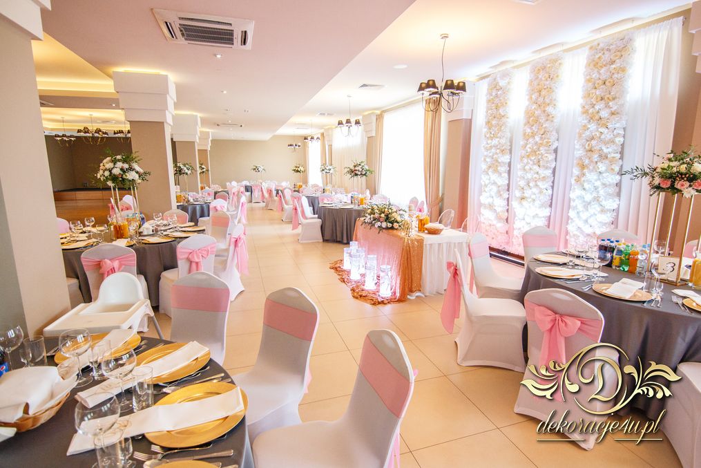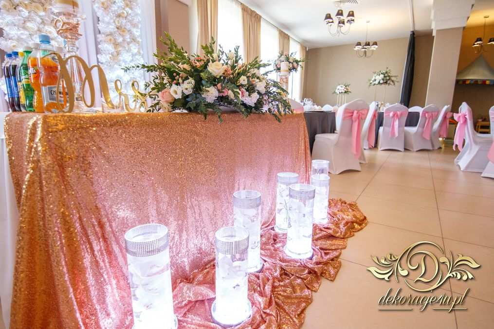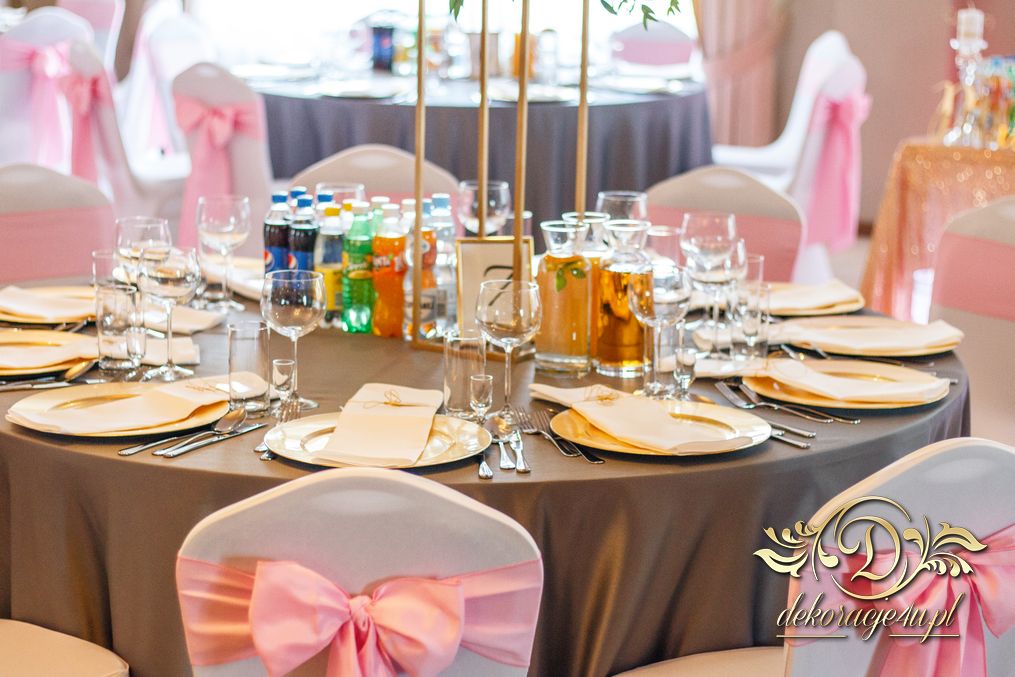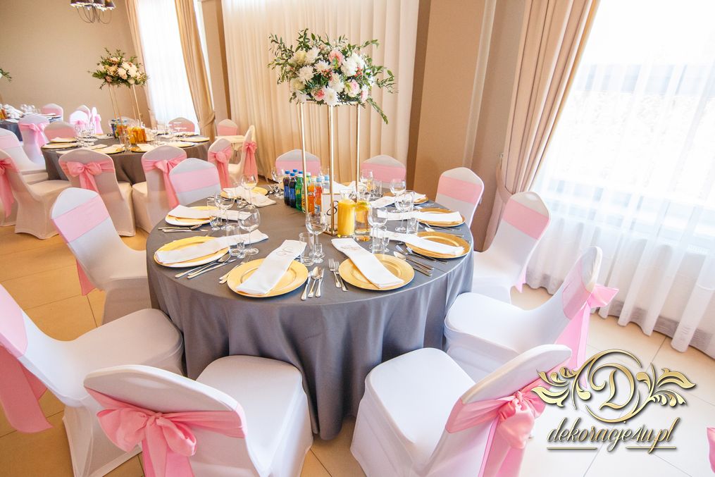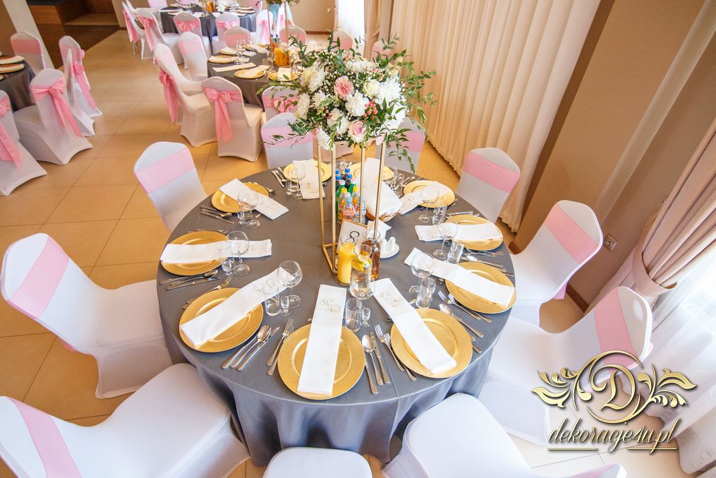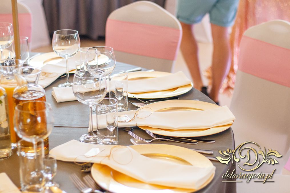 Złote podtalerze, które można u nas zamówić zagościły w Aura Nova. Bukiety i zawsze cudne wazony podświetlone przed stołem prezydencjalnym. Na krzesłach szarfy w odmiennej tonacji tj. jasny róż.