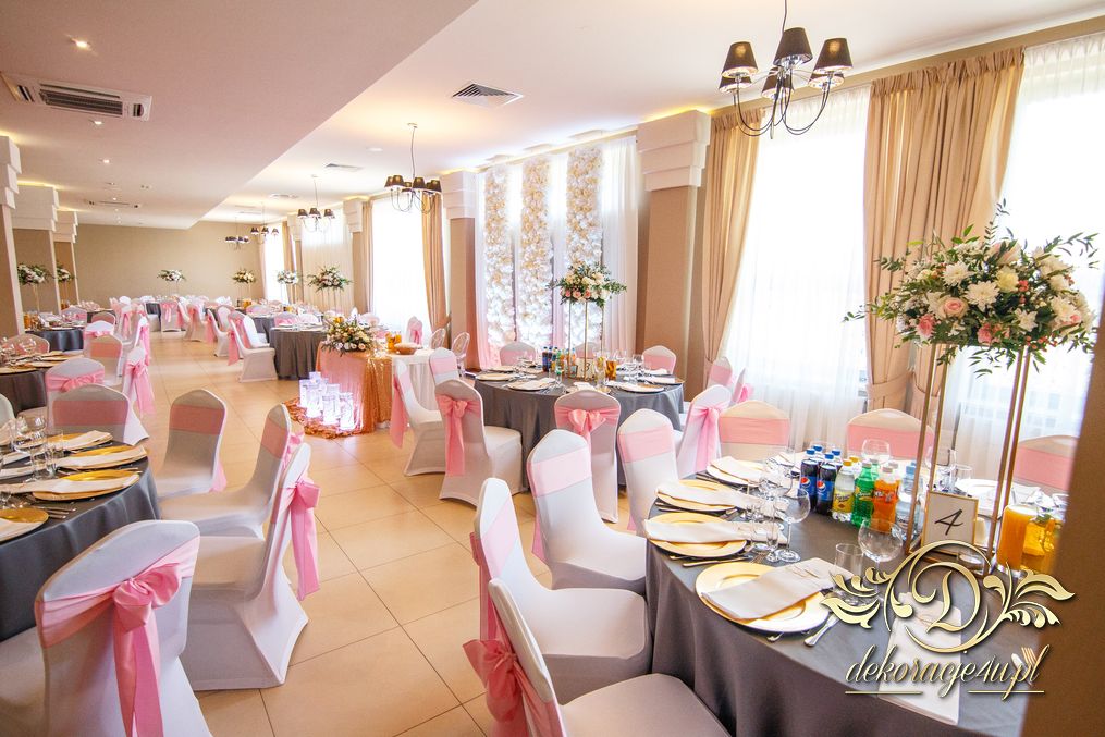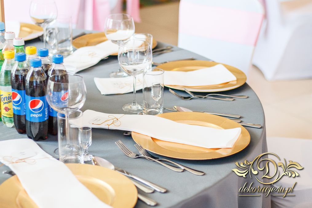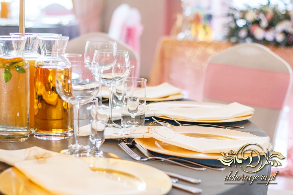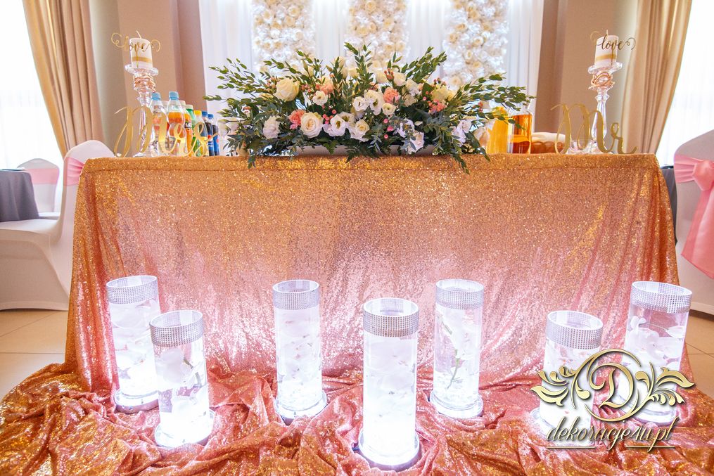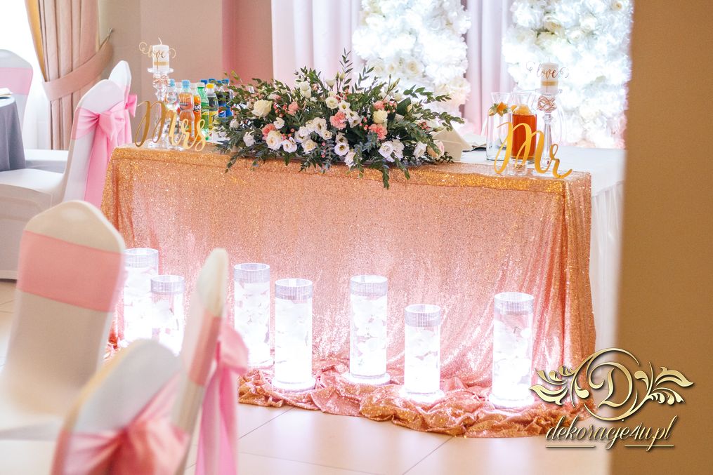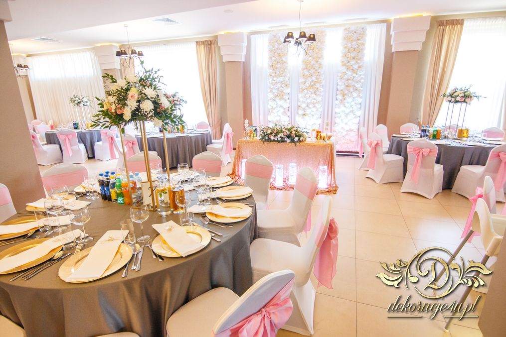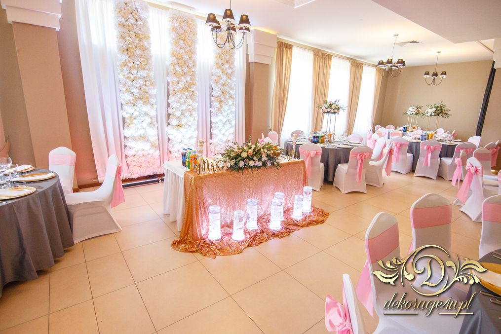 Złote podtalerze, które można u nas zamówić zagościły w Aura Nova. Bukiety i zawsze cudne wazony podświetlone przed stołem prezydencjalnym. Na krzesłach szarfy w odmiennej tonacji tj. jasny róż.
