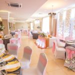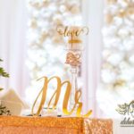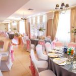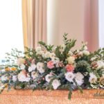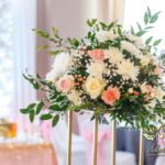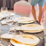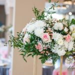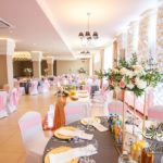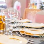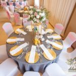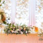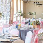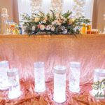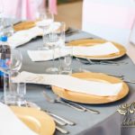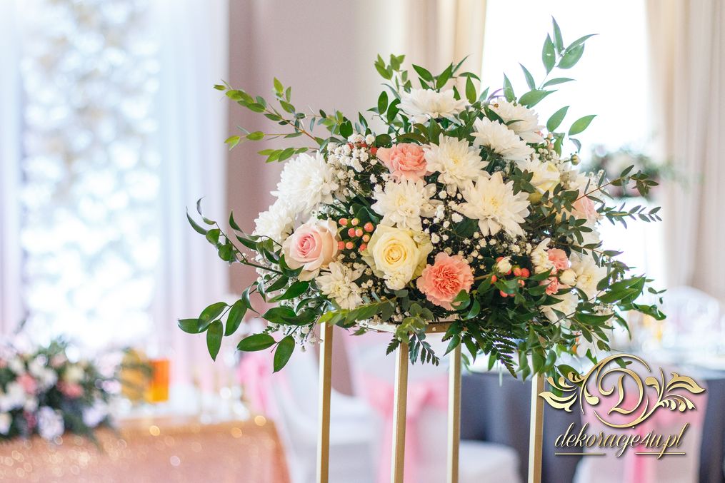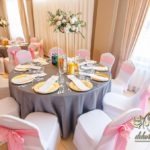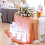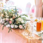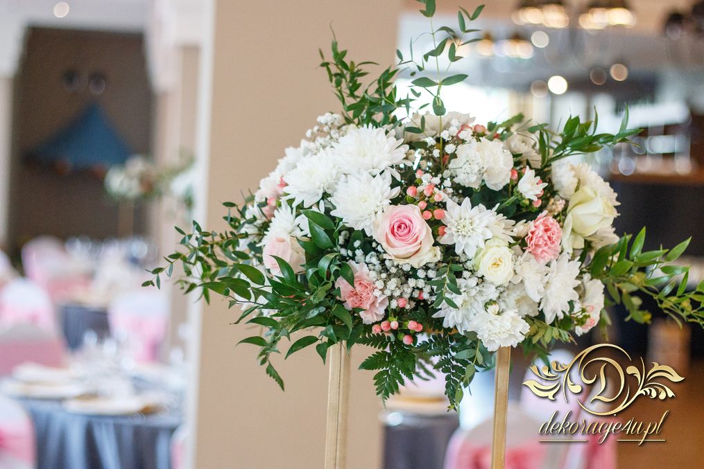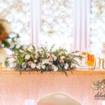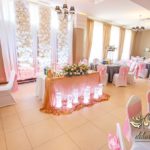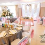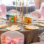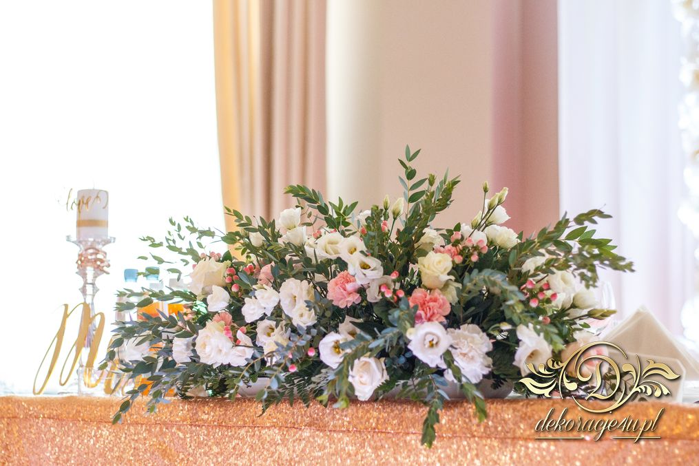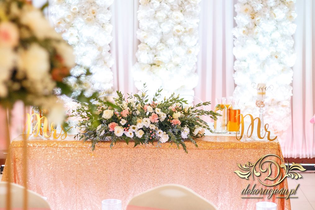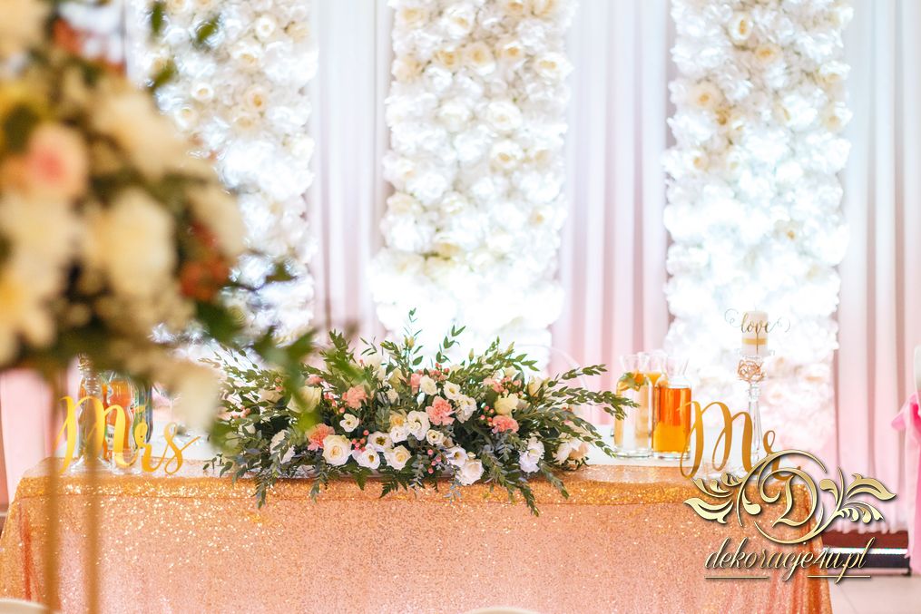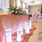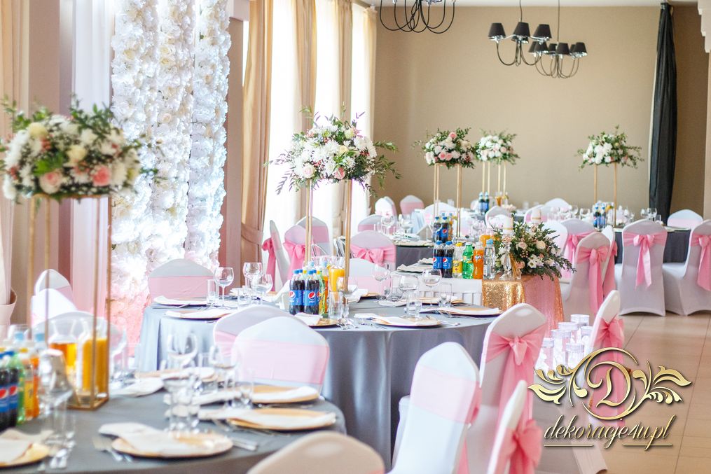 Złote podtalerze, które można u nas zamówić zagościły w Aura Nova. Bukiety i zawsze cudne wazony podświetlone przed stołem prezydencjalnym. Na krzesłach szarfy w odmiennej tonacji tj. jasny róż.