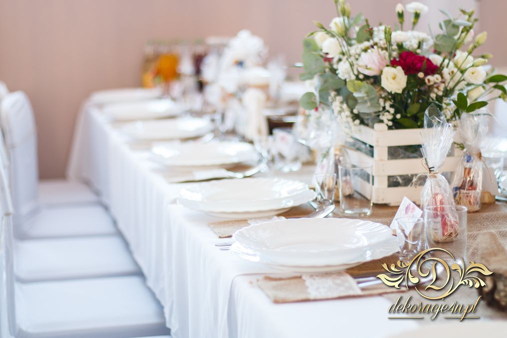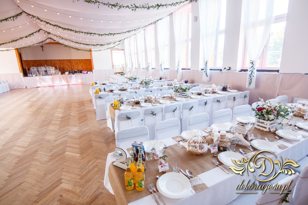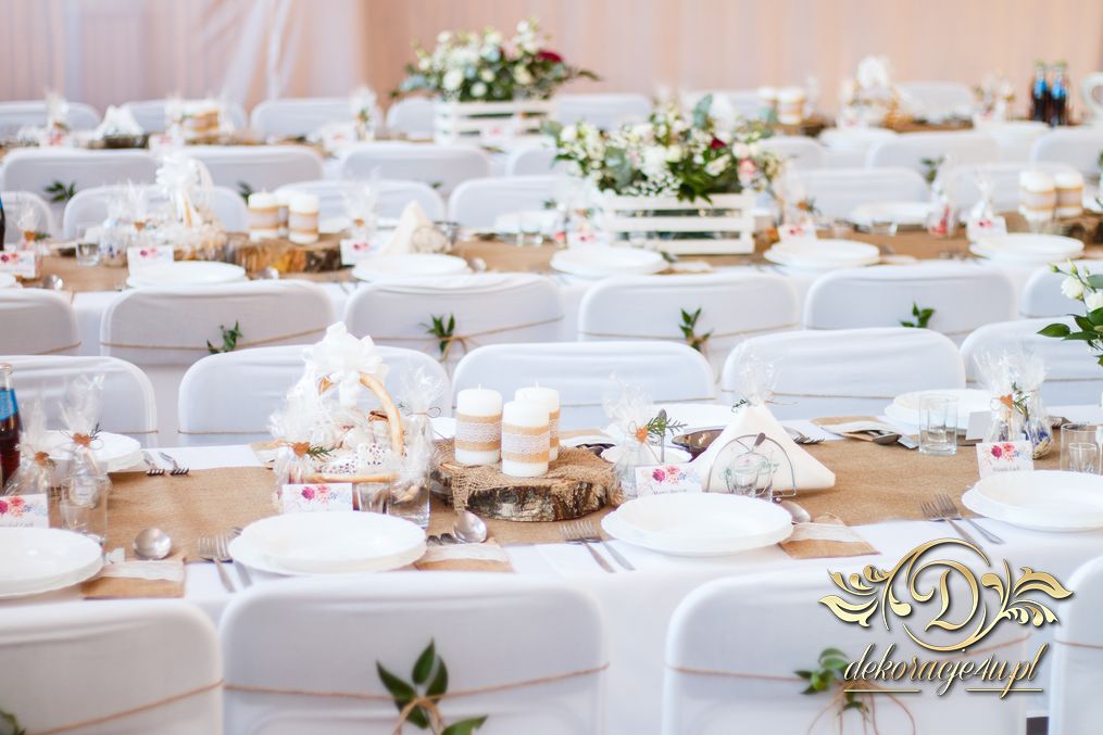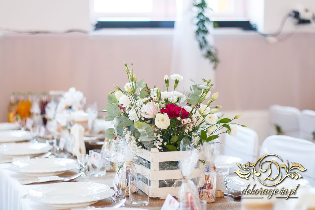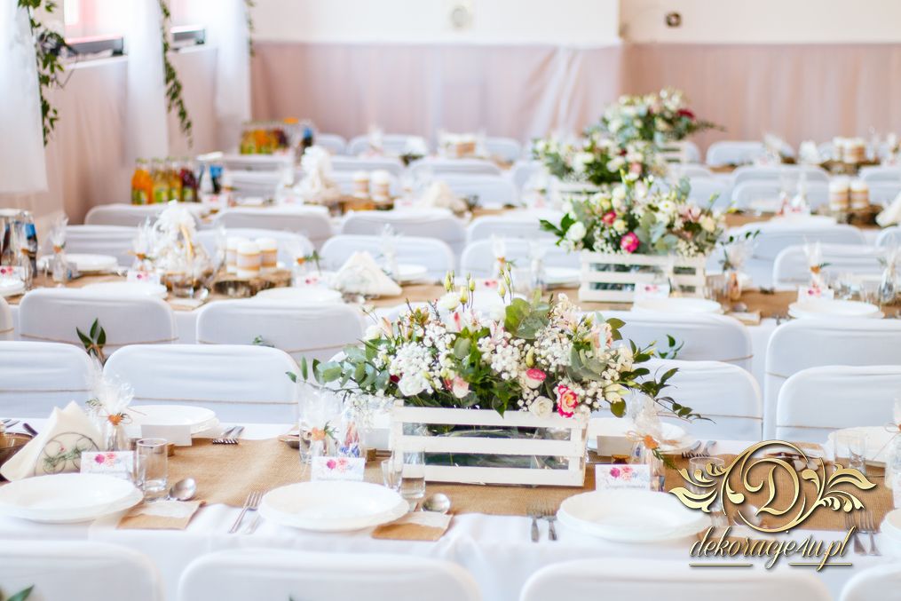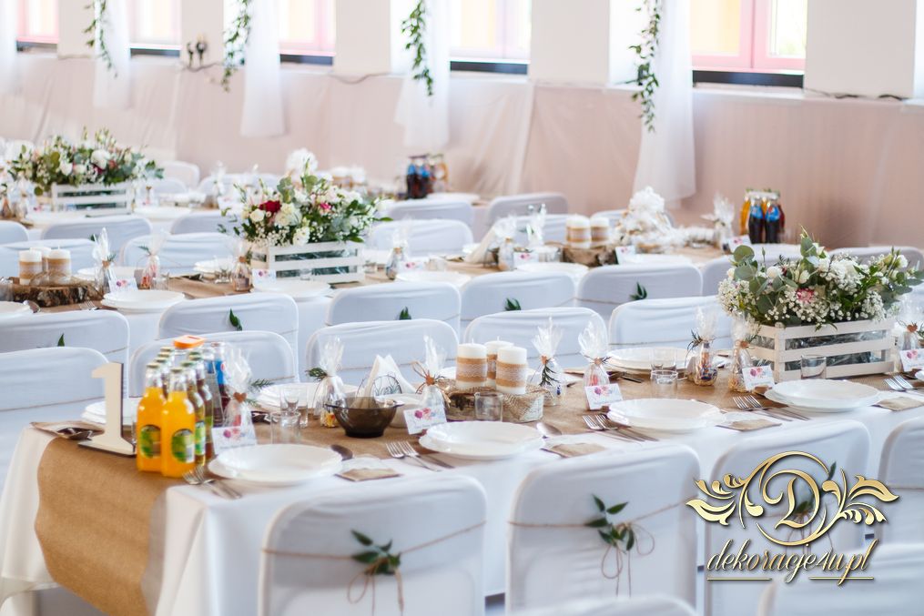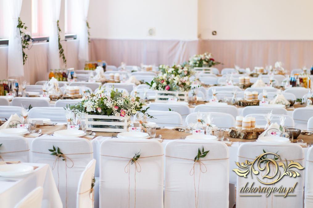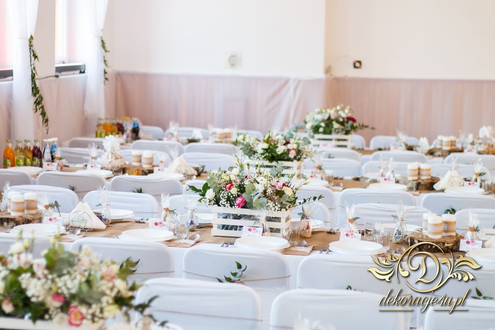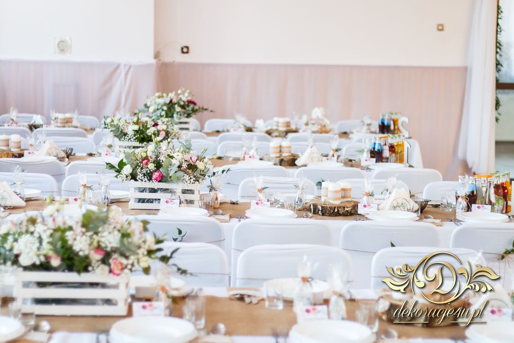 Sufit z ruskusem, ścianka drewniana. To nasze ostatnie realizacje w których się zakochujemy w miejscu. Na stołach bukiety w białych skrzynkach, a dodatkowo widelce w specjalnych kieszonkach pasujących do całości dekoracji.