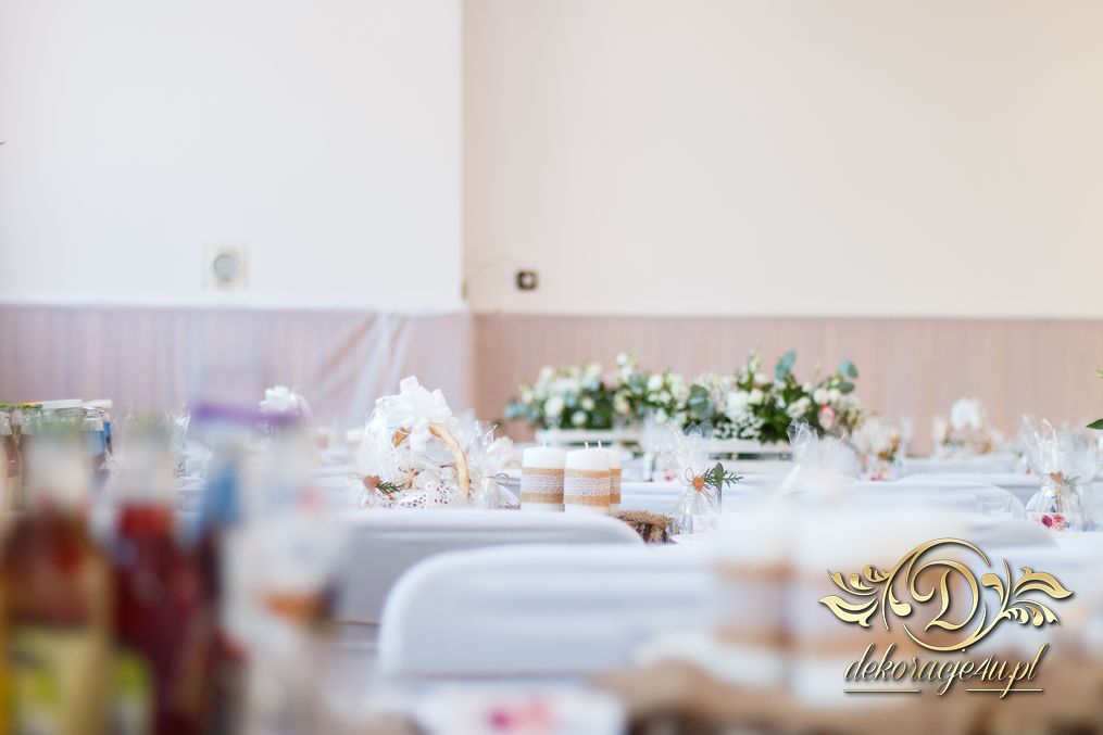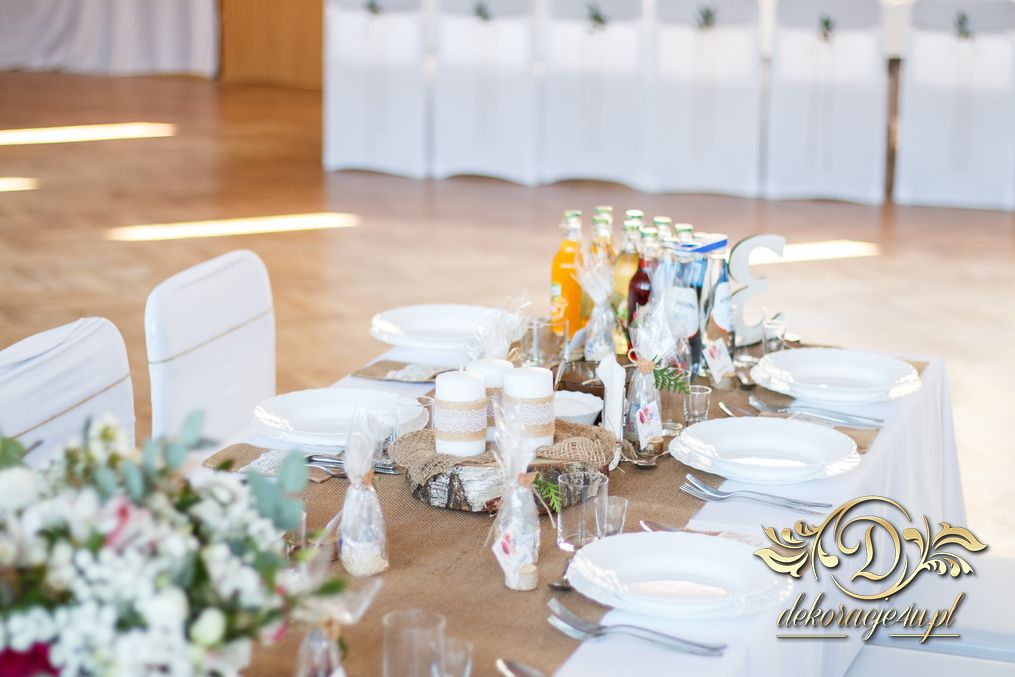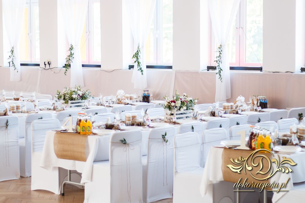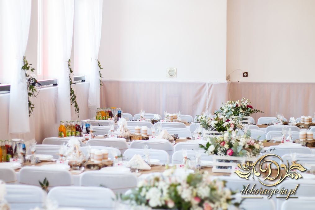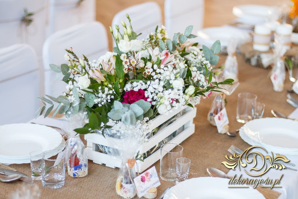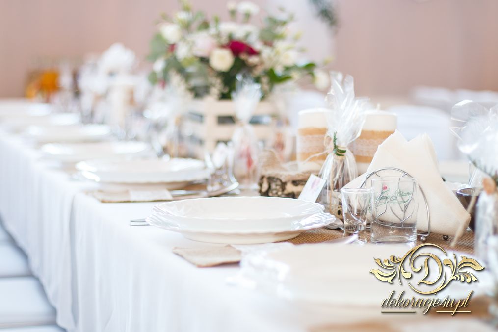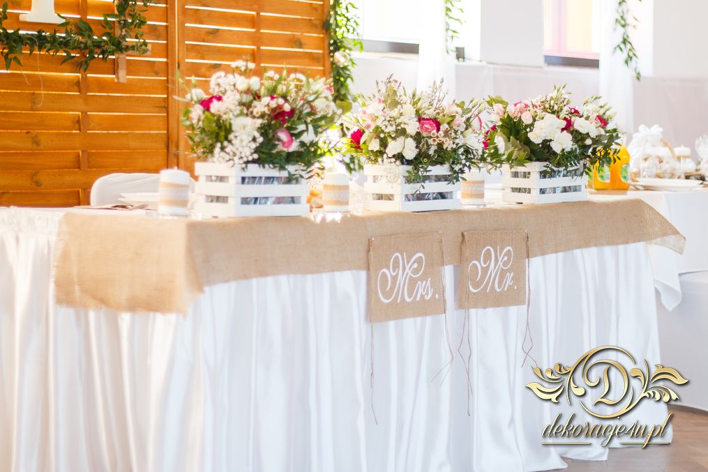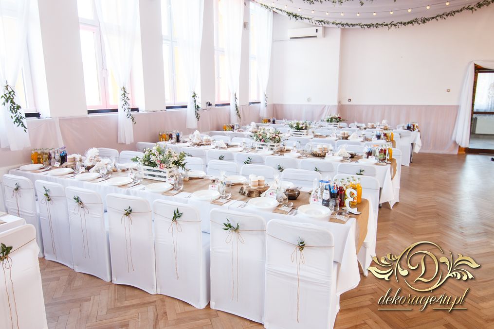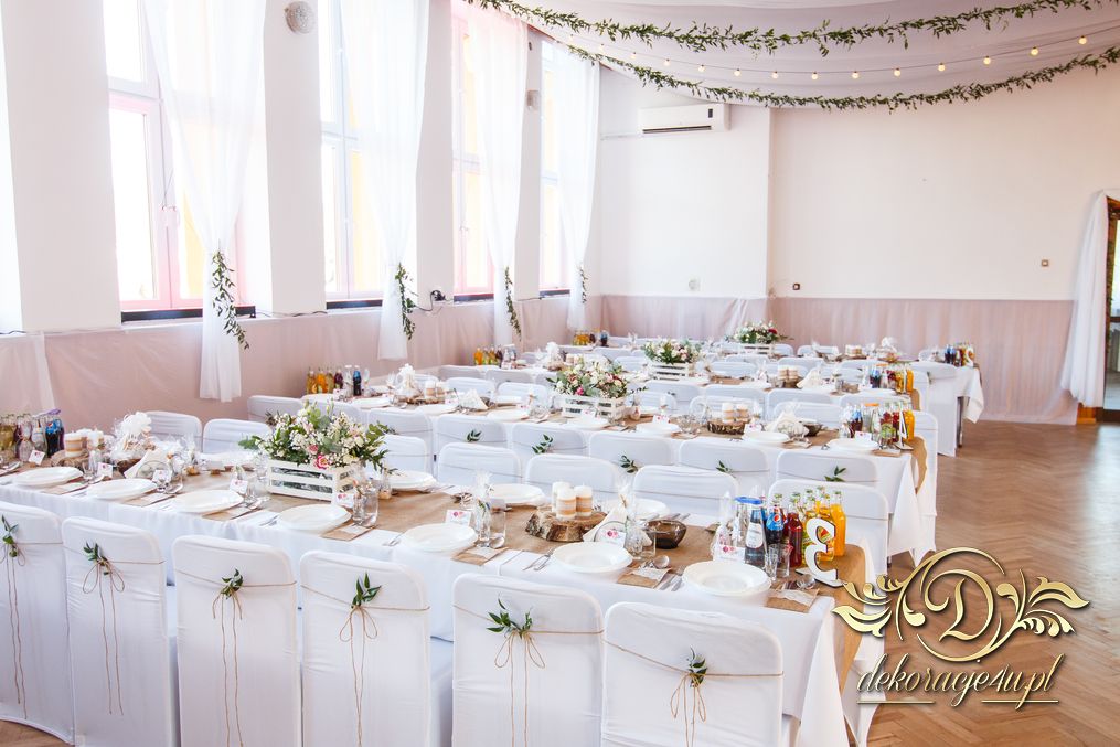 Sufit z ruskusem, ścianka drewniana. To nasze ostatnie realizacje w których się zakochujemy w miejscu. Na stołach bukiety w białych skrzynkach, a dodatkowo widelce w specjalnych kieszonkach pasujących do całości dekoracji.