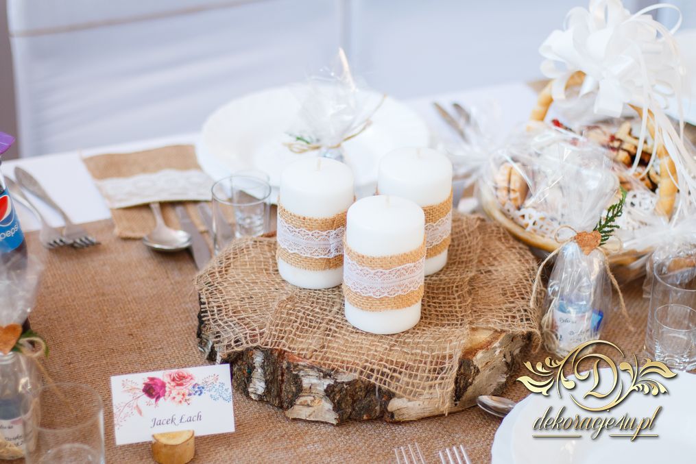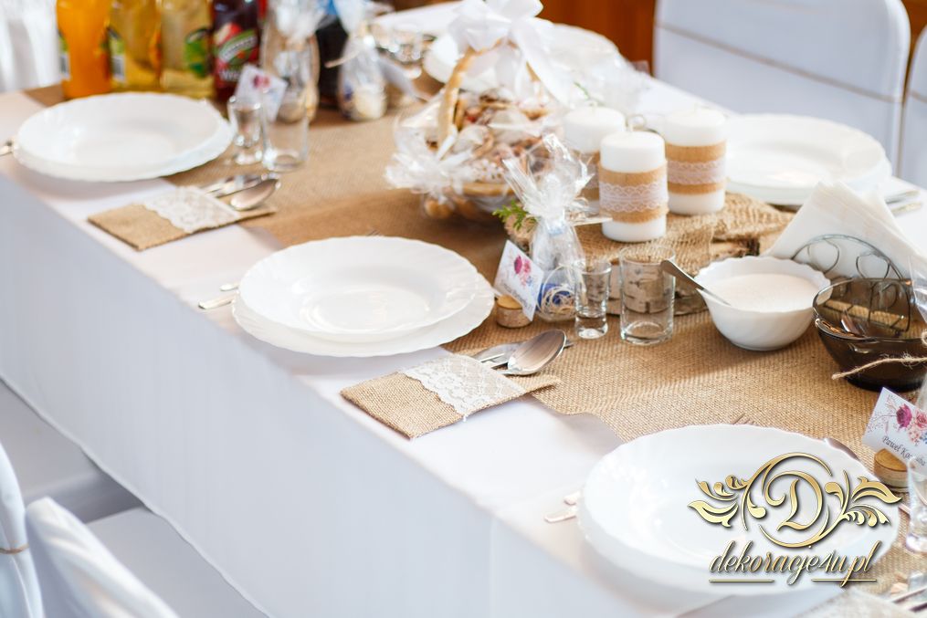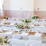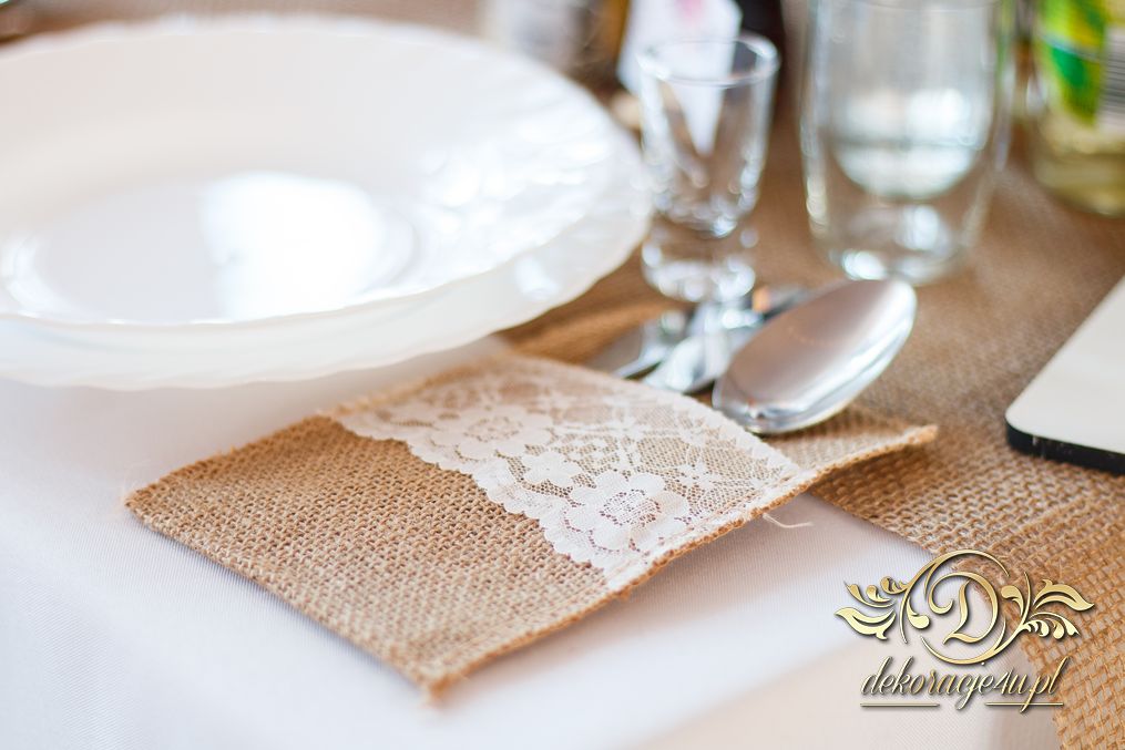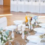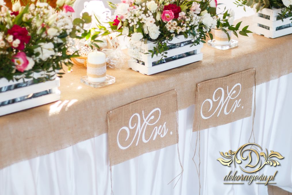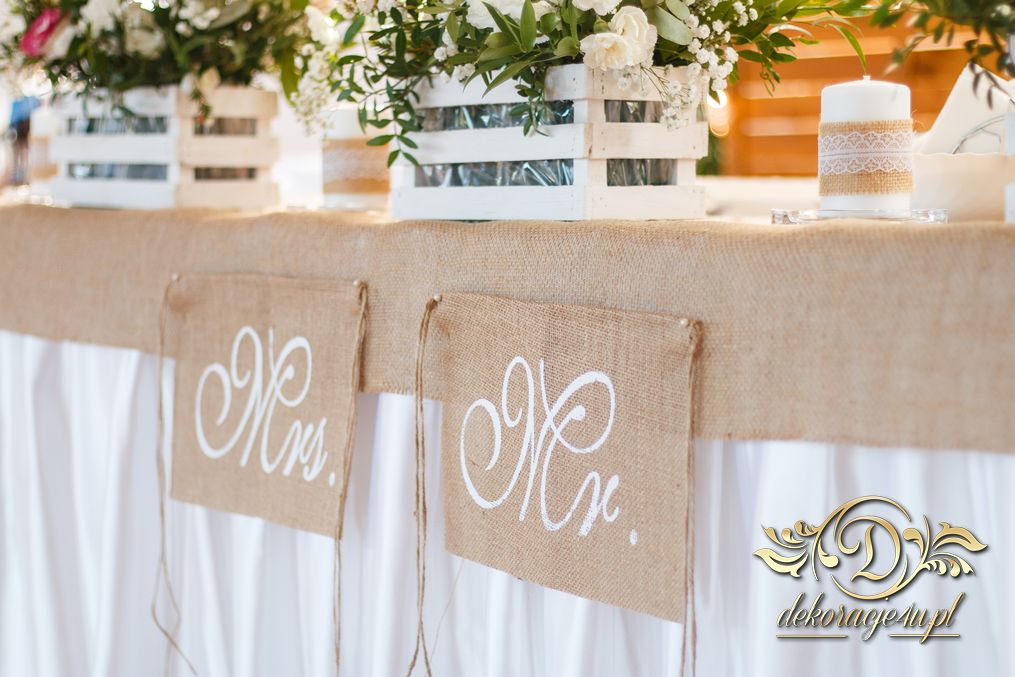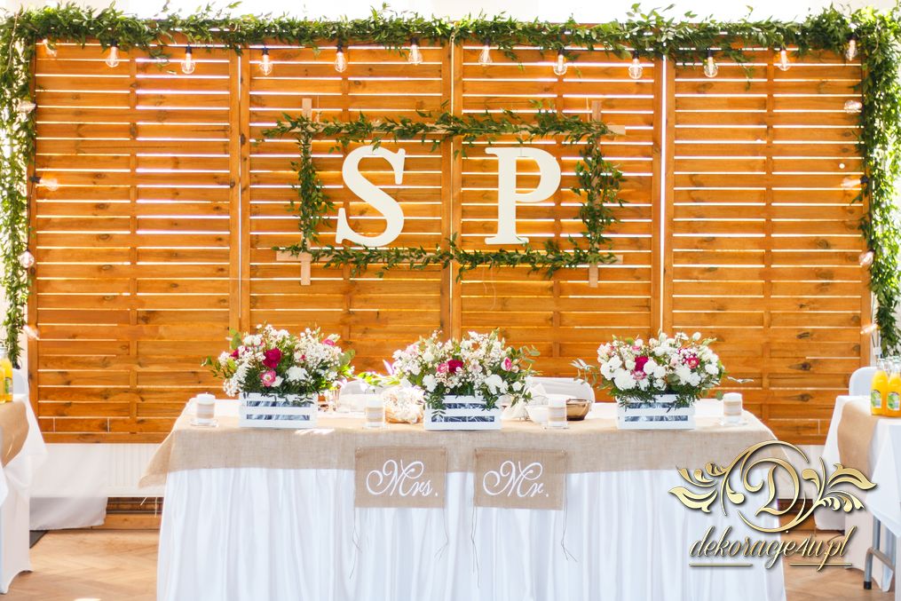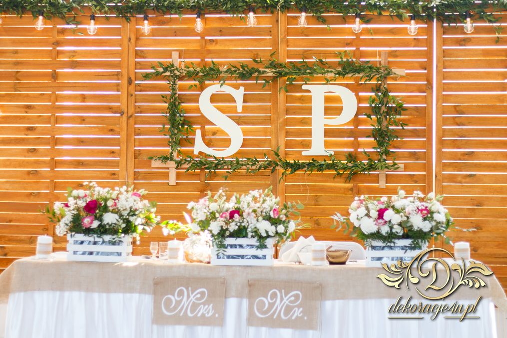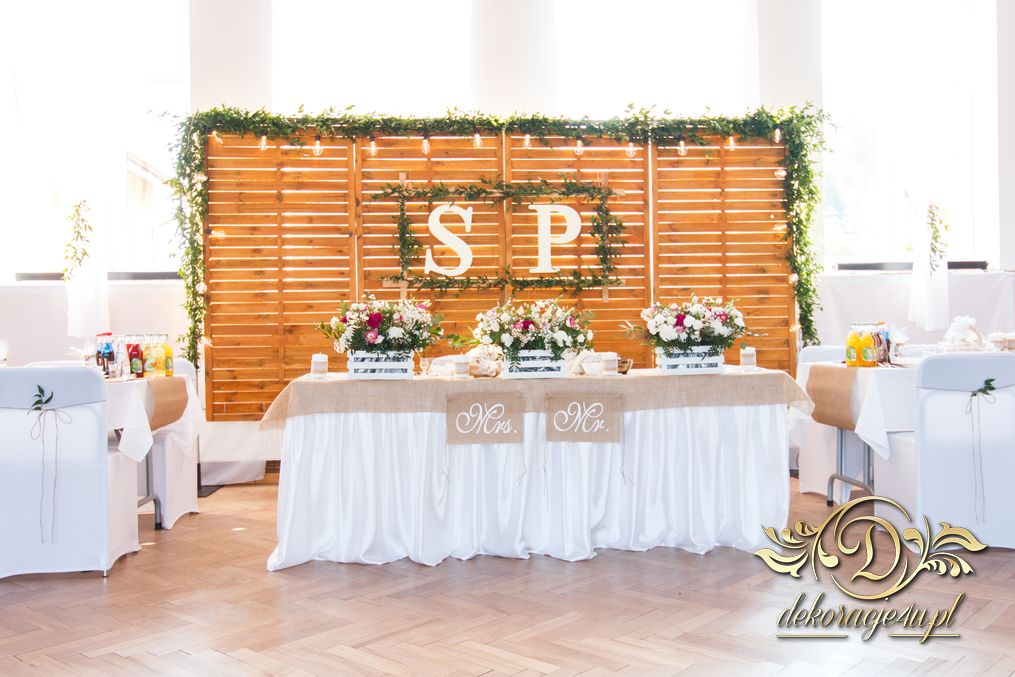 Sufit z ruskusem, ścianka drewniana. To nasze ostatnie realizacje w których się zakochujemy w miejscu. Na stołach bukiety w białych skrzynkach, a dodatkowo widelce w specjalnych kieszonkach pasujących do całości dekoracji.