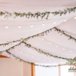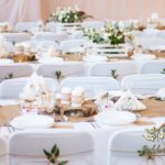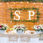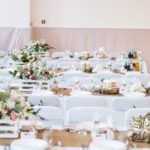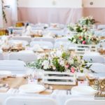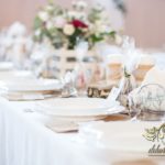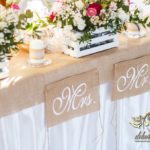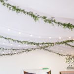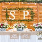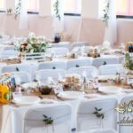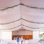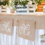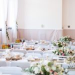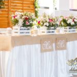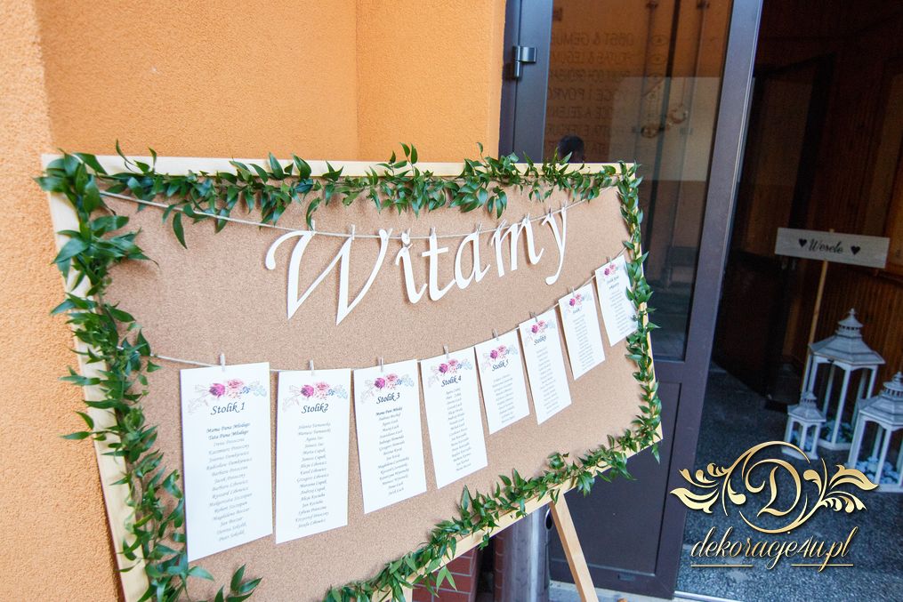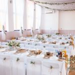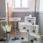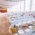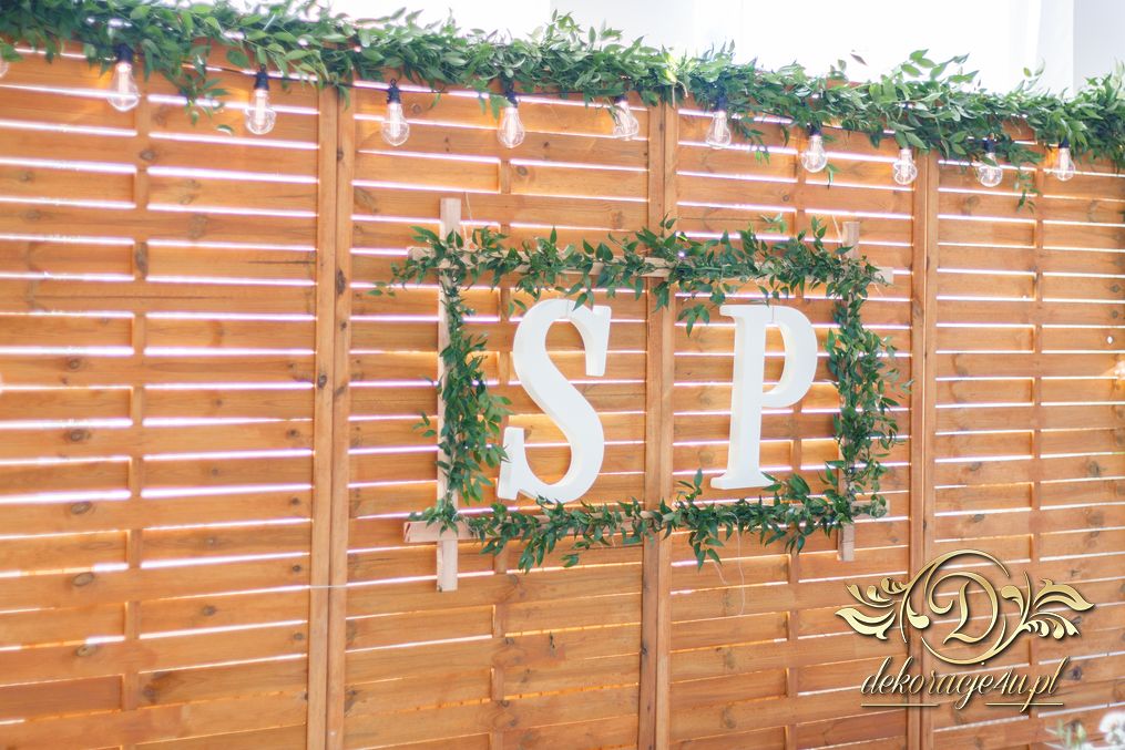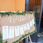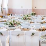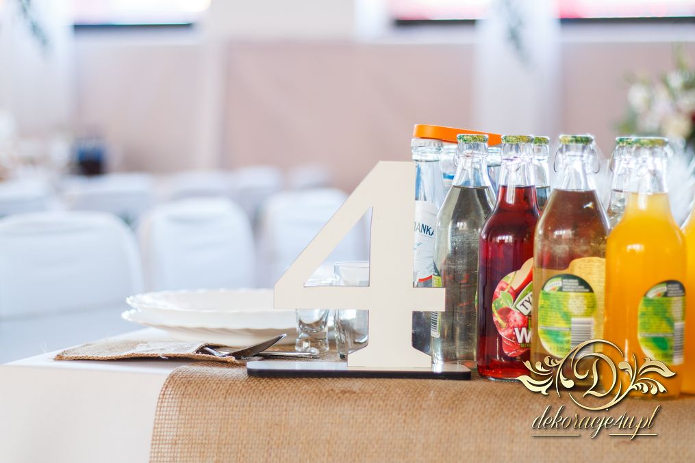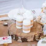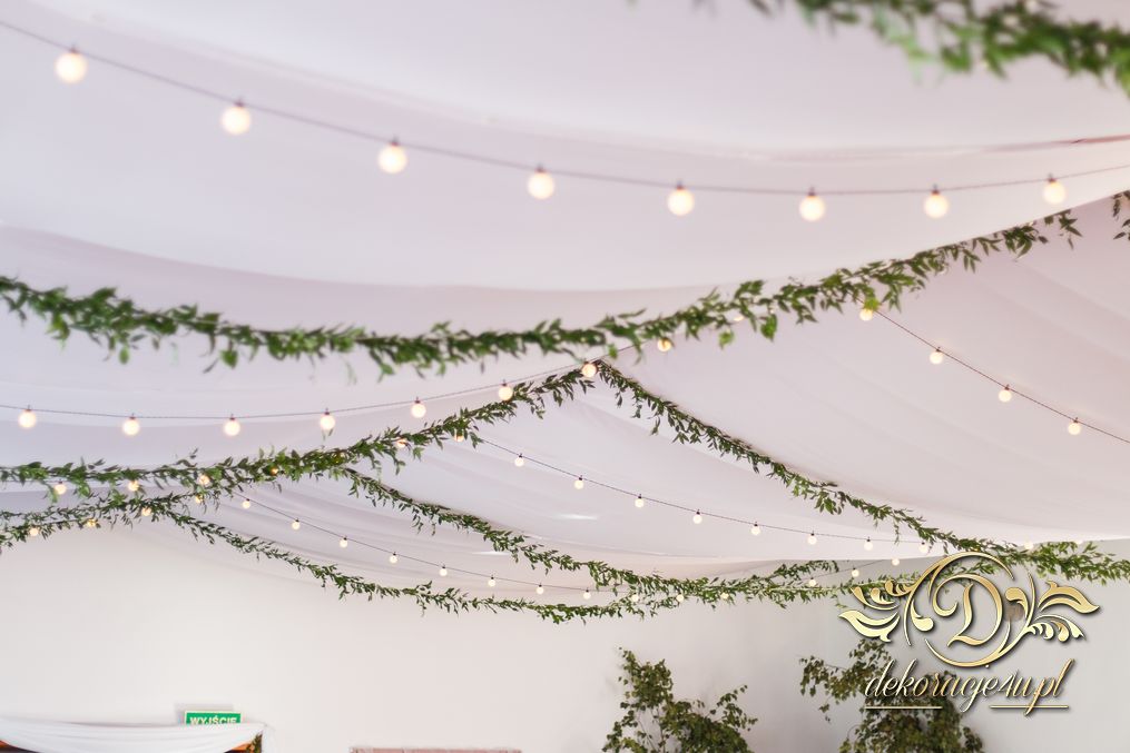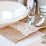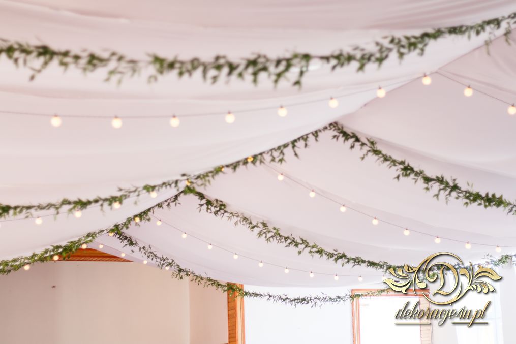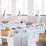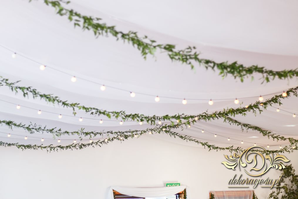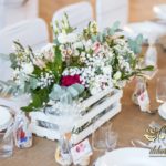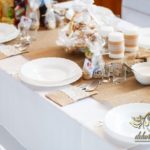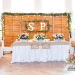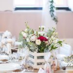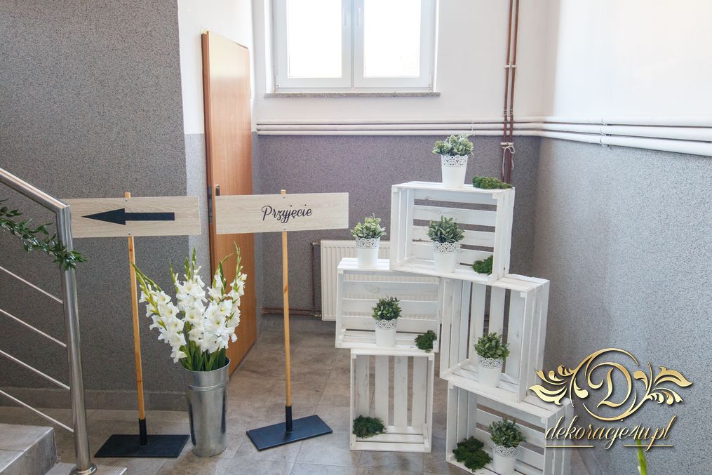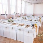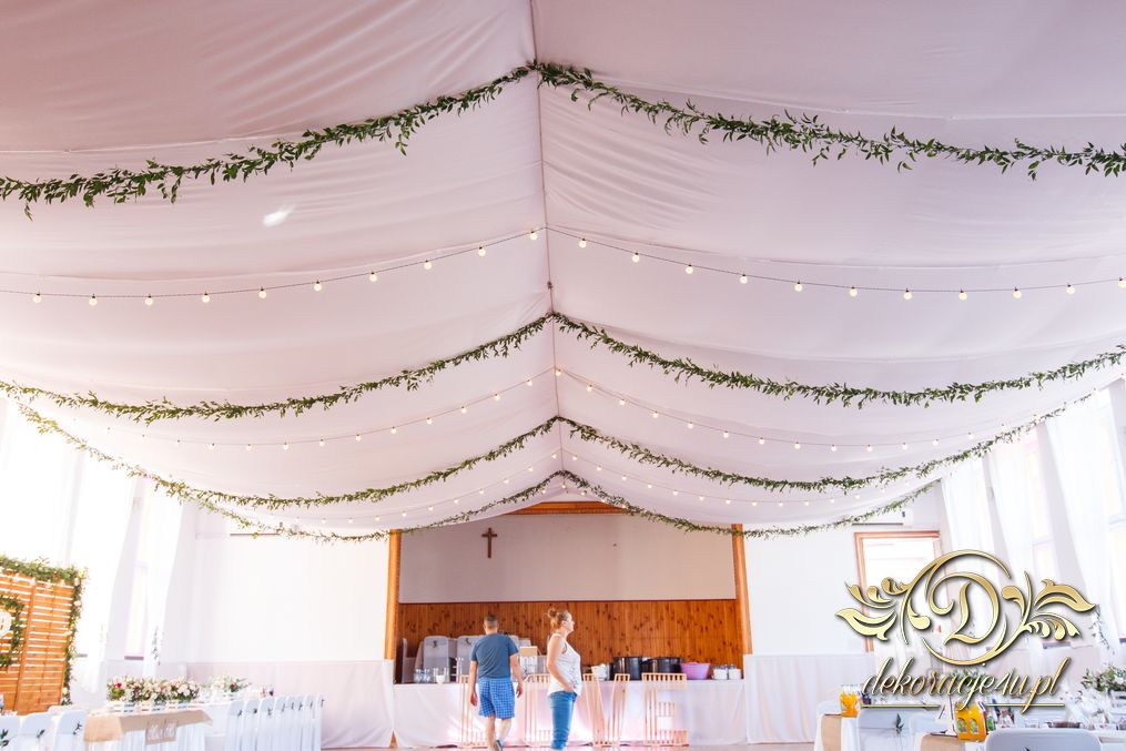 Sufit z ruskusem, ścianka drewniana. To nasze ostatnie realizacje w których się zakochujemy w miejscu. Na stołach bukiety w białych skrzynkach, a dodatkowo widelce w specjalnych kieszonkach pasujących do całości dekoracji.
