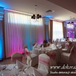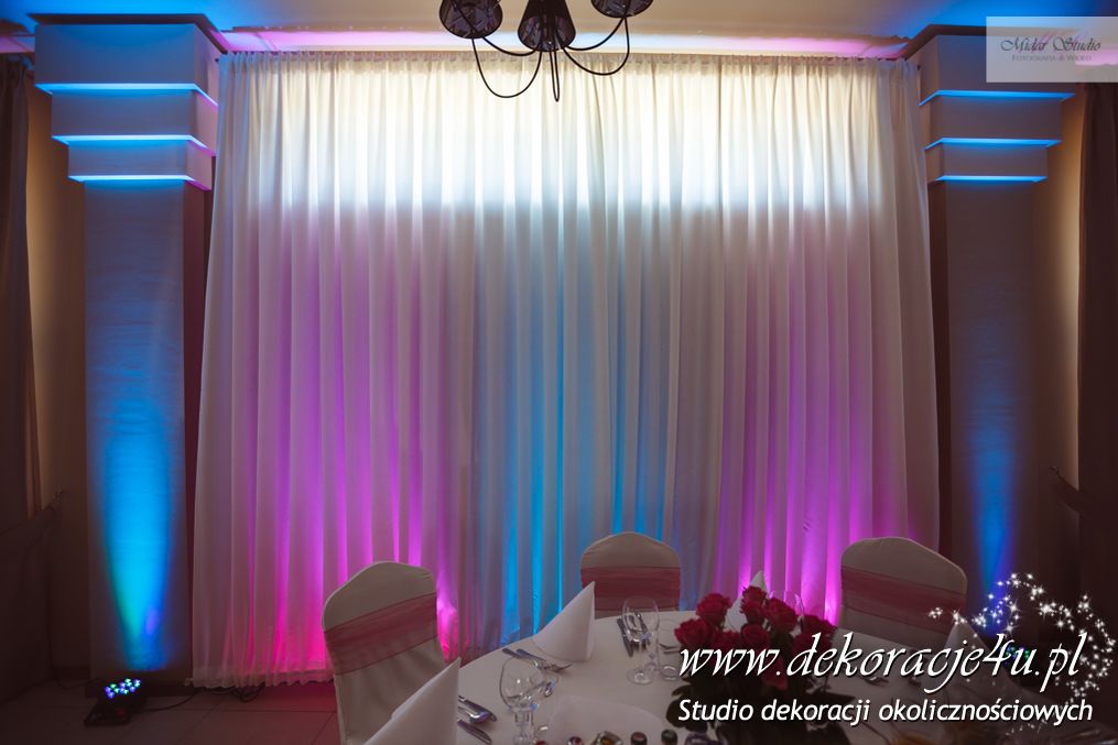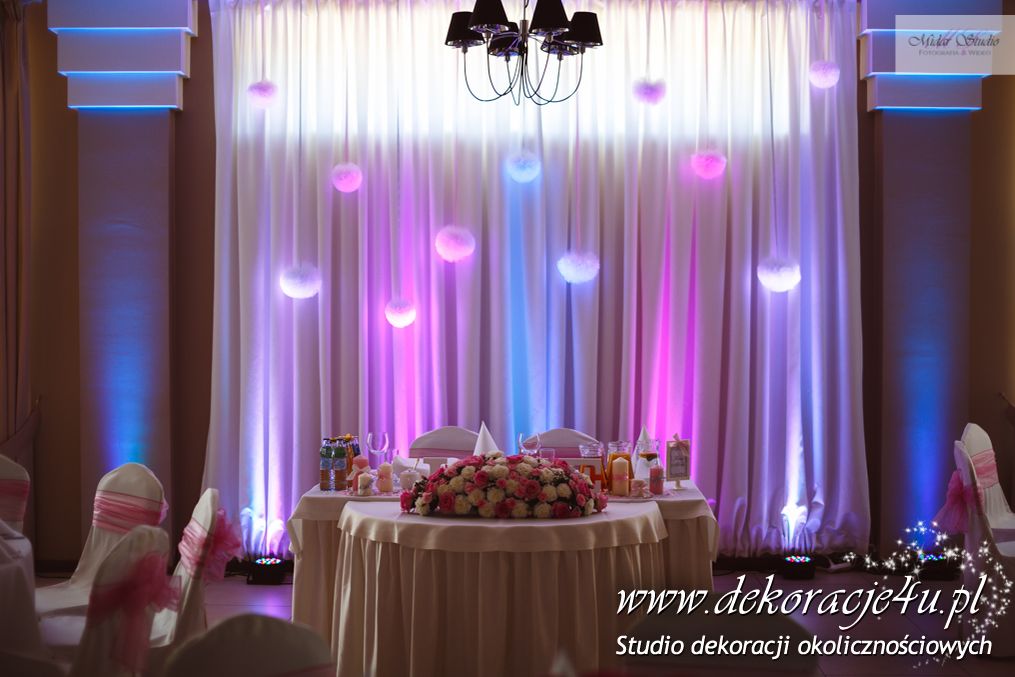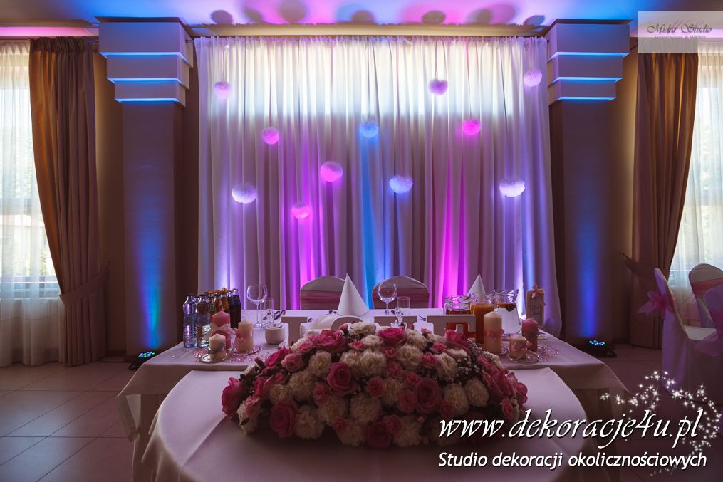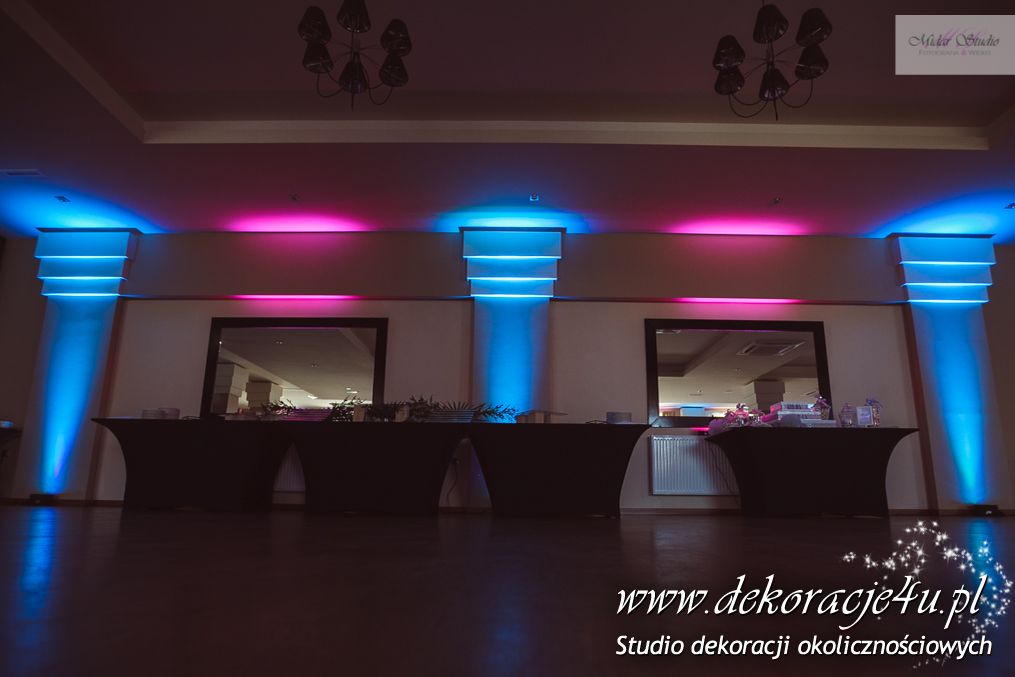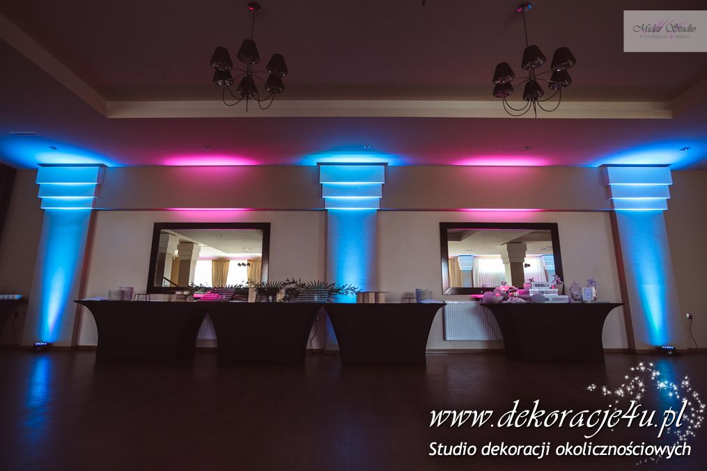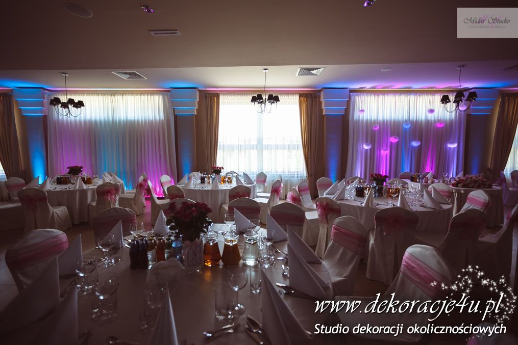 W piękny słoneczny dzień w niedalekiej krainie Dekoracje4u salę weselną przeniosło bajkowy wystrój. Mamy tu na myśli salę weselną Aura Nova w Borku Starym - przygotowaliśmy piękną dekorację światłem. Dodaliśmy bajkowego nastroju całej uroczystości. Młoda Para była zachwycona i wszyscy goście bawili w pięknych kolorach błękitu, różu i fioletu z dodatkiem bieli.