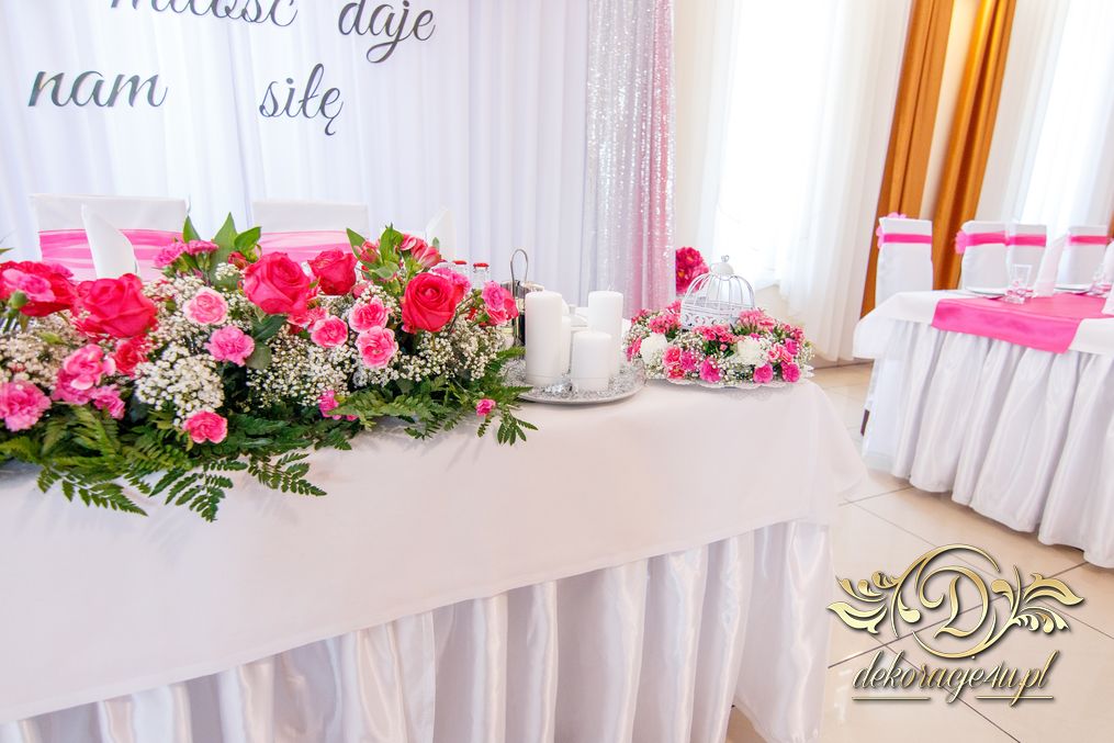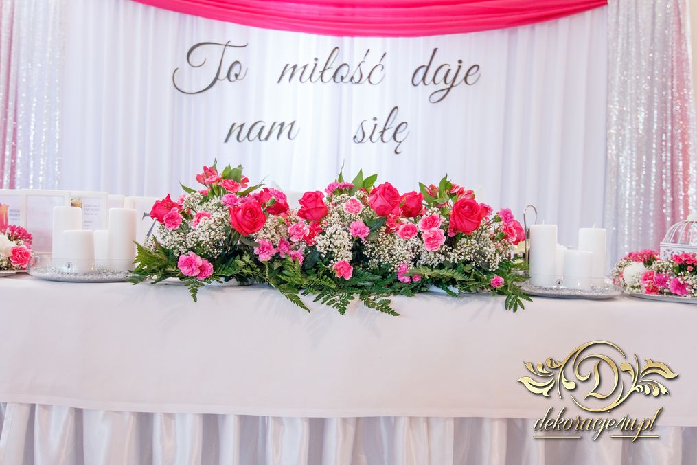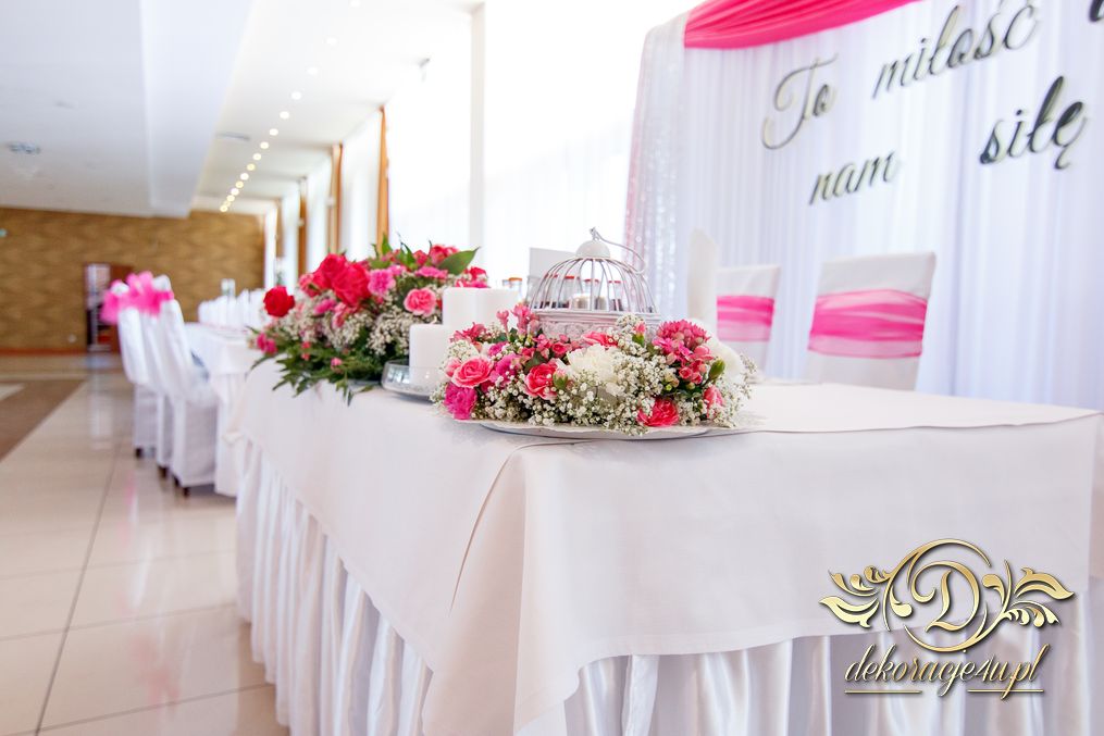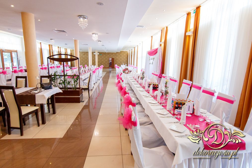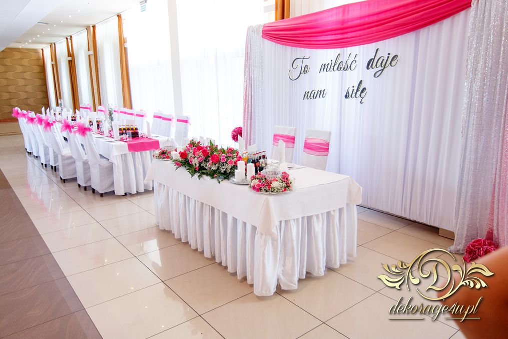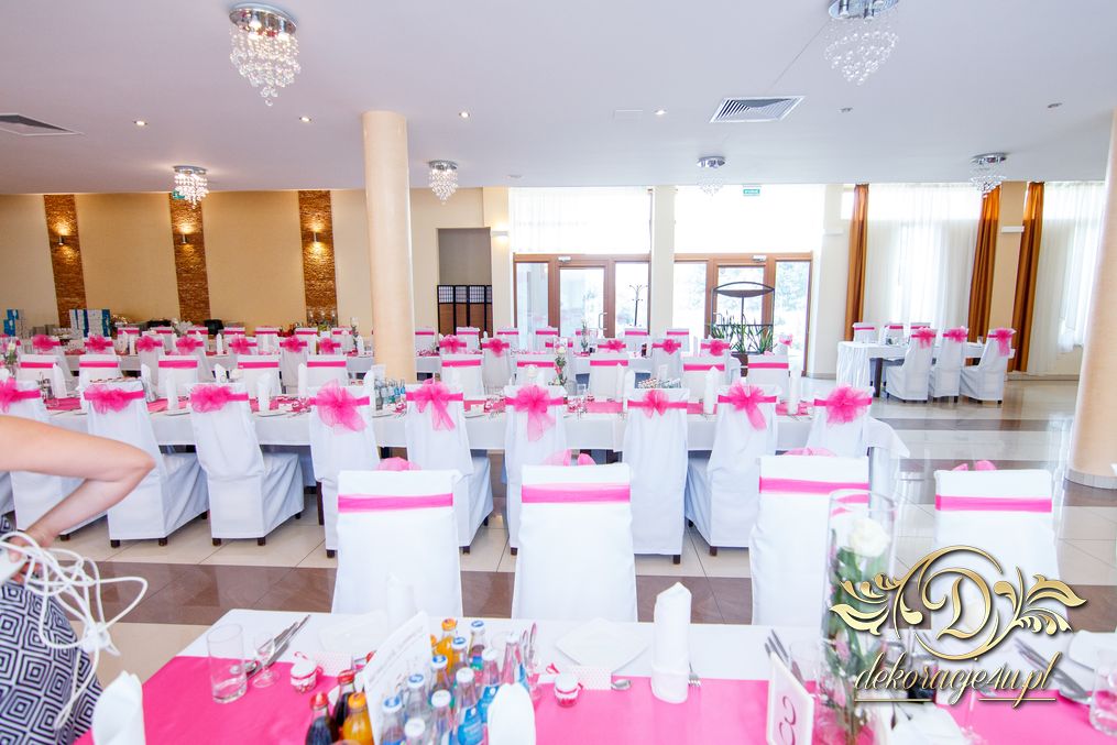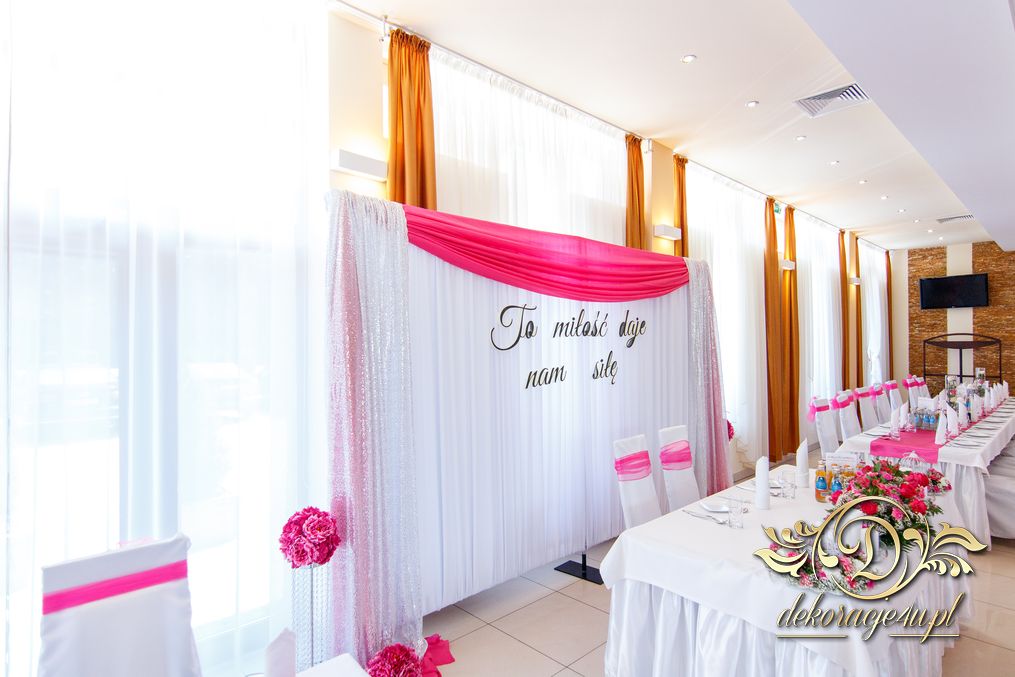Zapewne osoby, które obserwują Nasze realizacje już przypominają sobie że gdzieś to już było. Tak. Targi ślubne w Krośnie - Państwo Młodzi zapragnęli ściankę, która jest unikatowa na weselach - chodzi oczywiście o napis zamiast standardowych imion czy inicjałów. Dodatkowo oczywiście nasze pokrowce na krzesła, szarfa w kolorze różu i balony z helem.