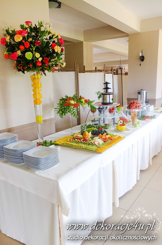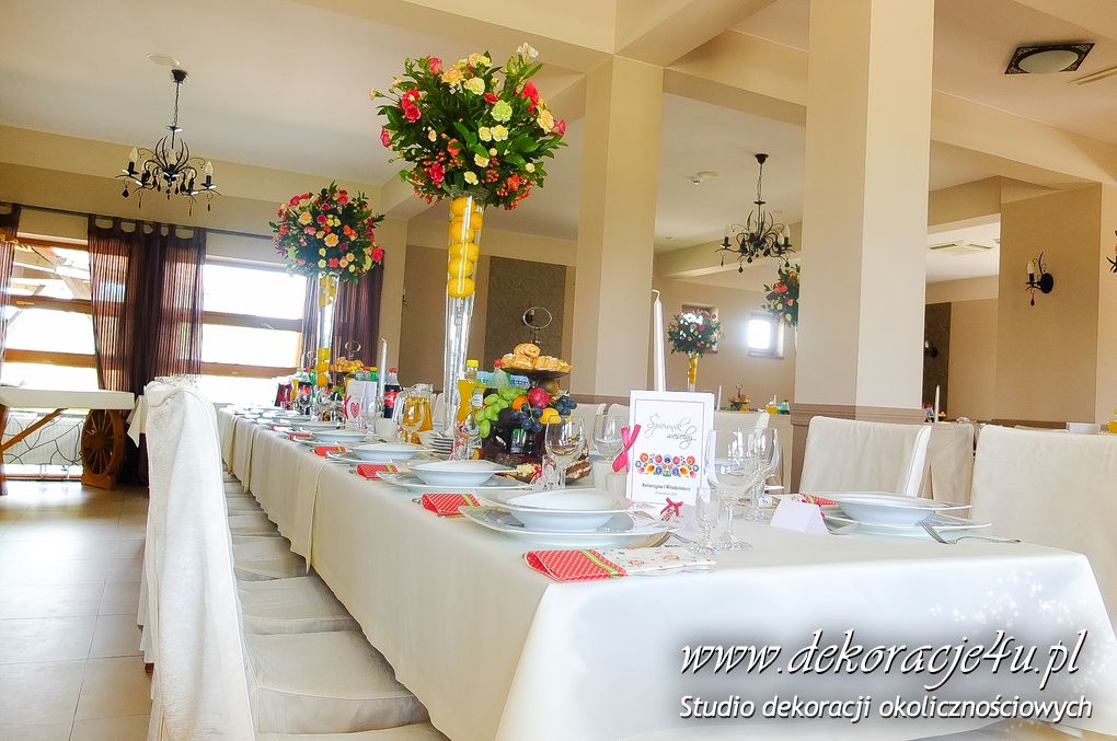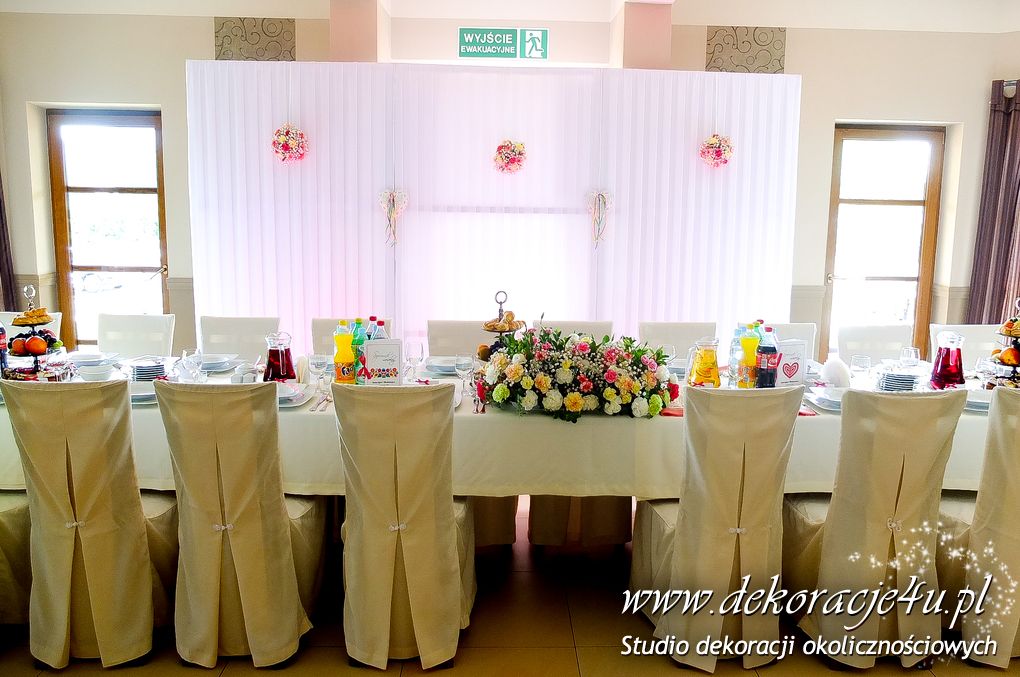 Wspaniała dekoracja w stylu - folkowym - kwiaty kolorowe w wysokich wazonach wypełnionych cytrynami. Ciekawa dekoracja ścianki za Parą Młodych.