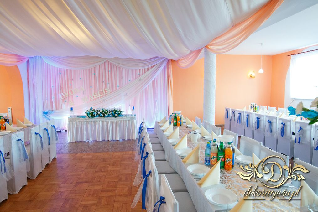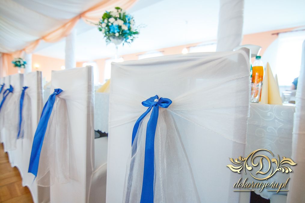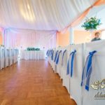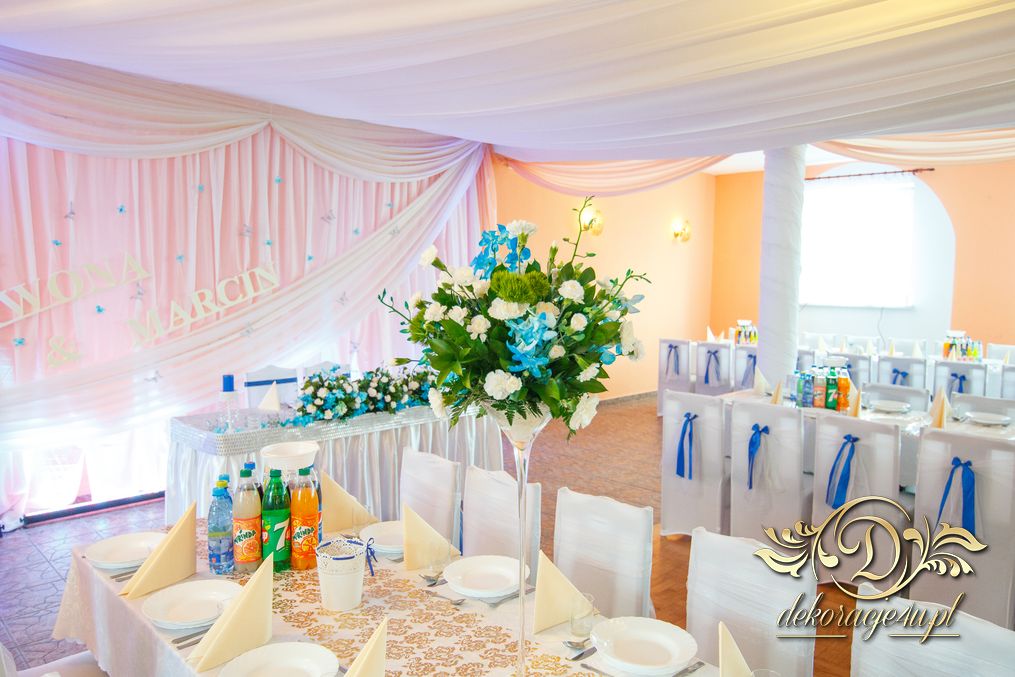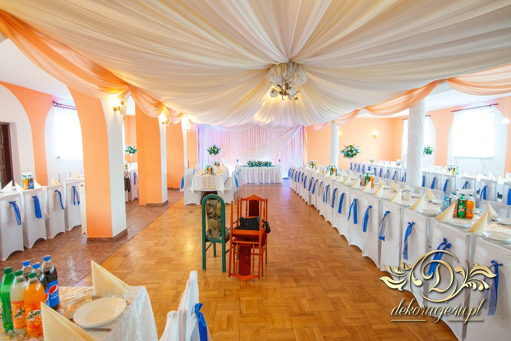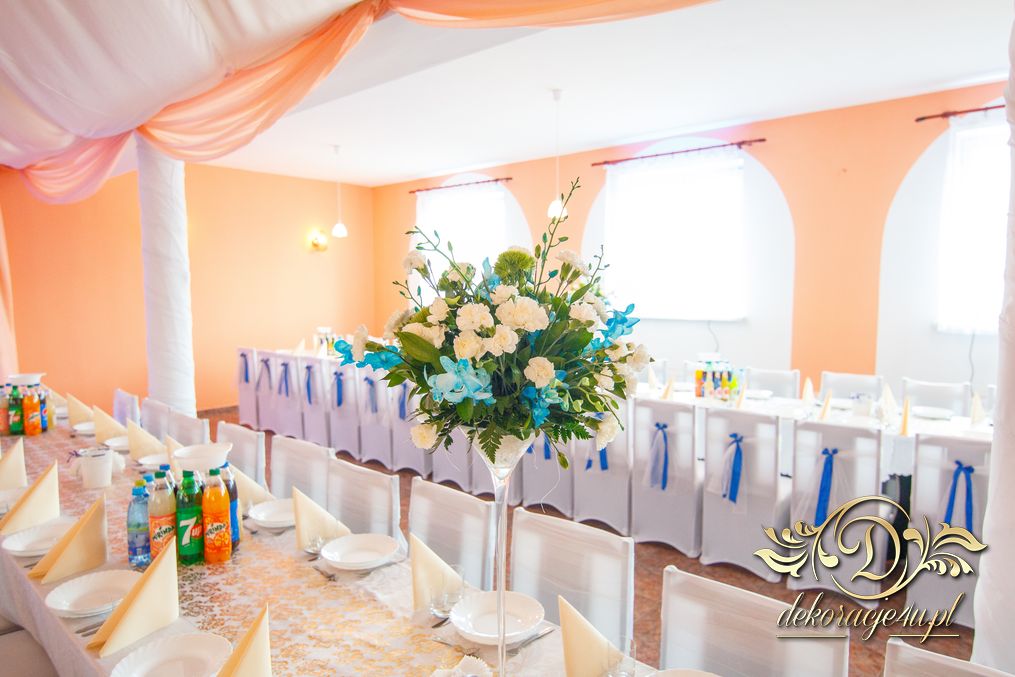 Dekoracje ze storczykami zawsze wygląda cudownie. DO tego oczywiście cudowna Para Młodych na rozpoczęcie sezonu to gwarantuje udany rok. Pokrowce na krzesła elastyczne z kokardą i wstążka. Na stołach wazony z bukietami.
