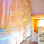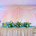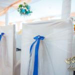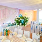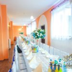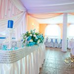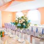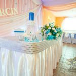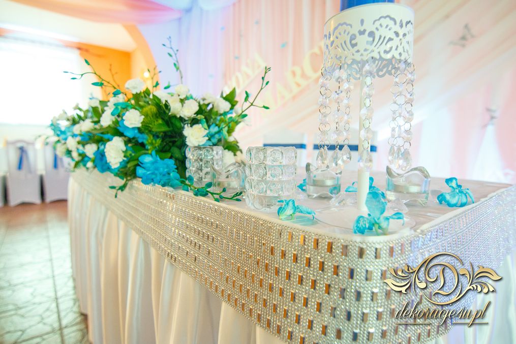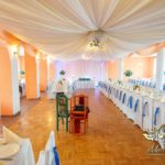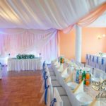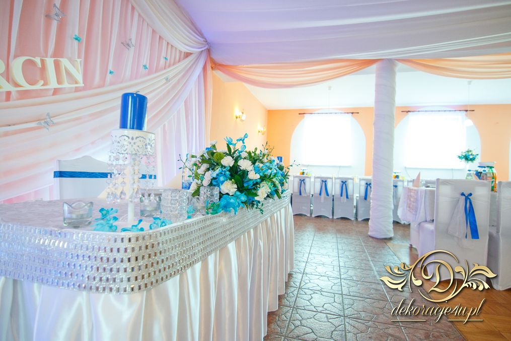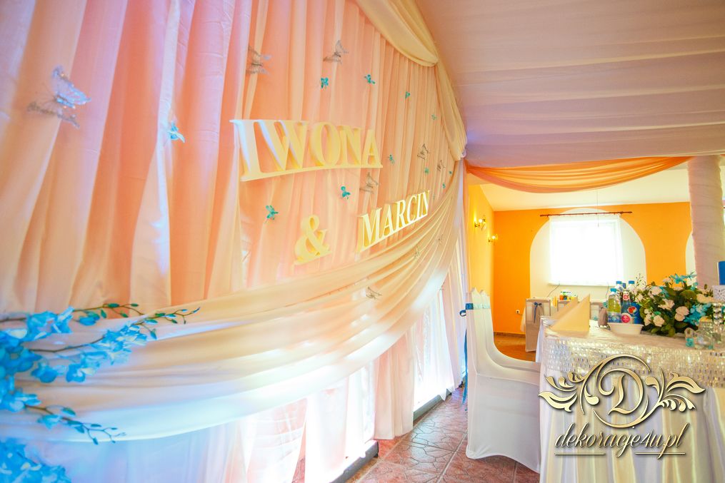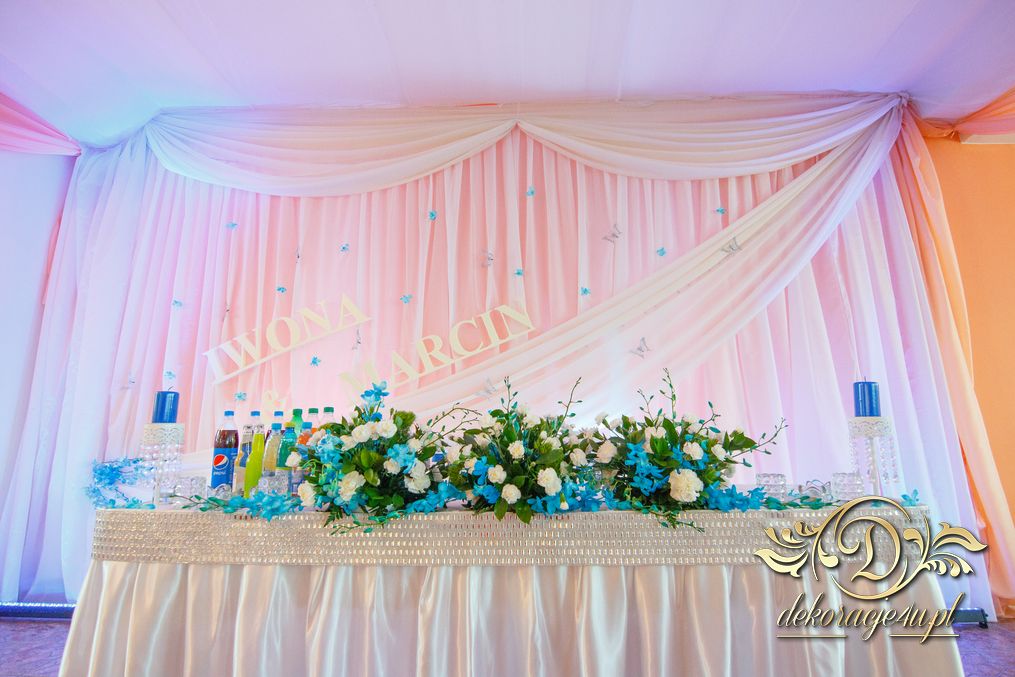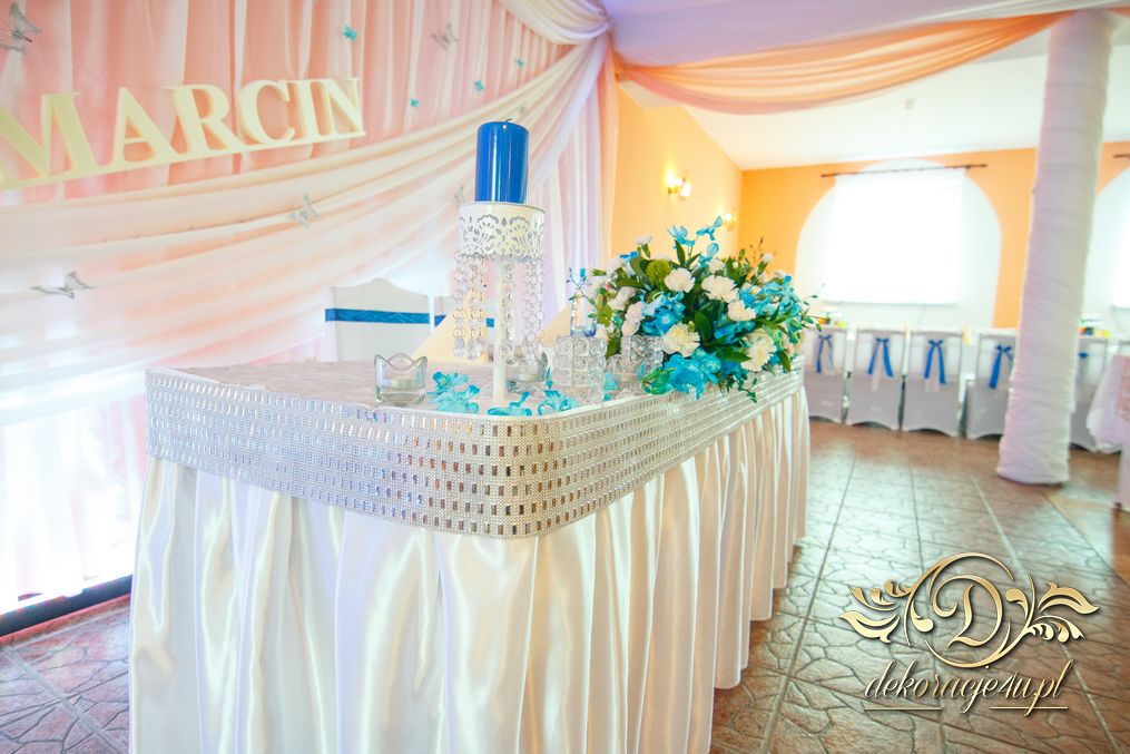 Dekoracje ze storczykami zawsze wygląda cudownie. DO tego oczywiście cudowna Para Młodych na rozpoczęcie sezonu to gwarantuje udany rok. Pokrowce na krzesła elastyczne z kokardą i wstążka. Na stołach wazony z bukietami.