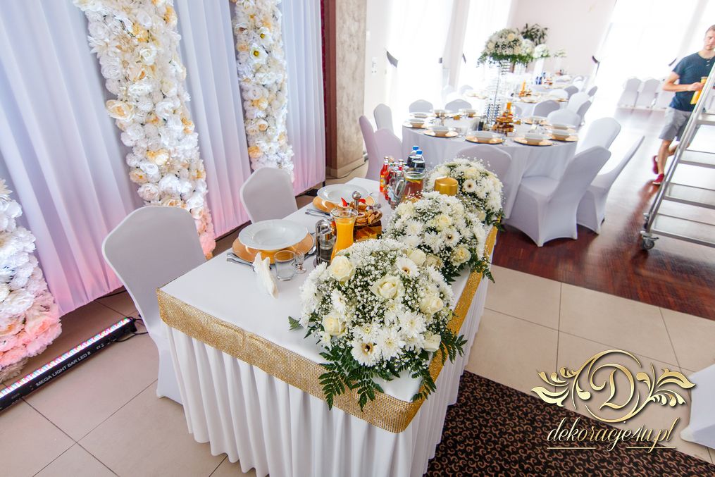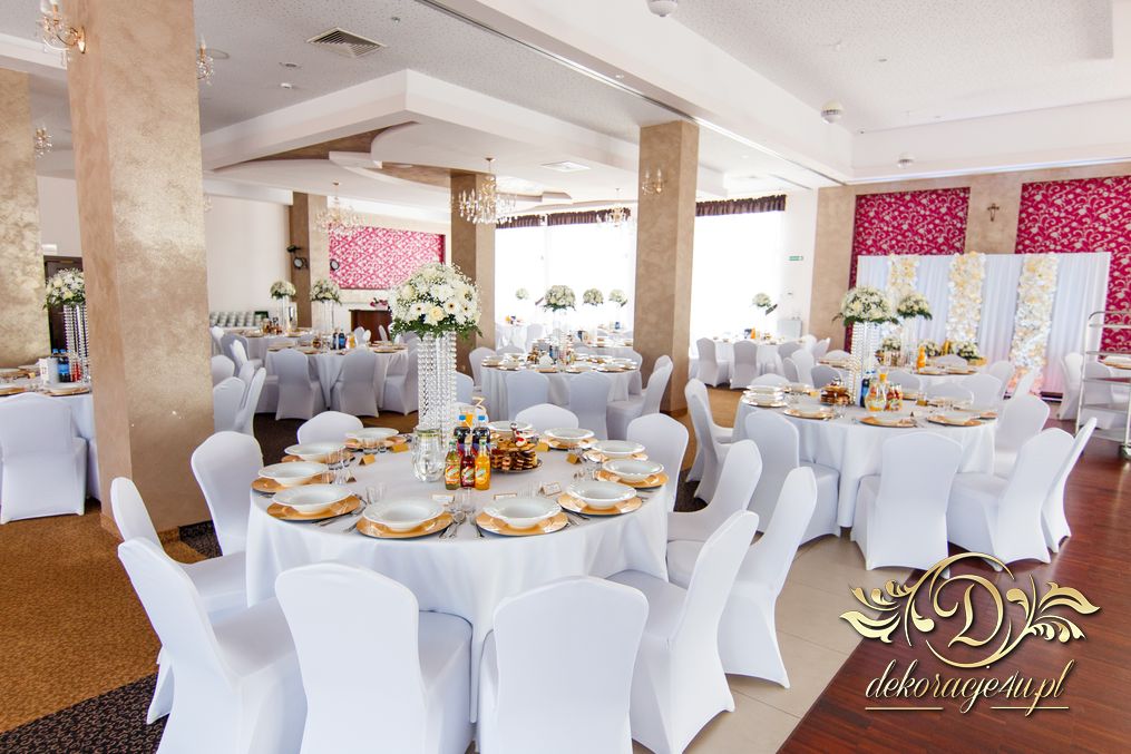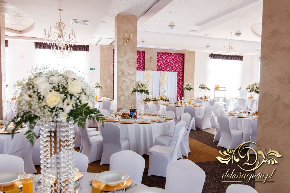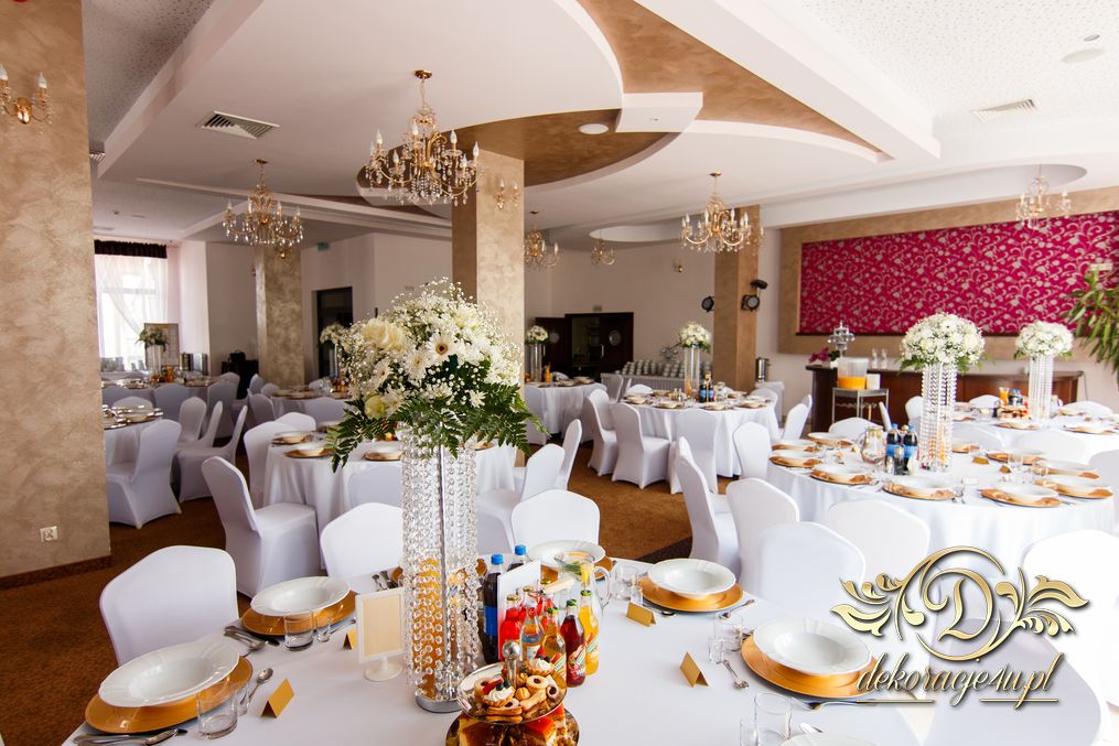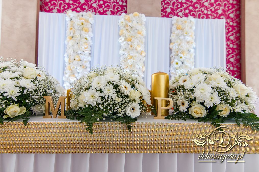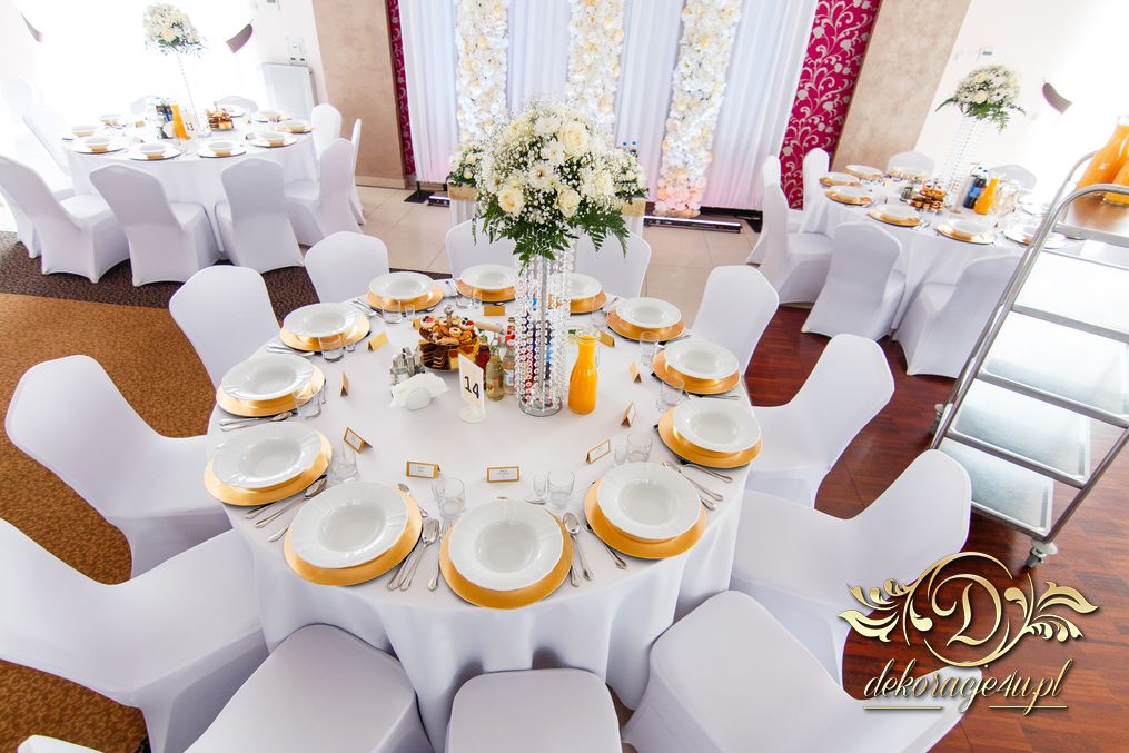 Biała ścianka z trzema pasami kwiatów materiałowych. Na stołach dla gości wazony z diamentami i pięknymi bukietami. Dodatkowo nie mogła zabraknąć złotych podtalerzy.