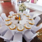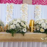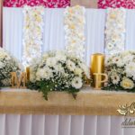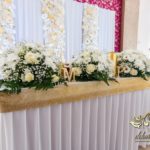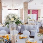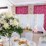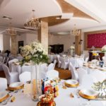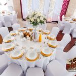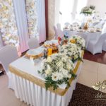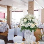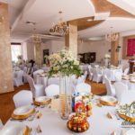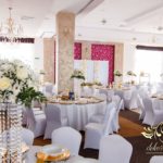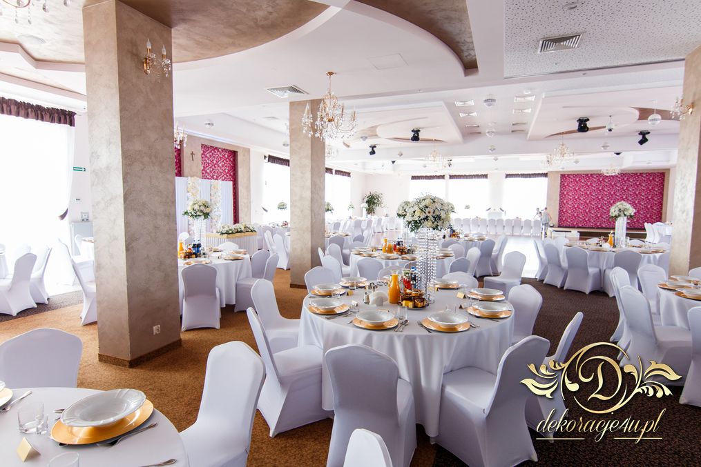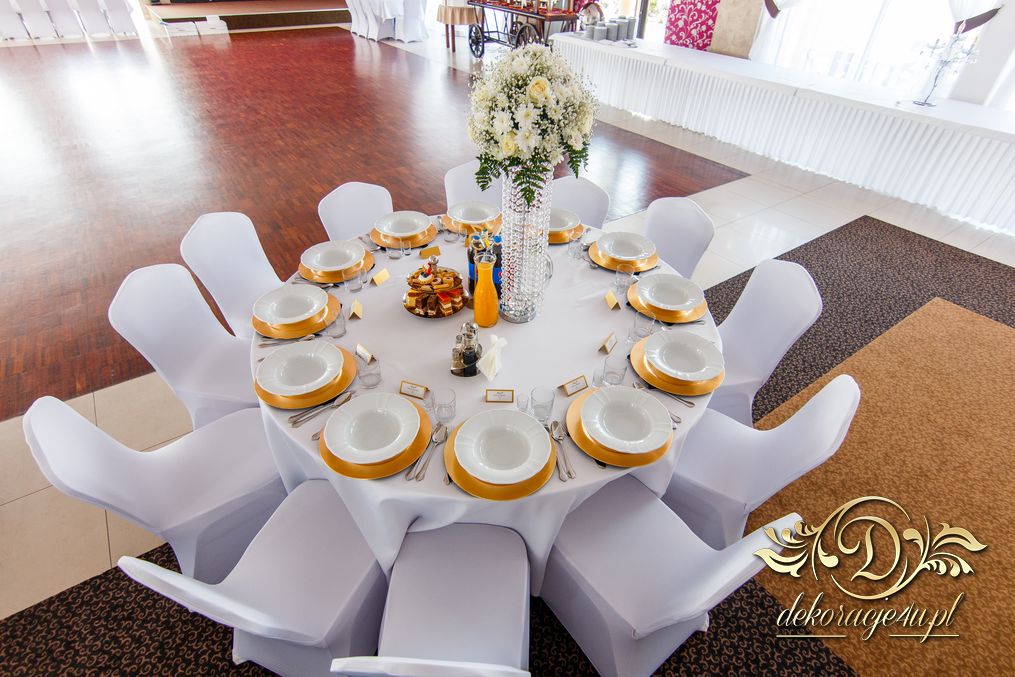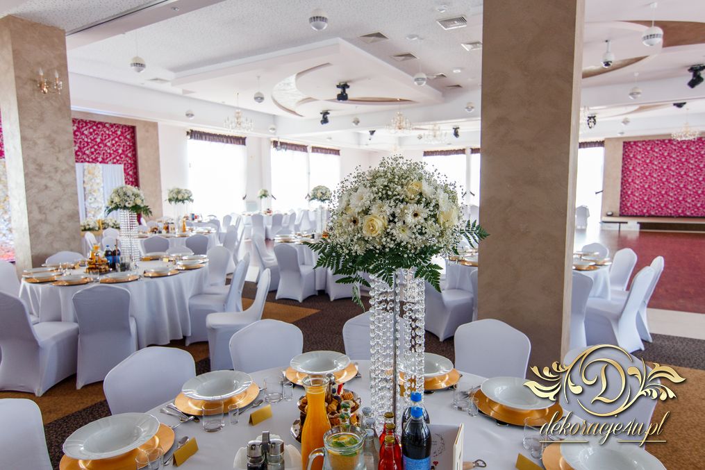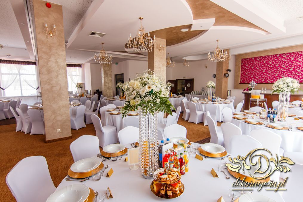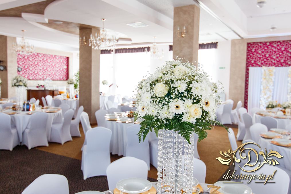 Biała ścianka z trzema pasami kwiatów materiałowych. Na stołach dla gości wazony z diamentami i pięknymi bukietami. Dodatkowo nie mogła zabraknąć złotych podtalerzy.