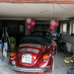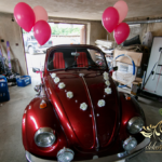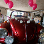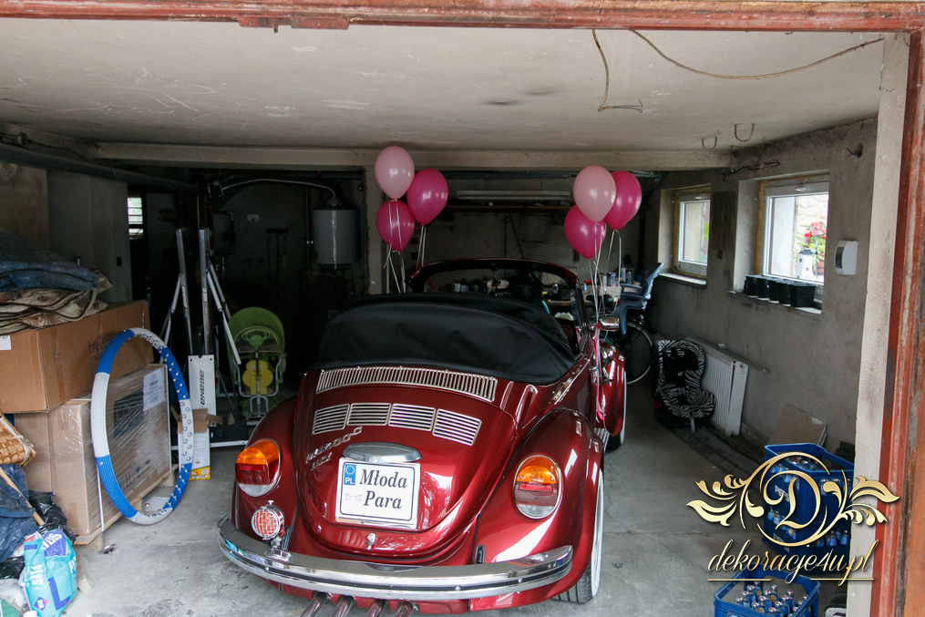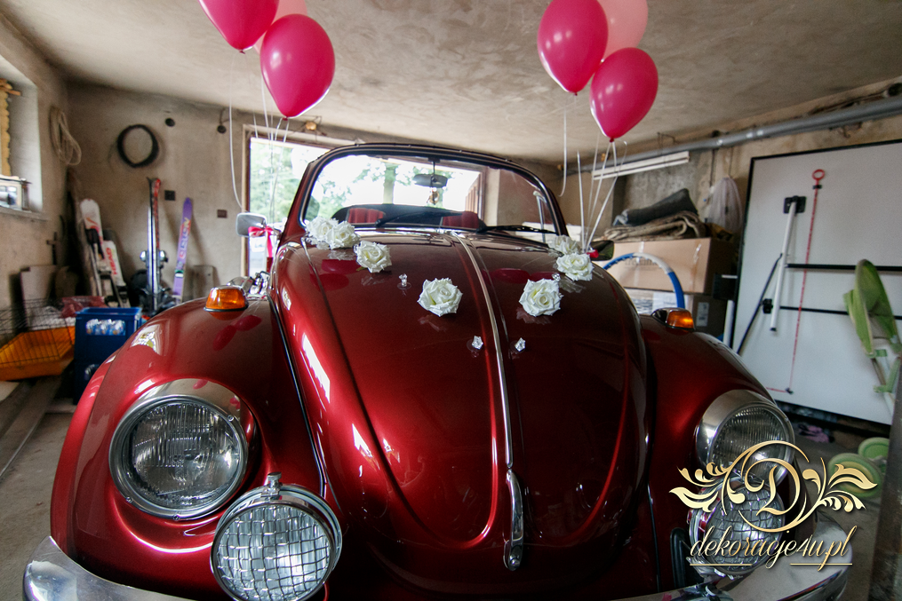 Subtelna dekoracja zabytkowego pojazdu z balonami helowymi i kwiatami na masce.