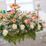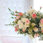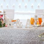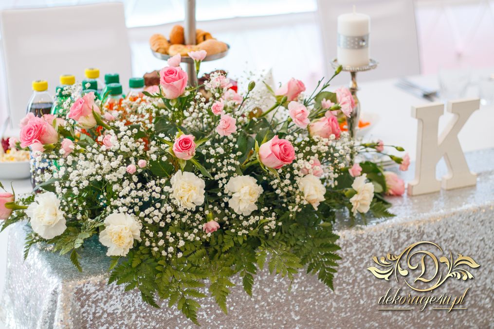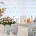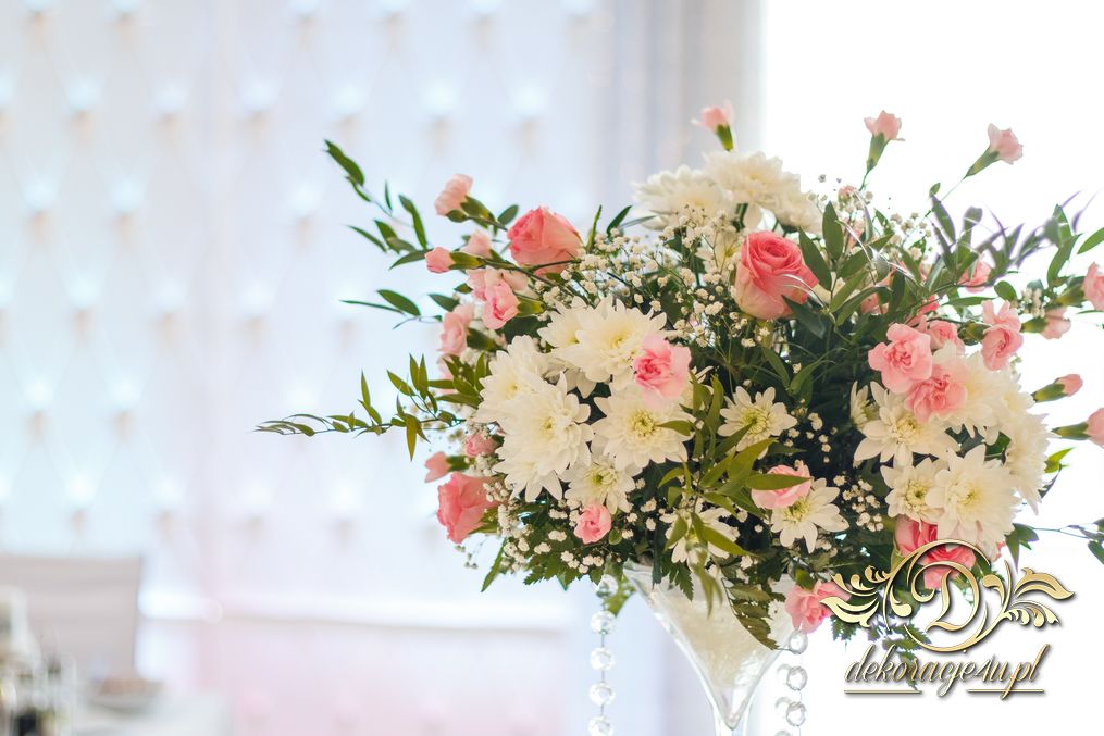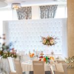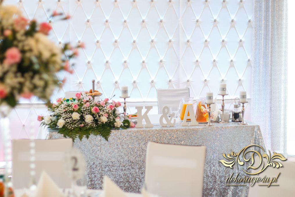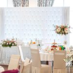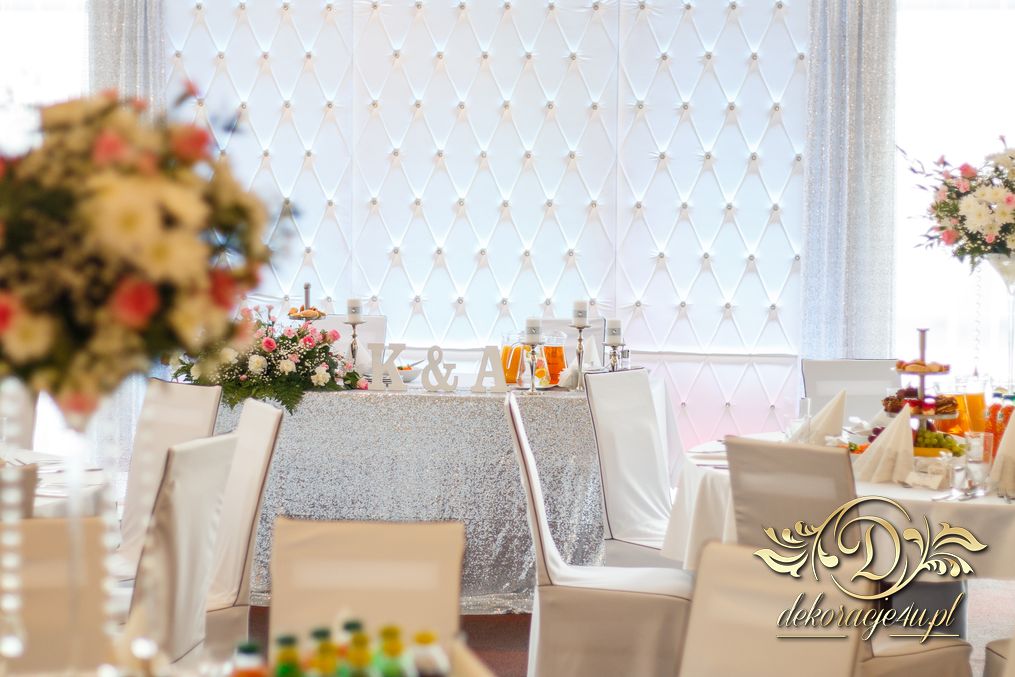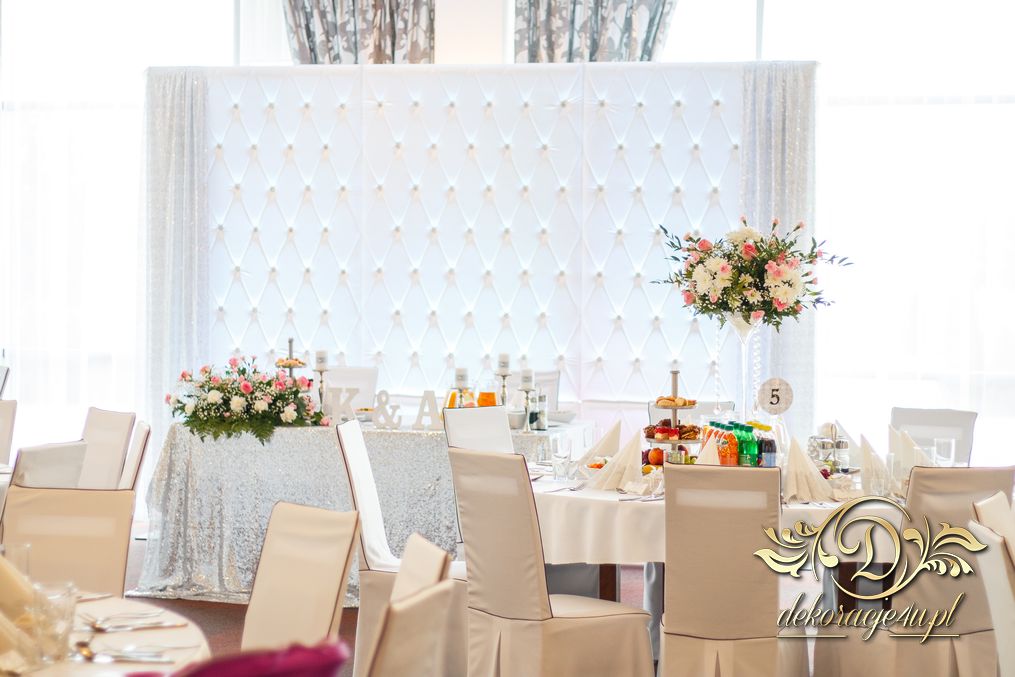 Na sali bukiety dla gości weselnych i ścianka pikowana za Młodymi.
