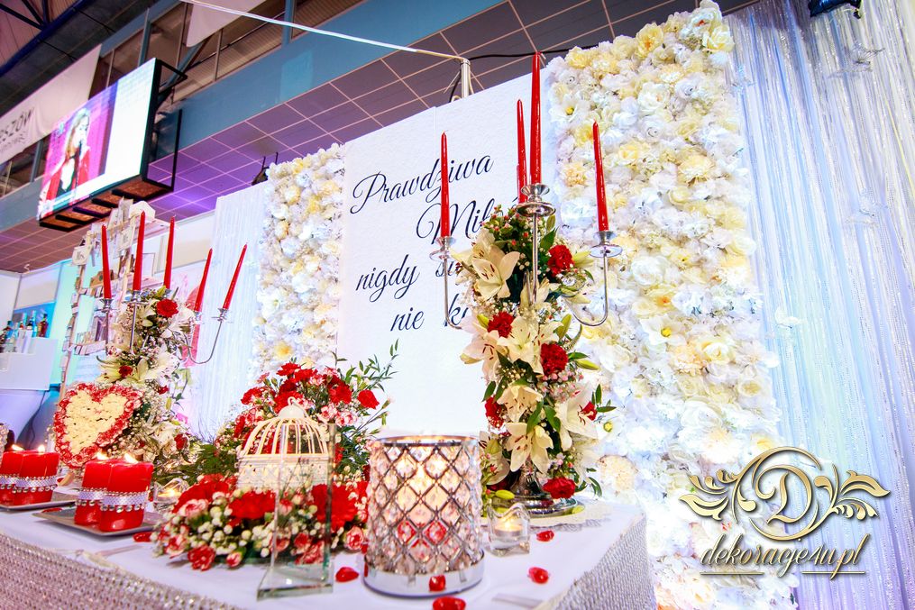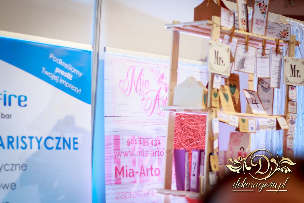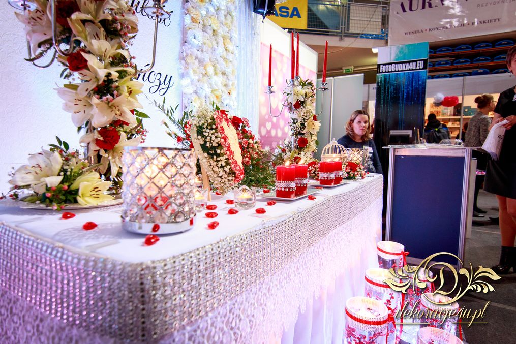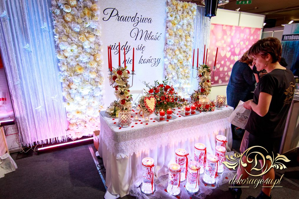 XI Targi Ślubne w Rzeszowie już za nami. Tym razem przedstawiliśmy nowości o których dużo było wspominane. Ścianka z kwiatów, ścianka z wzorem itp. Przed stołem piękne tubu z kwiatami i podświetleniem ledowym. Na stole nie zabrakło świeczek - nierozłączny element każdej dekoracji. Napis na ściance według nowej metody 🙂 szybki i w każdym kolorze. Bukiet na stoły główne na świecznikach zaczynający się na górze ciągnącym się ku dołowi. Na stanowisku oczywiście nie zabrakło Fotobudka4u.eu, Zaproszeń Mia-Arto i Blue-Fire 🙂