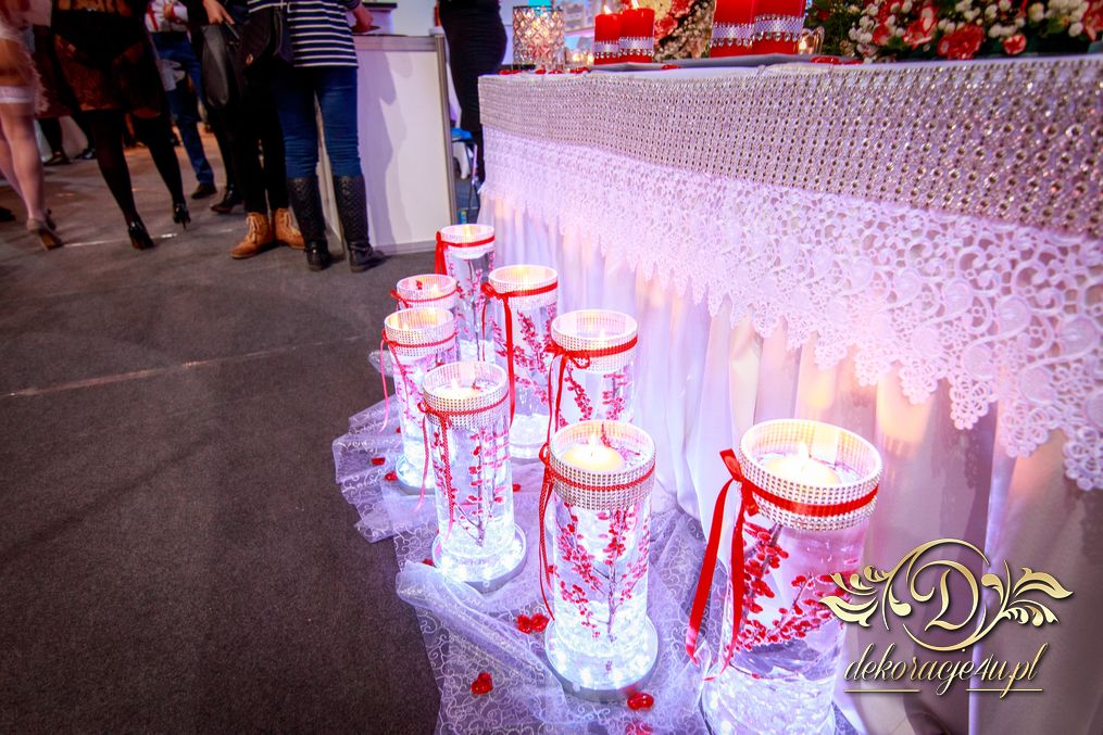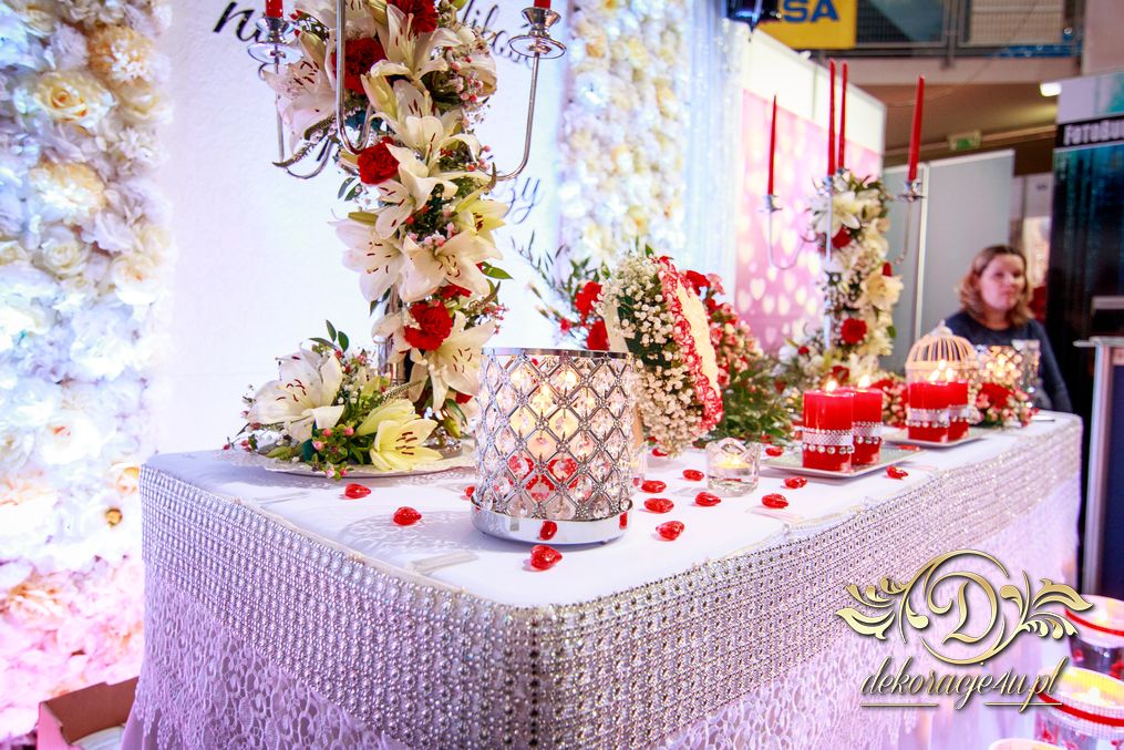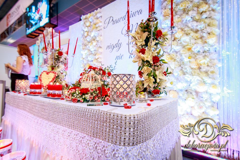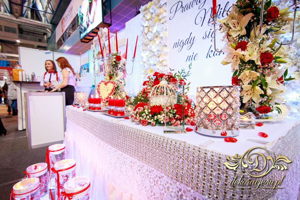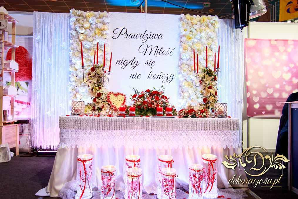 XI Targi Ślubne w Rzeszowie już za nami. Tym razem przedstawiliśmy nowości o których dużo było wspominane. Ścianka z kwiatów, ścianka z wzorem itp. Przed stołem piękne tubu z kwiatami i podświetleniem ledowym. Na stole nie zabrakło świeczek - nierozłączny element każdej dekoracji. Napis na ściance według nowej metody 🙂 szybki i w każdym kolorze. Bukiet na stoły główne na świecznikach zaczynający się na górze ciągnącym się ku dołowi. Na stanowisku oczywiście nie zabrakło Fotobudka4u.eu, Zaproszeń Mia-Arto i Blue-Fire 🙂